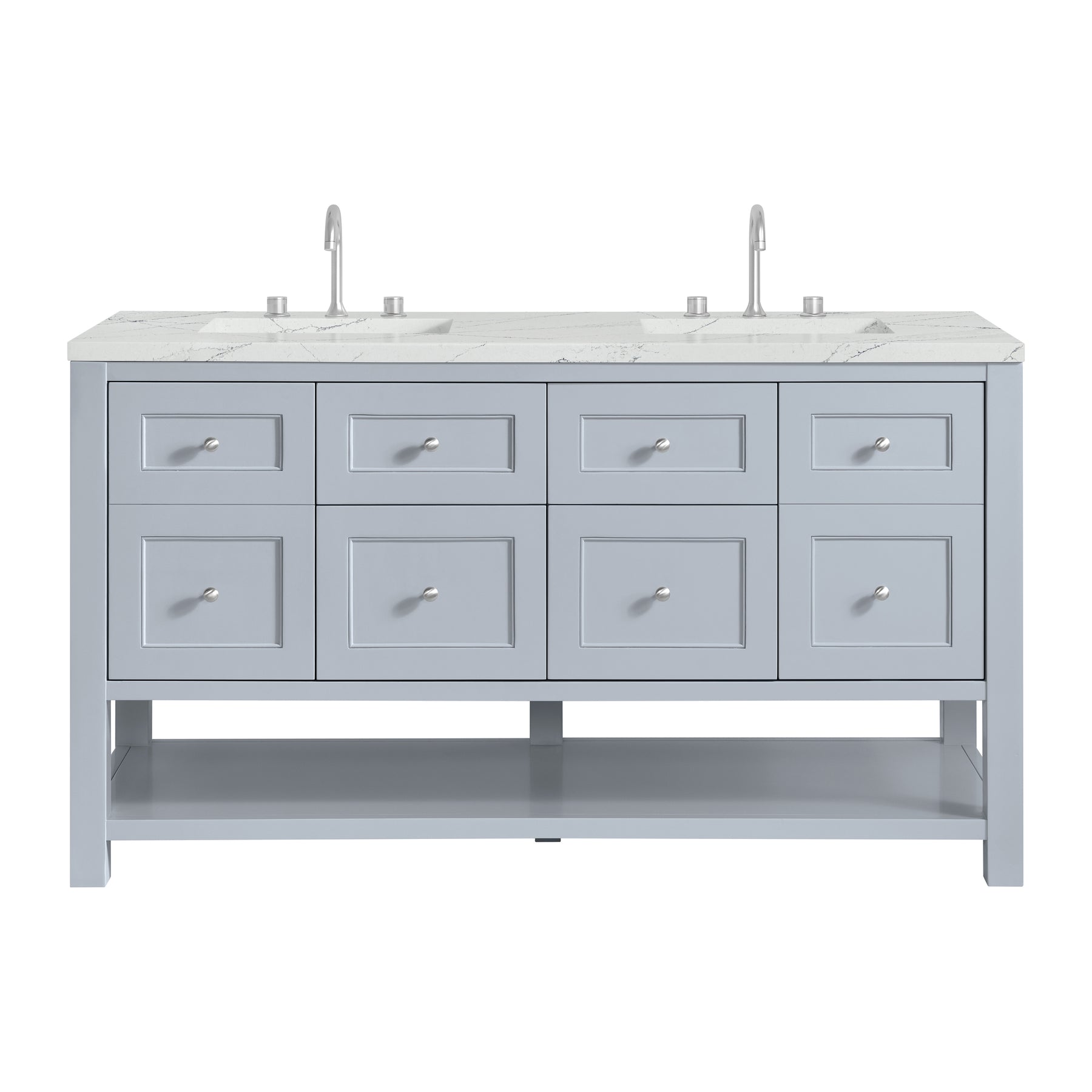 The Breckenridge 60" Double Vanity is a fresh take on traditional Mission furniture that easily transitions to Modern Farmhouse style with an air of understated sophistication. Satin Nickel knobs complement the Serenity Blue finish, while the neatly inset door and drawer fronts lend a fresh appeal to this clean-lined classic. Two single-door cabinets open to reveal interior shelves equipped with a convenient built-in USB/120V power outlet. This console-style vanity also features two top-row tip-out drawers, two standard full-extension drawers, and an open lower shelf for additional storage. A stunning Ethereal Noctis Silestone top with undermount sinks completes the look.
