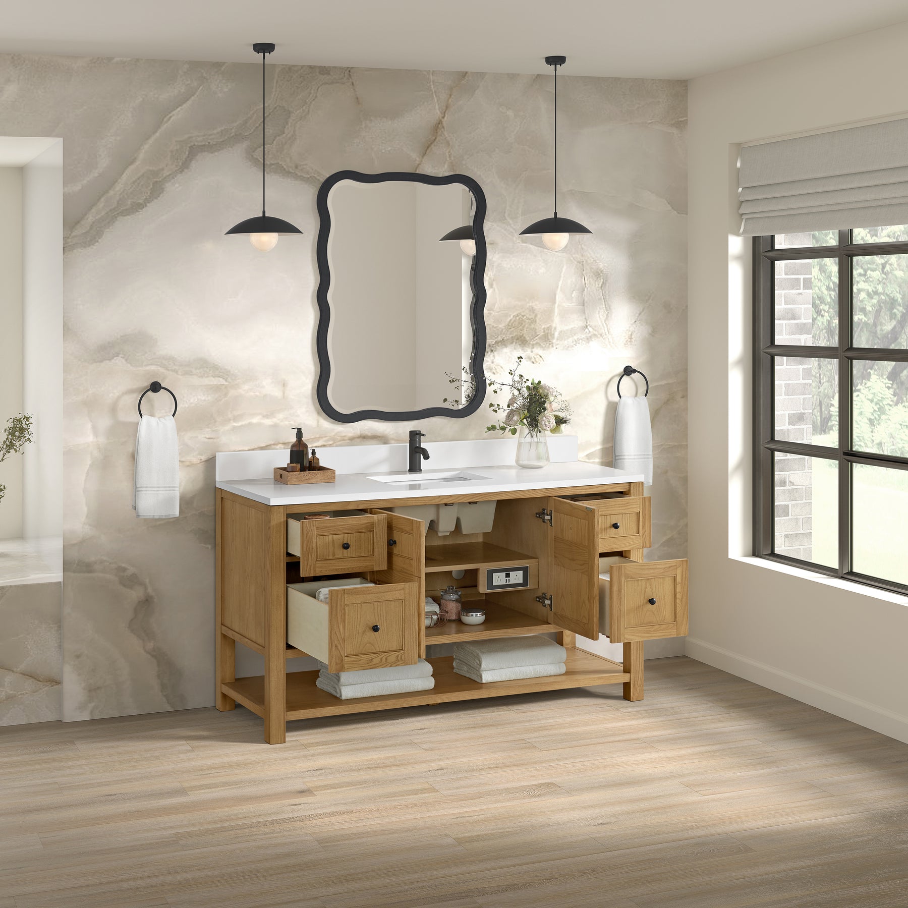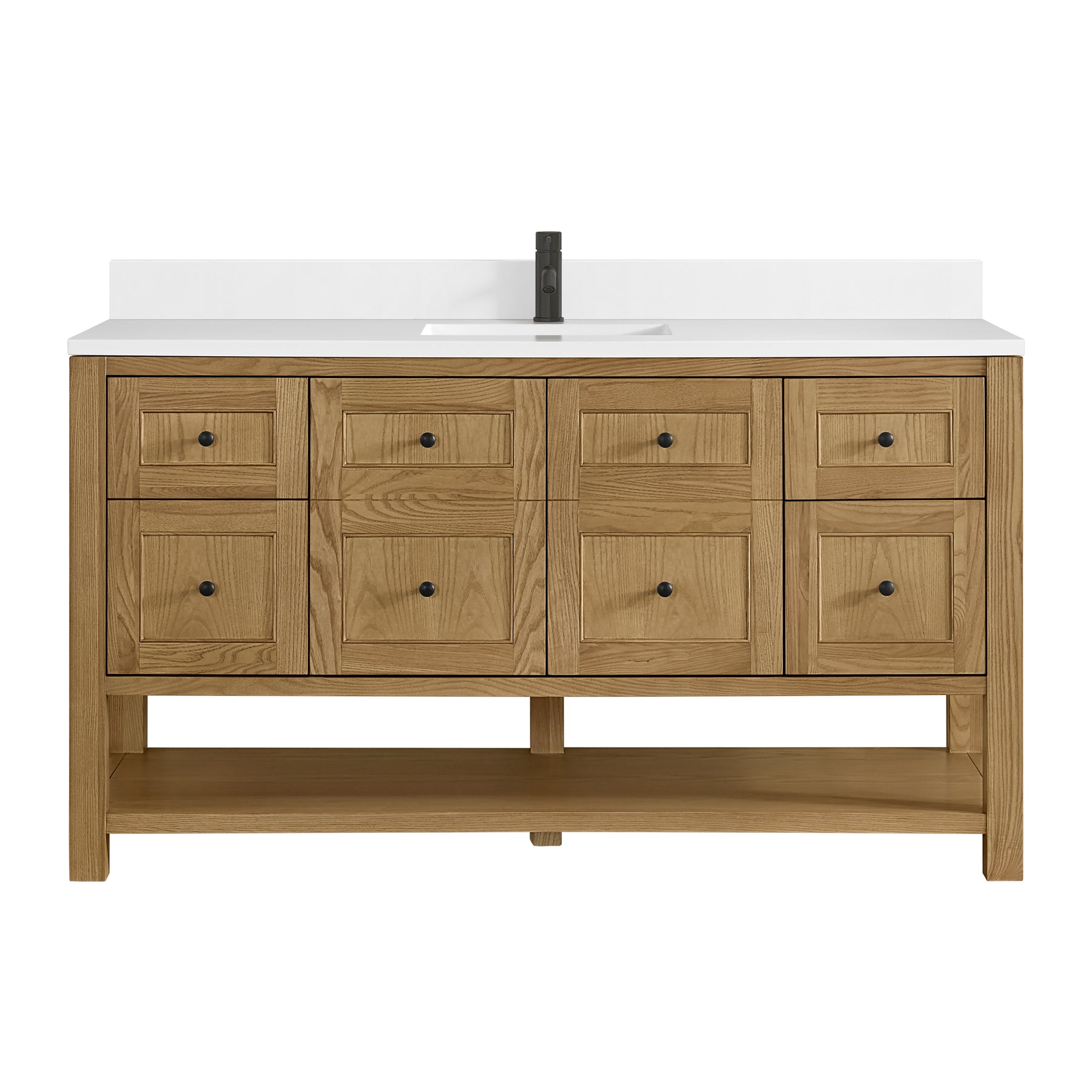 The Breckenridge 60" Single Vanity is a fresh take on traditional Mission furniture that easily transitions to Modern Farmhouse style with an air of understated sophistication. Matte Black knobs complement the Light Natural Oak finish, while the neatly inset door and drawer fronts lend a fresh appeal to this clean-lined classic. A two-door cabinet opens to reveal an interior shelf equipped with convenient built-in USB/120V power outlet. This console-style vanity also features four full-extension drawers and an open lower shelf for additional storage. A single-hole faucet White Zeus Silestone top with undermount sink and backsplash complete the look with a contemporary touch.