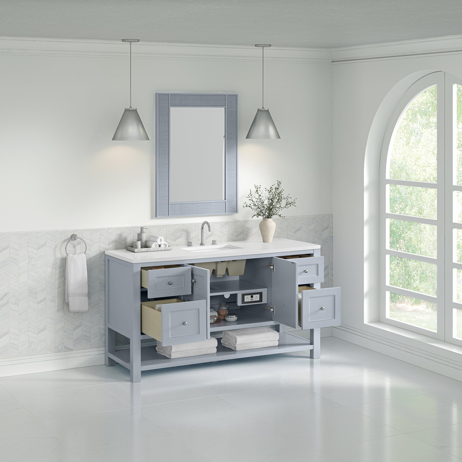 The Breckenridge 60" Single Vanity is a fresh take on traditional Mission furniture that easily transitions to Modern Farmhouse style with an air of understated sophistication. Satin Nickel knobs complement the Serenity Blue finish, while the neatly inset door and drawer fronts lend a fresh appeal to this clean-lined classic. A two-door cabinet opens to reveal an interior shelf equipped with convenient built-in USB/120V power outlet. This console-style vanity also features four full-extension drawers and an open lower shelf for additional storage. A classic White Zeus Silestone top with undermount sink completes the look.