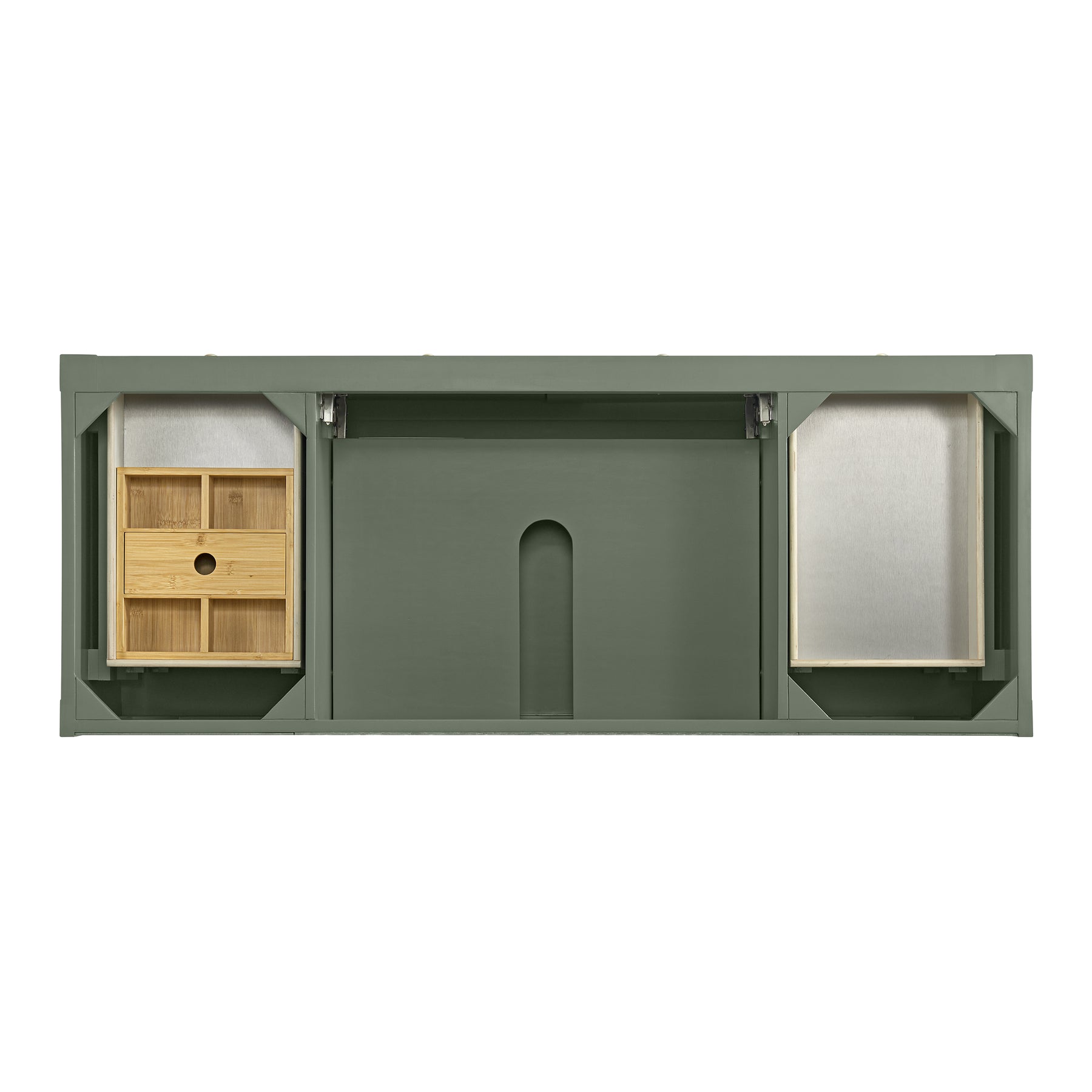 The Breckenridge 60" Single Vanity is a fresh take on traditional Mission furniture that easily transitions to Modern Farmhouse style with an air of understated sophistication. Champagne Brass knobs complement the Smokey Celadon finish, while the neatly inset door and drawer fronts lend a fresh appeal to this clean-lined classic. A two-door cabinet opens to reveal an interior shelf equipped with convenient built-in USB/120V power outlet. This console-style vanity also features four full-extension drawers and an open lower shelf for additional storage. A stunning Ethereal Noctis Silestone top with undermount sink completes the look.