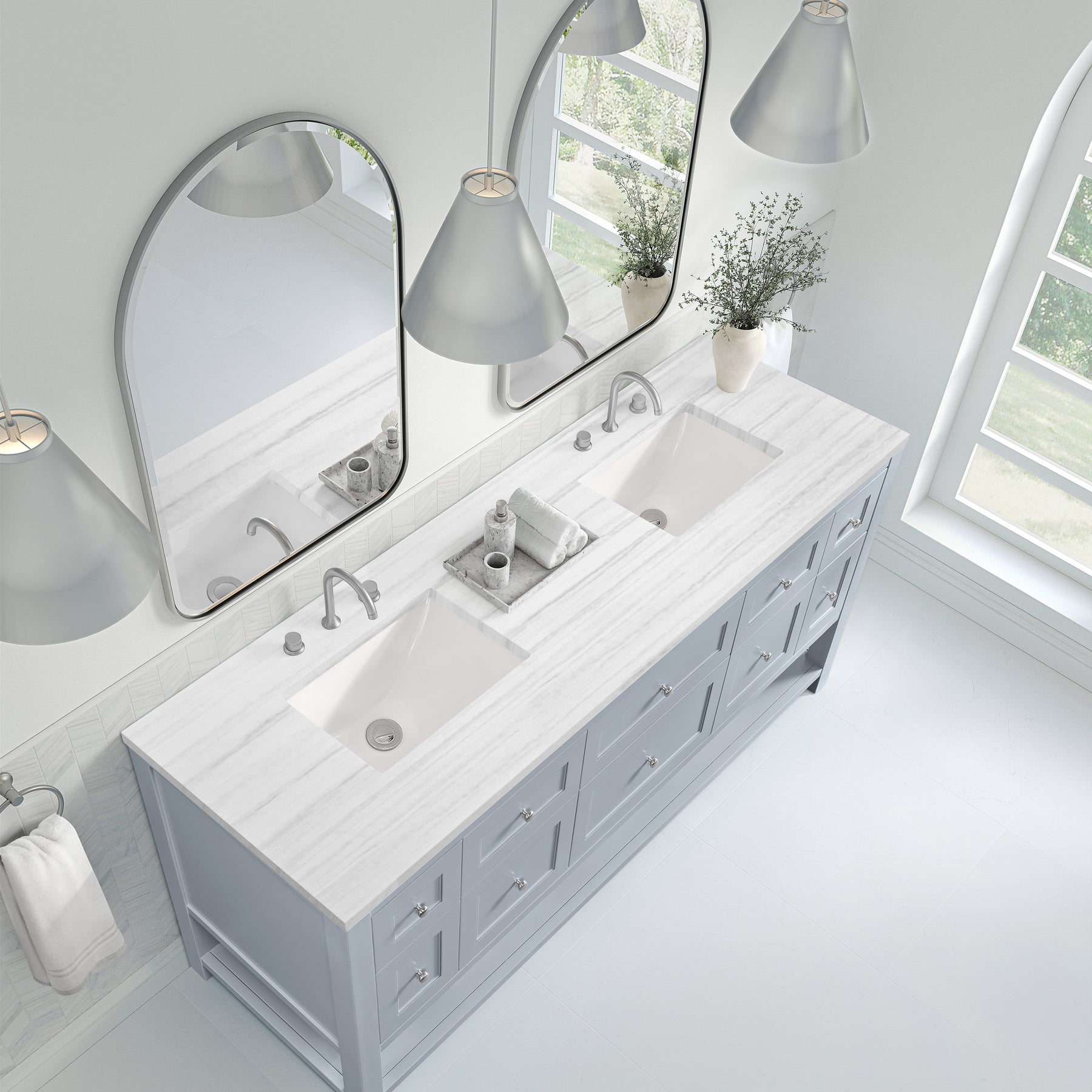 The Breckenridge 72" Double Vanity is a fresh take on traditional Mission furniture that easily transitions to Modern Farmhouse style with an air of understated sophistication. Satin Nickel knobs complement the Serenity Blue finish, while the neatly inset door and drawer fronts lend a fresh appeal to this clean-lined classic. Two single-door cabinets open to reveal interior shelves equipped with a convenient built-in USB/120V power outlet. This console-style vanity also features six full-extension drawers and an open lower shelf for additional storage. A modern Arctic Fall Solid Surface top with undermount sinks completes the look.
