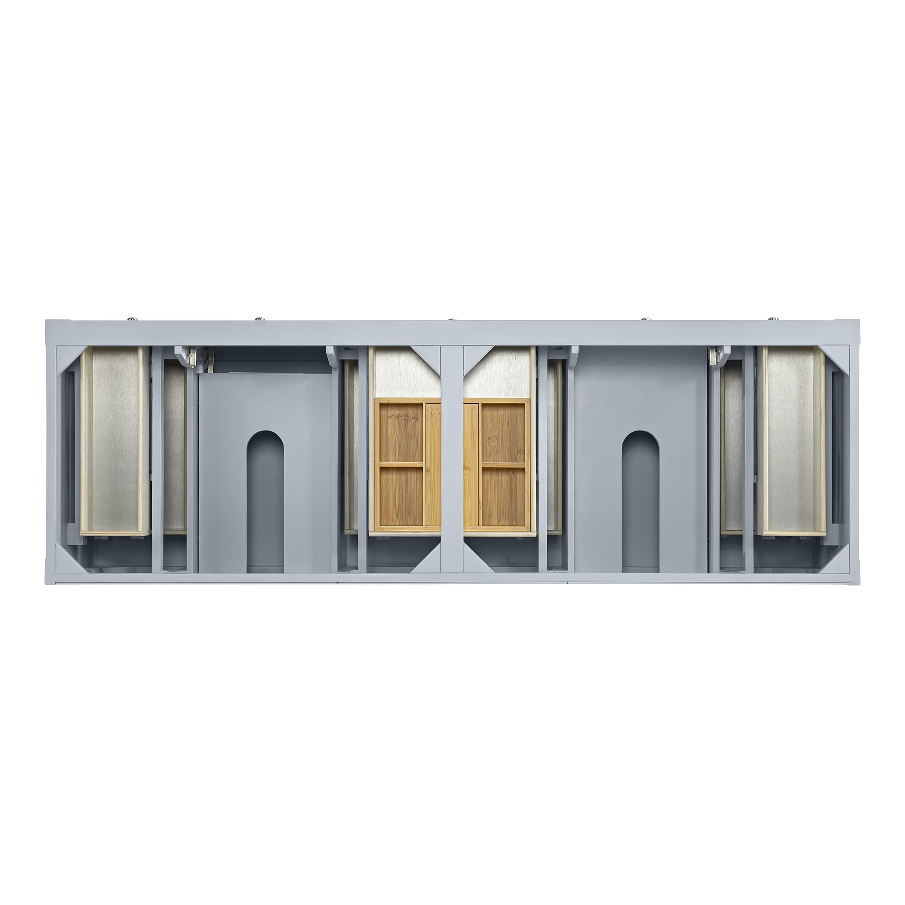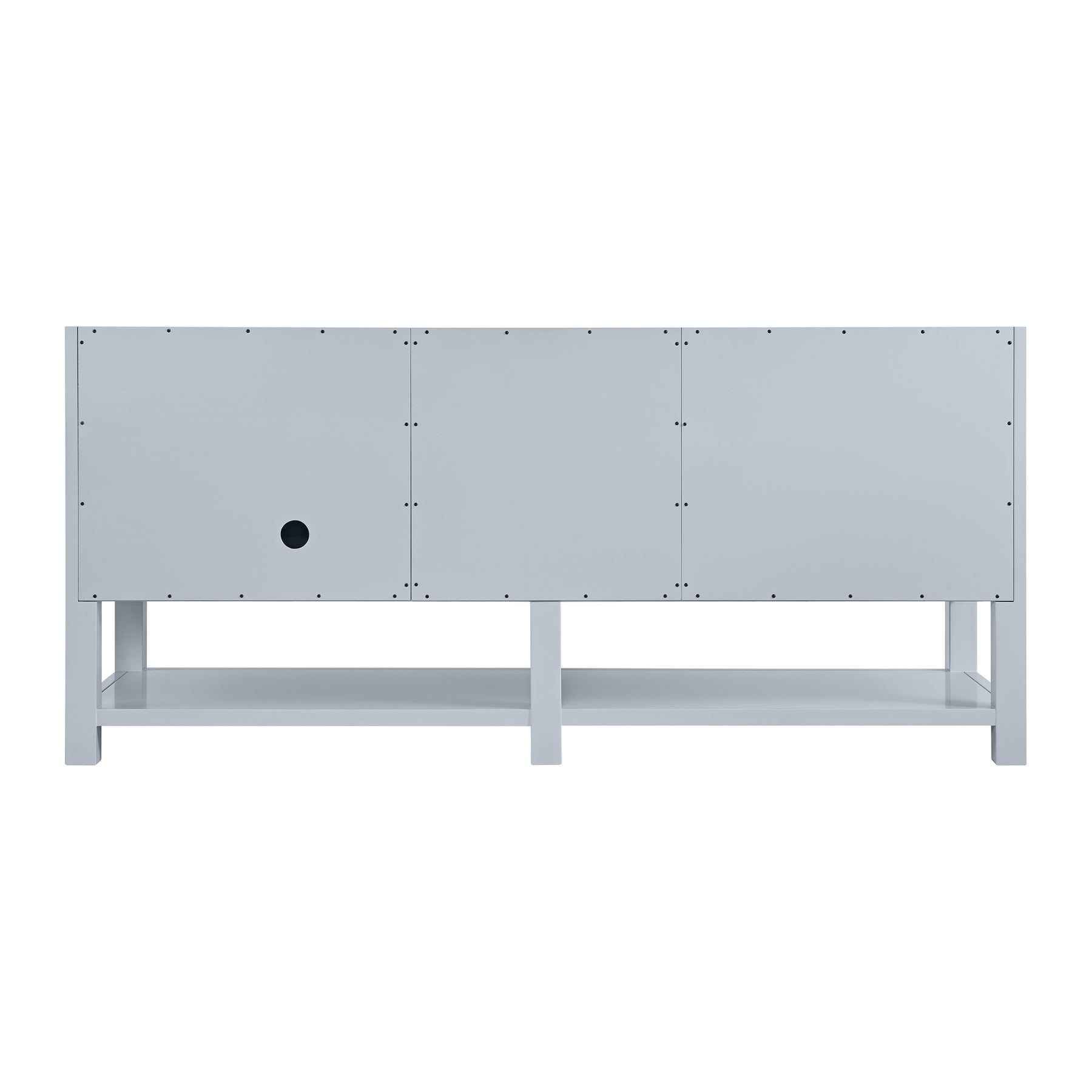 The Breckenridge 72" Double Vanity is a fresh take on traditional Mission furniture that easily transitions to Modern Farmhouse style with an air of understated sophistication. Satin Nickel knobs complement the Serenity Blue finish, while the neatly inset door and drawer fronts lend a fresh appeal to this clean-lined classic. Two single-door cabinets open to reveal interior shelves equipped with a convenient built-in USB/120V power outlet. This console-style vanity also features six full-extension drawers and an open lower shelf for additional storage. A stunning Ethereal Noctis Silestone top with undermount sinks completes the look.