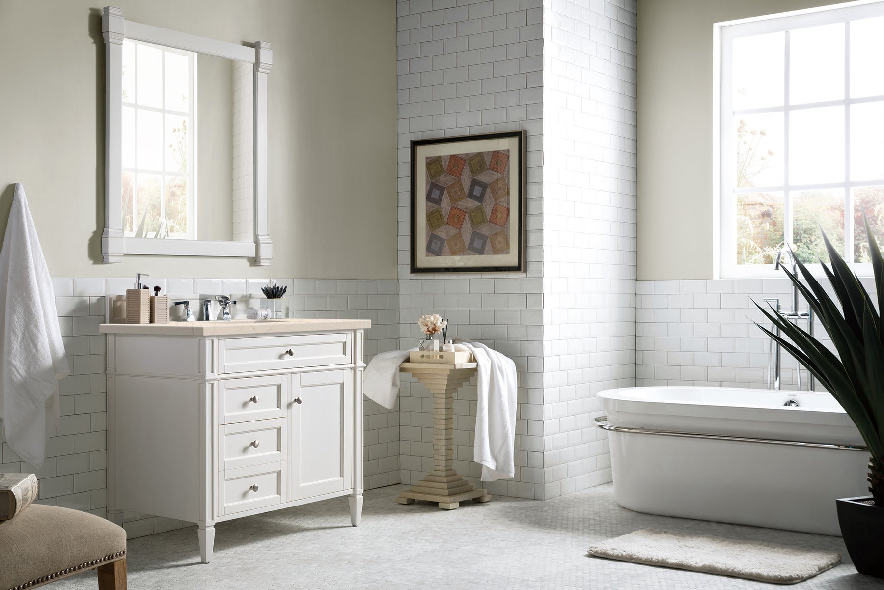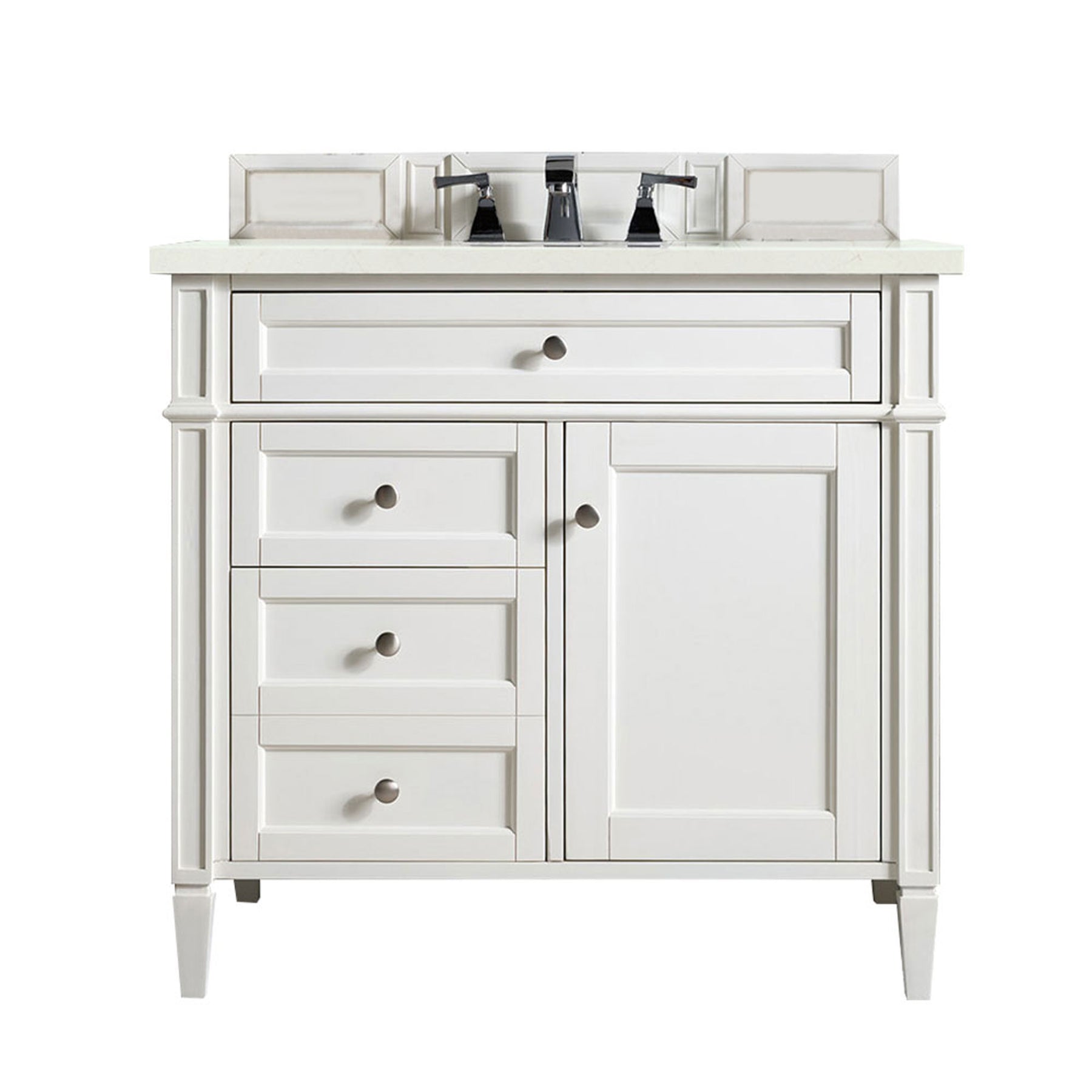 The Brittany 36" Bright White single vanity by James Martin Vanities features classic details that bridge both Traditional and Transitional styles. This beautiful piece of furniture includes one hide-away tip out, top row drawer plus two full-depth side drawers, one of which is double-height for storage of taller items. This cabinet also has one door, which conceals an interior shelf for ample storage. Hand crafted in hardwood solids with Satin Nickel hardware. Matching wood backsplash is included. The classic, warm tones of the Eternal Marfil Silestone top by Cosentino completes the look.