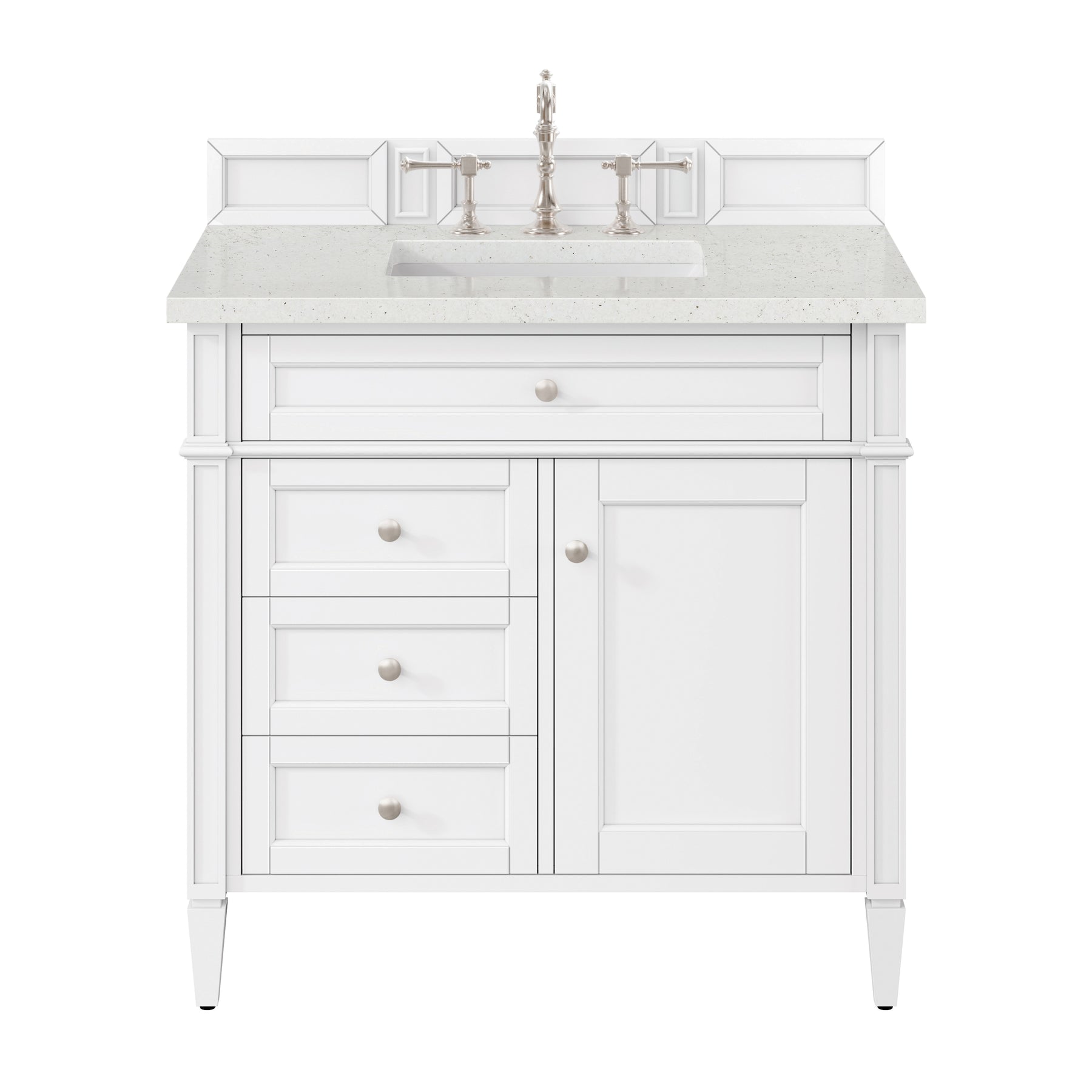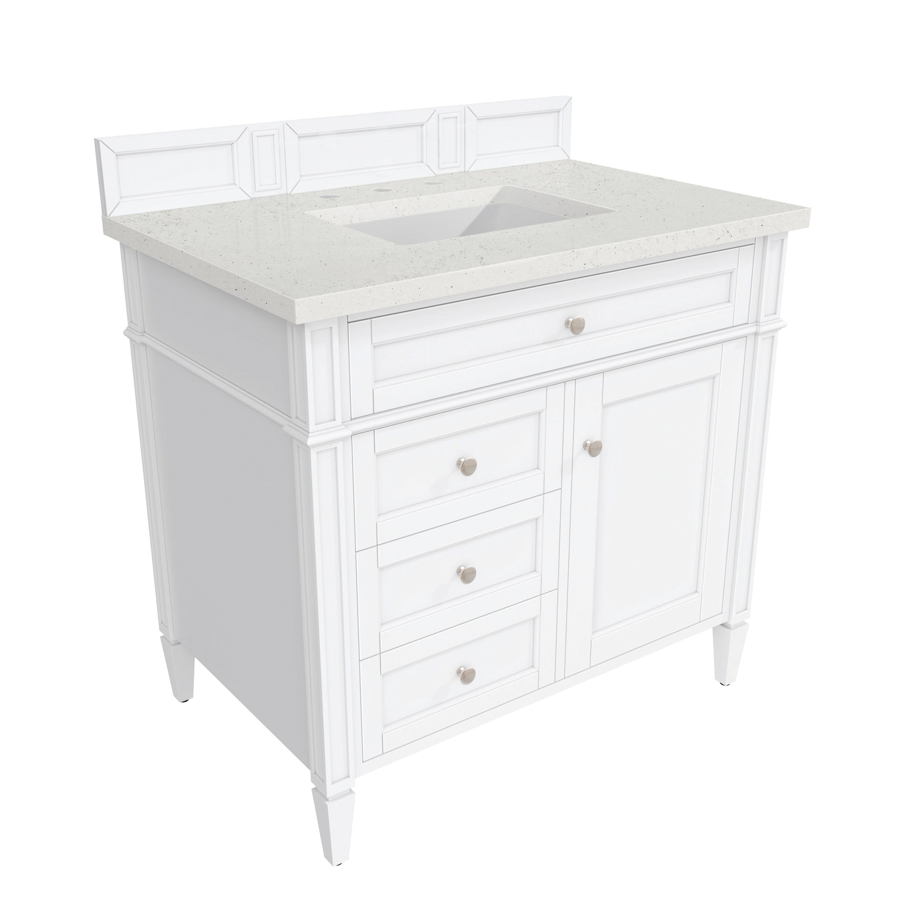The Brittany 36" Bright White single vanity by James Martin Vanities features classic details that bridge both Traditional and Transitional styles. This beautiful piece of furniture includes one hide-away tip out, top row drawer plus two full-depth side drawers, one of which is double-height for storage of taller items. This cabinet also has one door, which conceals an interior shelf for ample storage. Hand crafted in hardwood solids with Satin Nickel hardware. Matching wood backsplash is included. The Lime Delight Silestone top lends warm, textured beige tones to perfectly complement the finish on the vanity.
