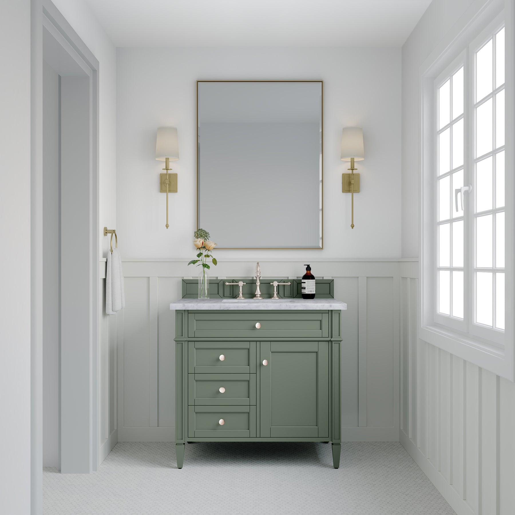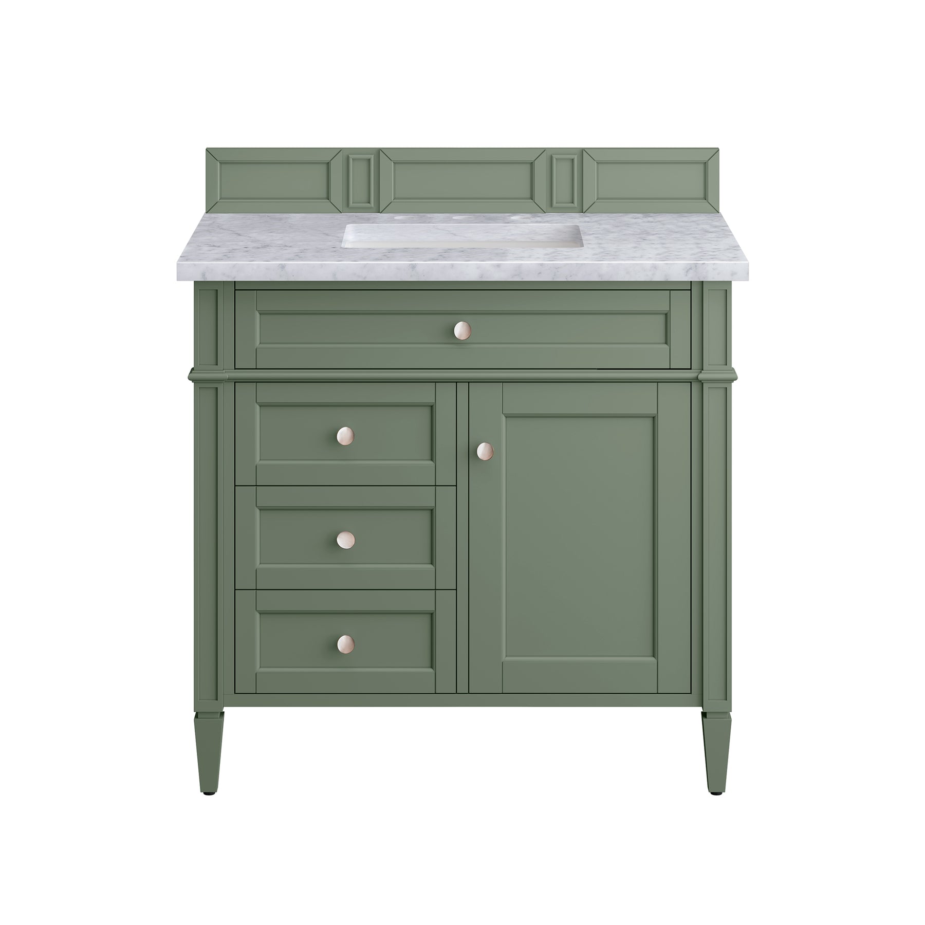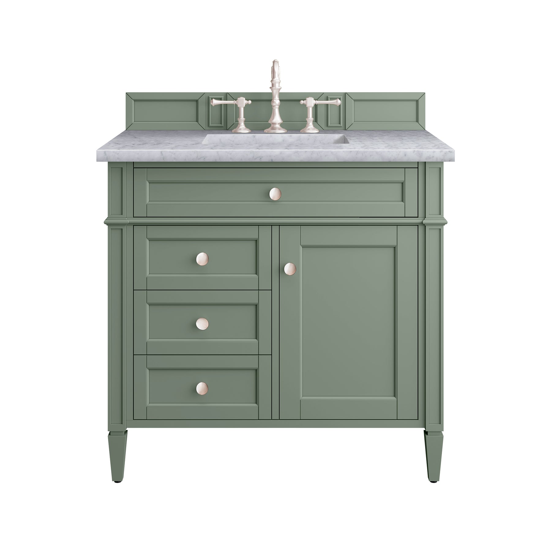 The Smokey Celadon finish on the 36" Brittany Vanity adds a refreshing, natural element to any bathroom space. This moody, yet muted green, with subtle blue and grey undertones, brings the rich, timeless details of the Brittany collection to life. The 36" cabinet, with decorative wood backsplash, features optimal organization with one hide-away tip-out drawer plus two side drawers, one of which is a double height for storing taller items while the other contains a removable bamboo organizer tray. This cabinet also has one door, which conceals an interior shelf. All drawers are lined with an aluminum laminate surface for easy cleaning and are equipped with undermount soft-close slides. The natural Spanish Carrara marble top perfectly complements the green hue and the classic details of the Brittany vanity. All of our 3 CM tops include a porcelain undermount sink.