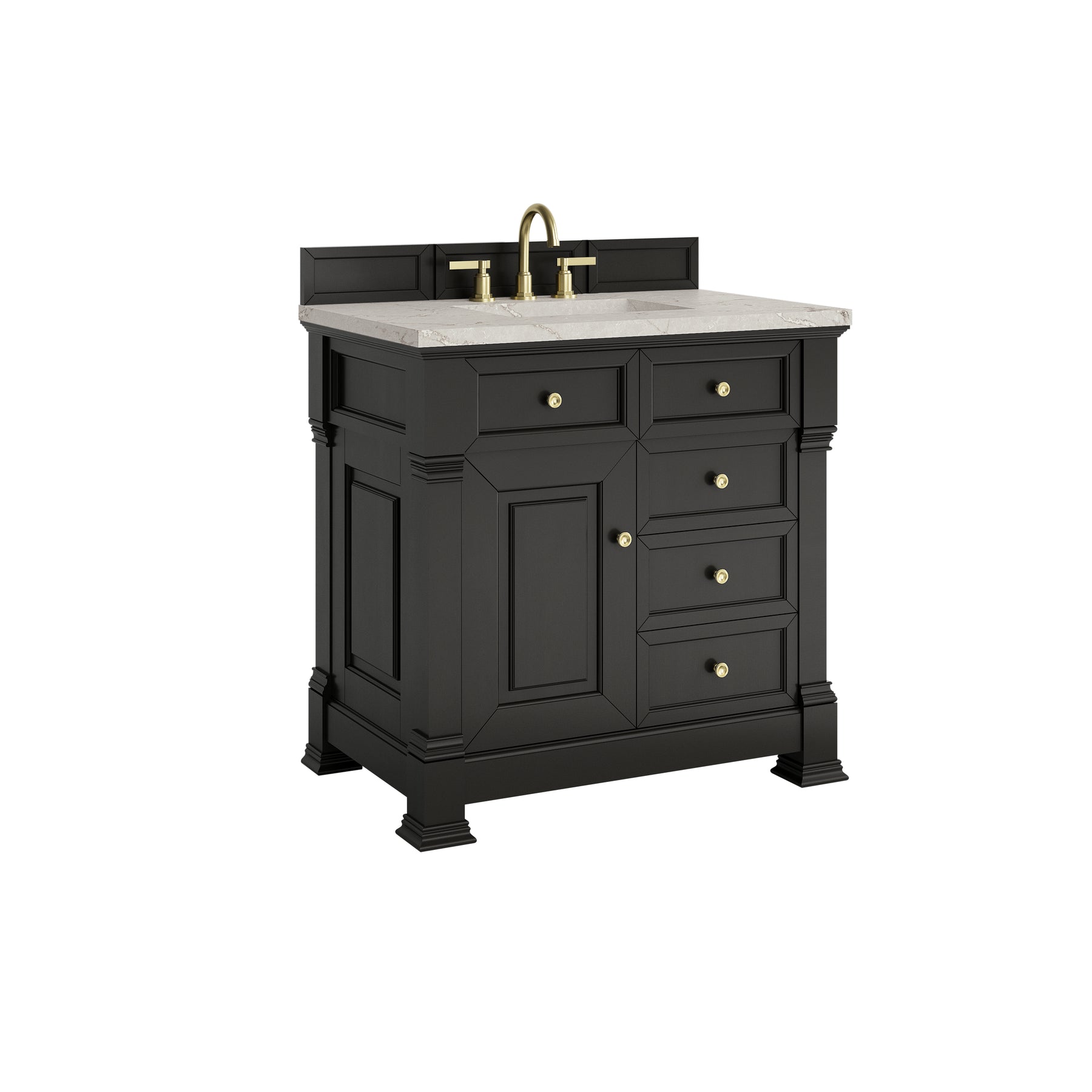 The Brookfield 36" Single Vanity in Black Onyx by James Martin Vanities offers a blend of traditional elegance and contemporary sophistication. The raised panel picture frame doors and detailed corner molding reflect timeless craftsmanship, while the rich Black Onyx finish and Champagne Brass hardware lend a fresh, modern appeal. This beautifully crafted vanity features a single-door cabinet with an interior shelf, a double-height drawer for added versatility, and two standard drawers for ample storage. The timeless Black Onyx finish lends sophistication and charm to your space. The addition of a Victorian Silver SilestoneĀ® top featuring a neutral white and gray background with fine silver veining, along with an undermount sink, completes the look.