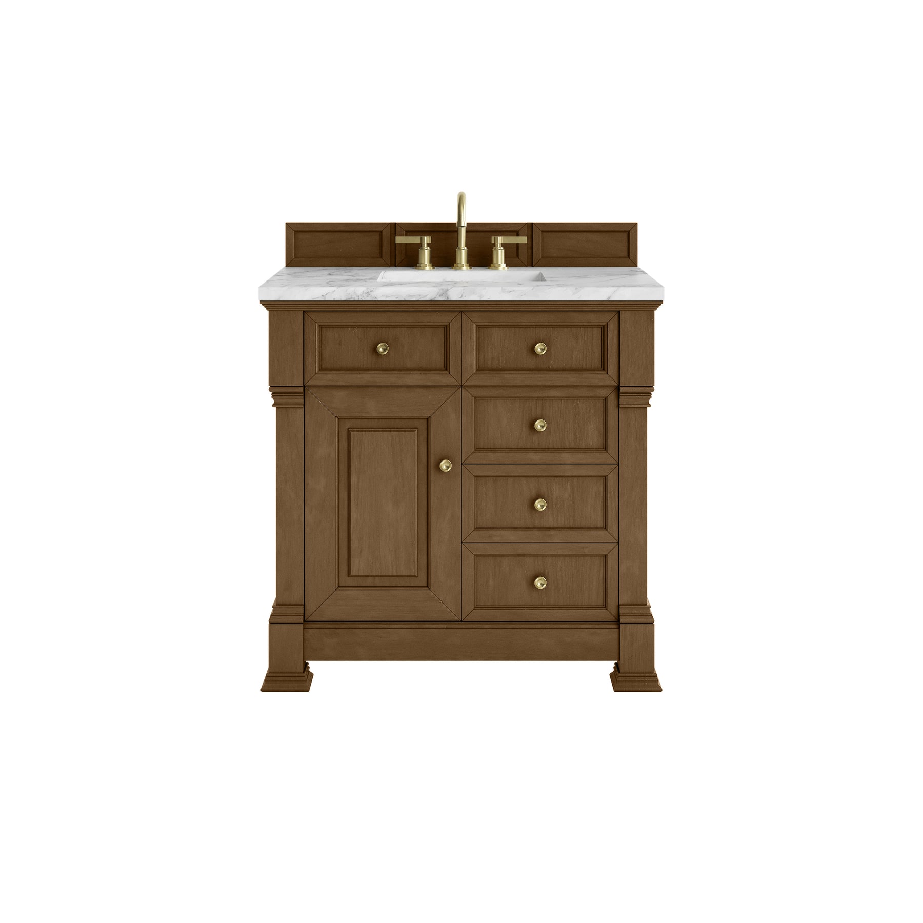 The Brookfield 36" Single Vanity in Honey Oak by James Martin Vanities offers a blend of traditional elegance and contemporary sophistication. The raised panel picture frame doors and detailed corner molding reflect timeless craftsmanship, while the warm Honey Oak finish and Champagne Brass hardware lend a fresh, modern appeal. This beautifully crafted vanity features a single-door cabinet with an interior shelf, a double-height drawer for added versatility, and two standard drawers for ample storage. The warm wood tones highlight the natural Oak wood grains, lending sophistication and charm to your space. The look is completed by a classic Carrara Marble top with white porcelain undermount sink.