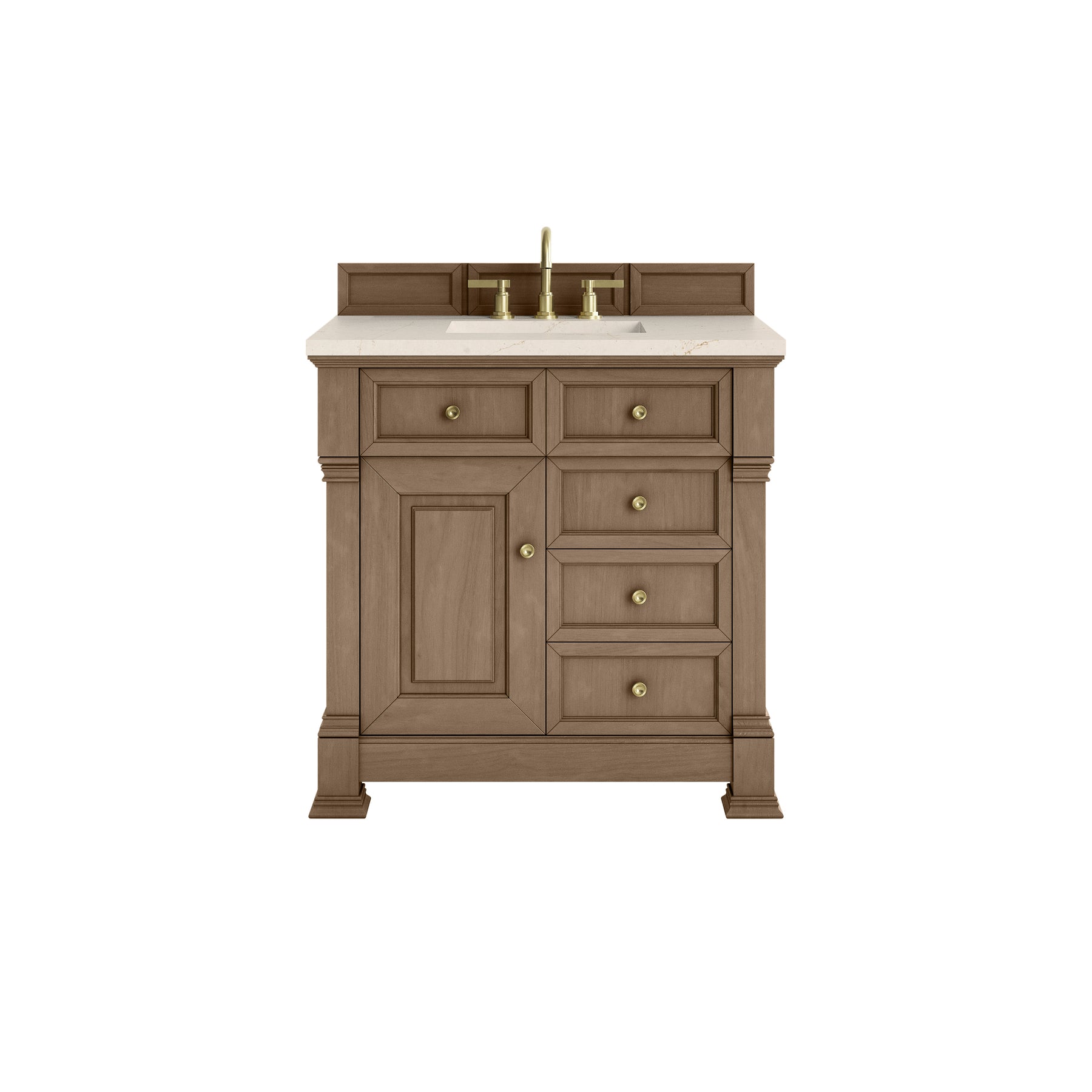 The Brookfield 36" Single Vanity in Pecan by James Martin Vanities offers a blend of traditional elegance and contemporary sophistication. The raised panel picture frame doors and detailed corner molding reflect timeless craftsmanship, while the Pecan finish and Champagne Brass hardware lend a fresh, modern appeal. This beautifully crafted vanity features a single-door cabinet with an interior shelf, a double-height drawer for added versatility, and two standard drawers for ample storage. The cool wood tones highlight the natural Oak wood grains, lending sophistication and charm to your space. The addition of an Eternal Marfil Silestone® top with undermount sink completes the look.