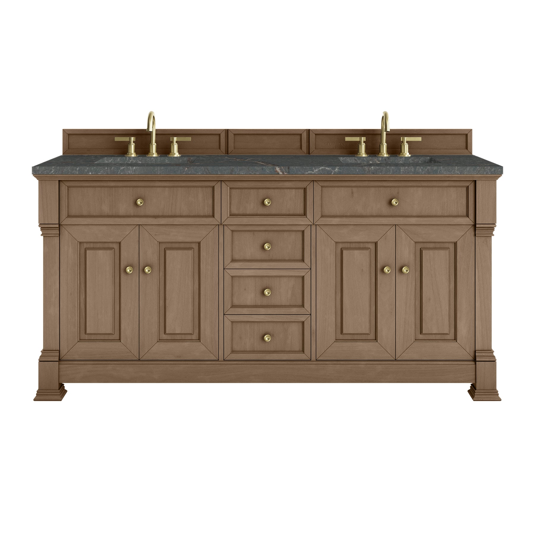 The Brookfield 72" Double Vanity in Pecan by James Martin Vanities offers a blend of traditional elegance and contemporary sophistication. The raised panel picture frame doors and detailed corner molding reflect timeless craftsmanship, while the Pecan finish and Champagne Brass hardware lend a fresh, modern appeal. This beautifully crafted vanity features two double-door cabinets that open to interior shelves, along with four standard drawers for ample storage. The cool wood tones highlight the natural Oak wood grains, lending sophistication and charm to your space. The addition of a Parisien Bleu Silestone® top featuring copper veining and undermount sinks completes the look.