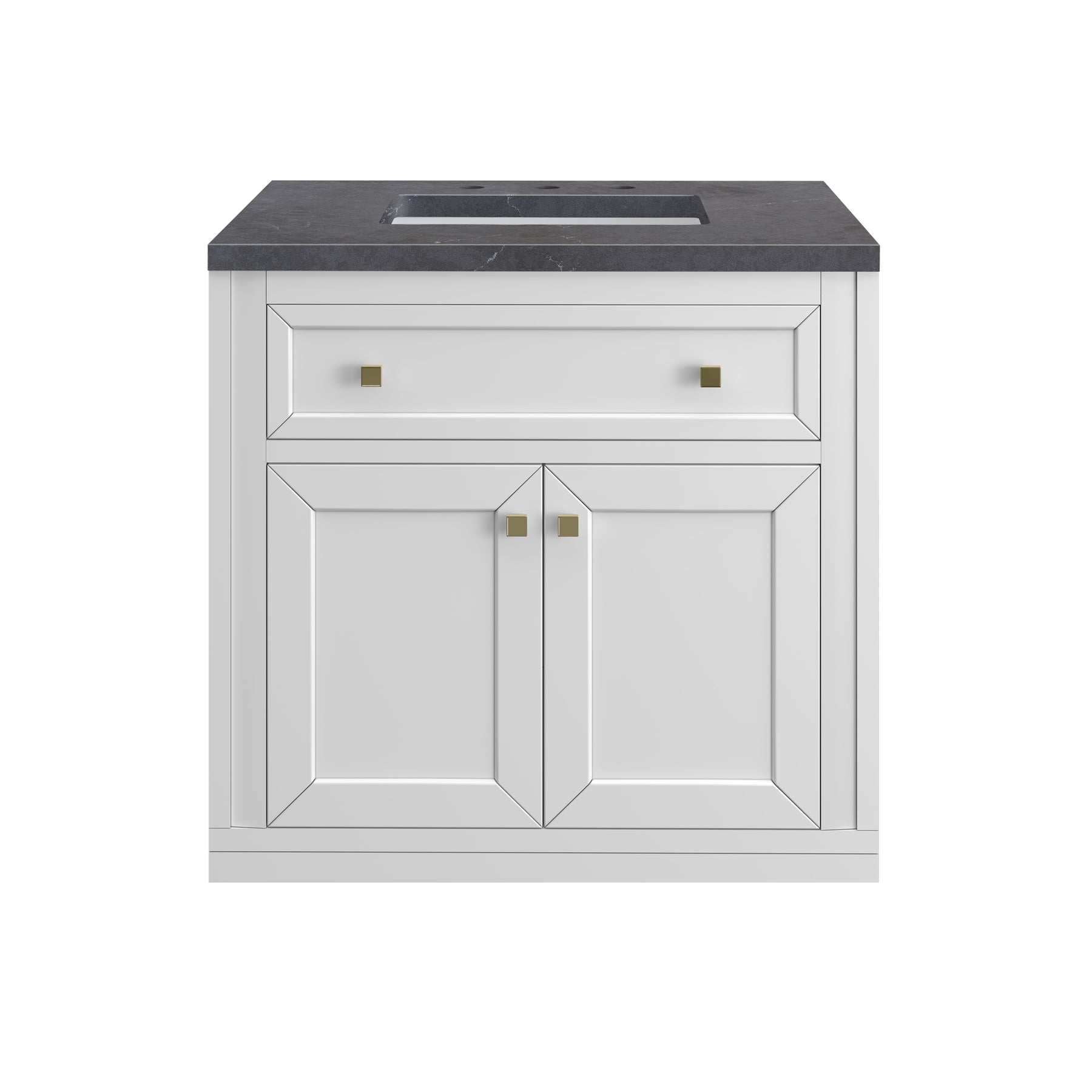 The sophisticated details and clean lines of the Chicago 30" Single Vanity by James Martin Vanities make it the perfect choice for any bathroom. Featuring a Glossy White finish, this vanity offers ample storage with its two-door cabinet, adjustable interior shelf, and top-row tip-out drawer. Champagne Brass knobs and legs add a contemporary touch; or choose to forego the metal legs for a modern wall-mounted installation. The addition of a matte Charcoal Soapstone SilestoneĀ® top with undermount sink completes the look.