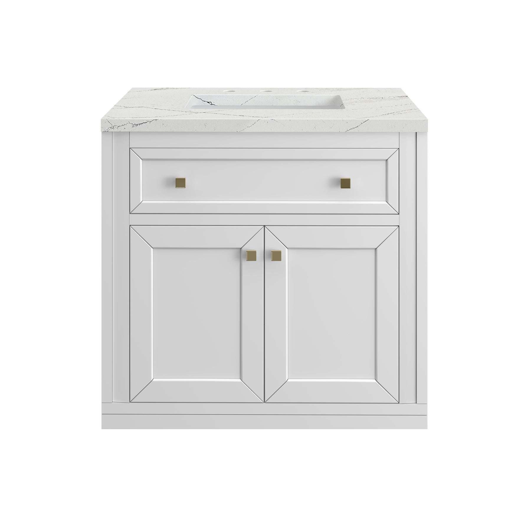 The sophisticated details and clean lines of the Chicago 30" Single Vanity by James Martin Vanities make it the perfect choice for any bathroom. Featuring a Glossy White finish, this vanity offers ample storage with its two-door cabinet, adjustable interior shelf, and top-row tip-out drawer. Champagne Brass knobs and legs add a contemporary touch; or choose to forego the metal legs for a modern wall-mounted installation. The addition of a stunning Ethereal Noctis SilestoneĀ® top with undermount sink completes the look.