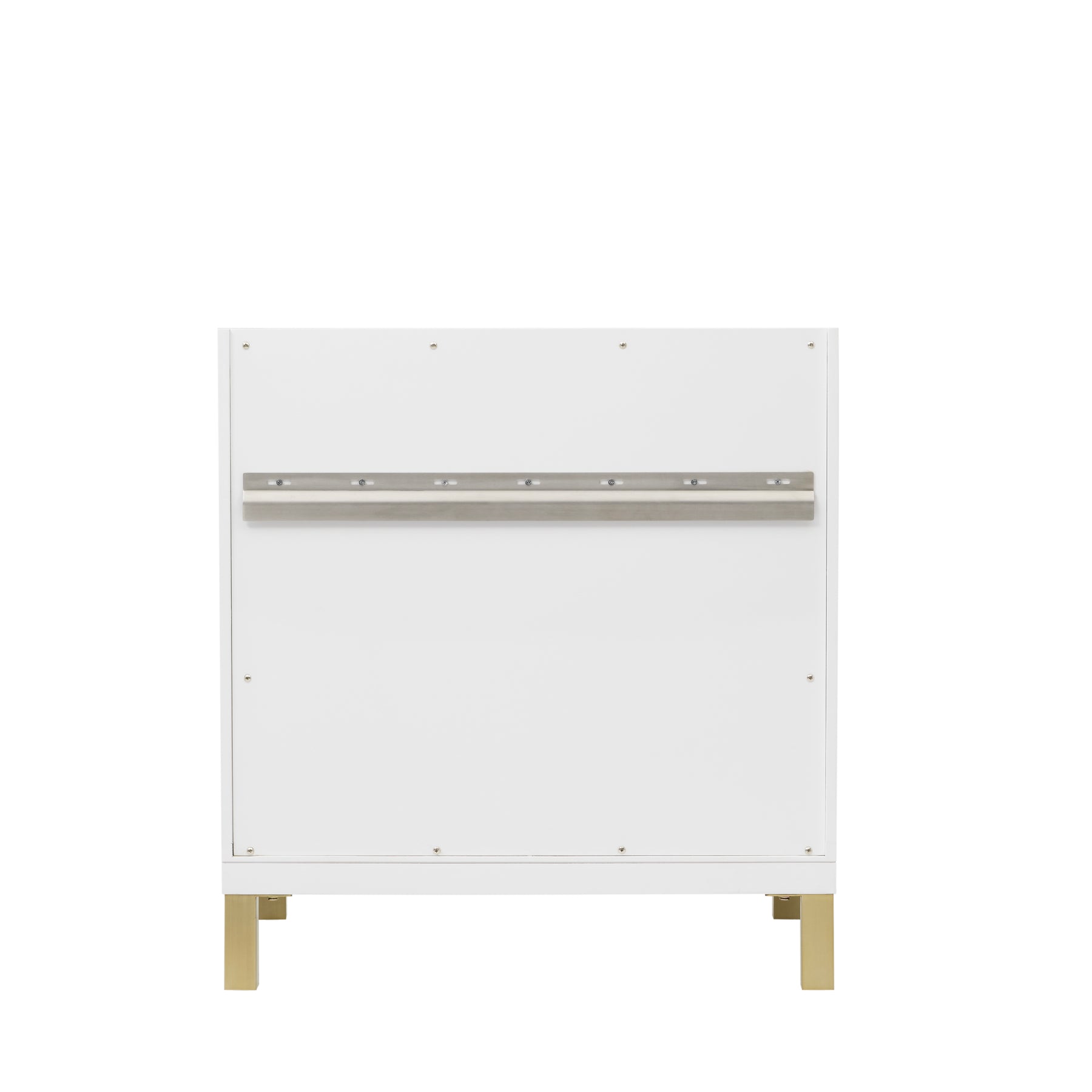The sophisticated details and clean lines of the Chicago 30" Single Vanity by James Martin Vanities make it the perfect choice for any bathroom. Featuring a Glossy White finish, this vanity offers ample storage with its two-door cabinet, adjustable interior shelf, and top-row tip-out drawer. Champagne Brass knobs and legs add a contemporary touch; or choose to forego the metal legs for a modern wall-mounted installation. The addition of a beautiful Victorian Silver SilestoneĀ® top with undermount sink completes the look.