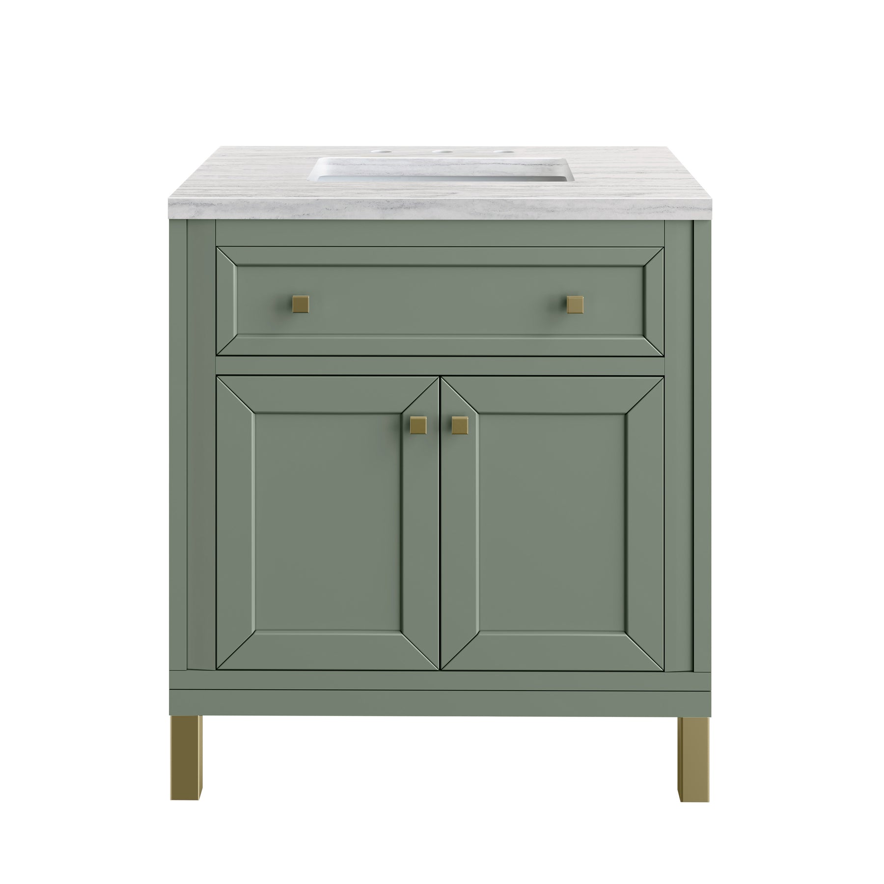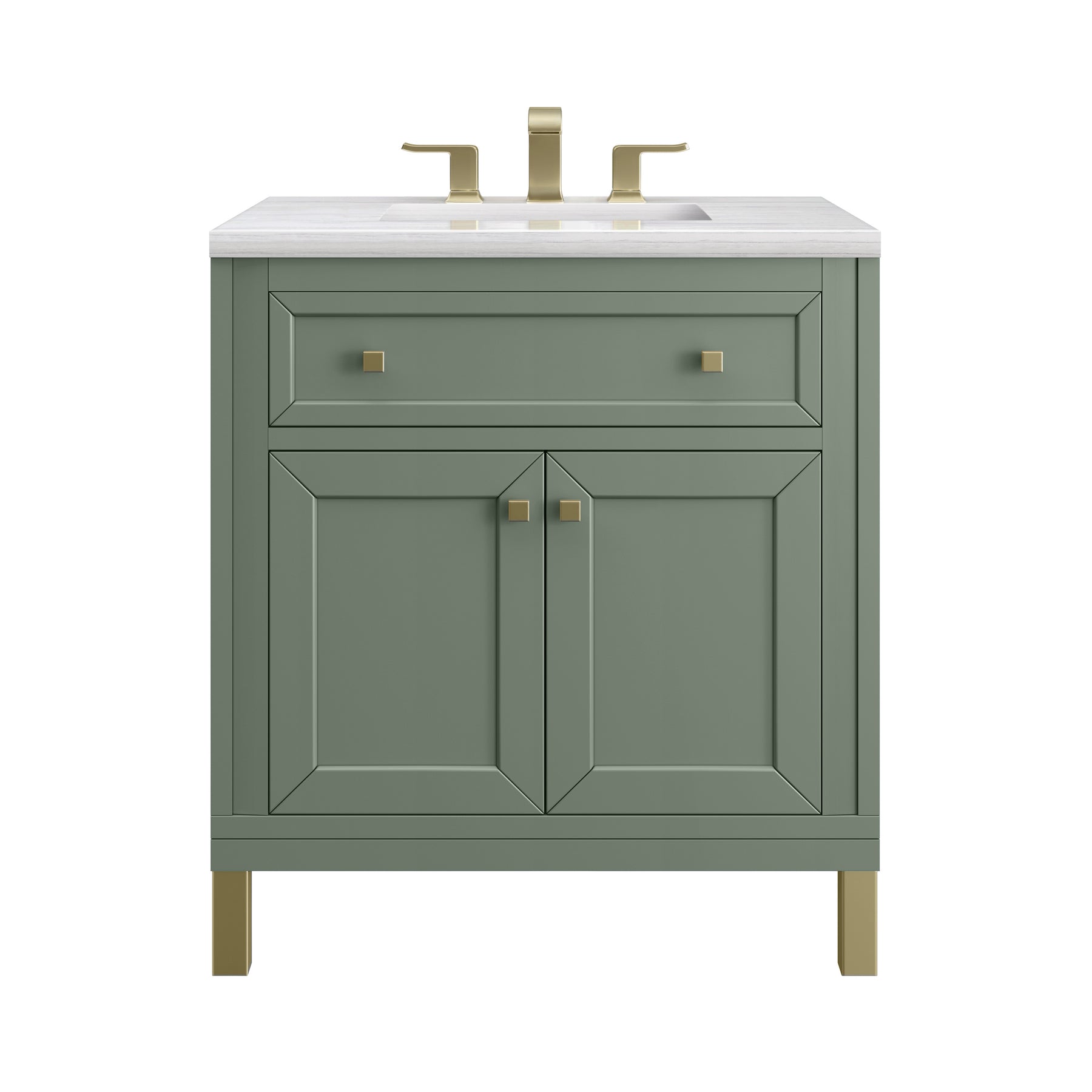 The sophisticated details and clean lines of the Chicago 30" Single Vanity by James Martin Vanities make it the perfect choice for any bathroom. Featuring a Smokey Celadon finish, this vanity offers ample storage with its two-door cabinet, adjustable interior shelf, and top-row tip-out drawer. Champagne Brass knobs and legs add a contemporary touch; or choose to forego the metal legs for a modern wall-mounted installation. The addition of a modern Arctic Fall Solid Surface top with undermount sink completes the look.