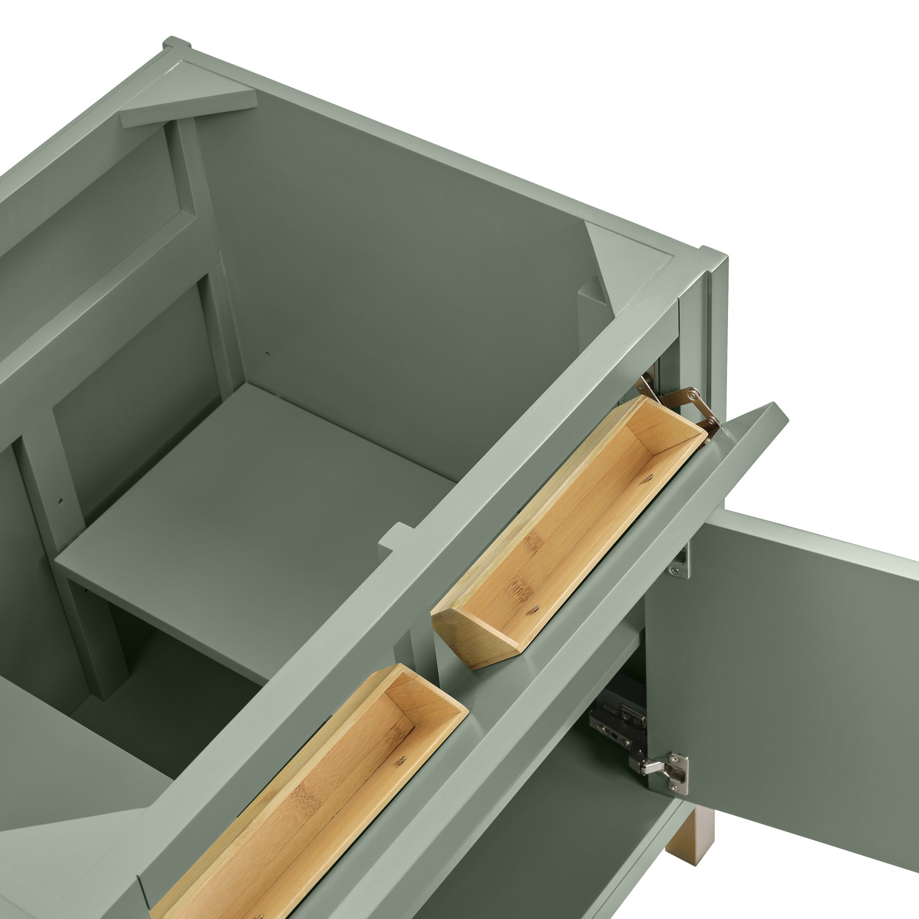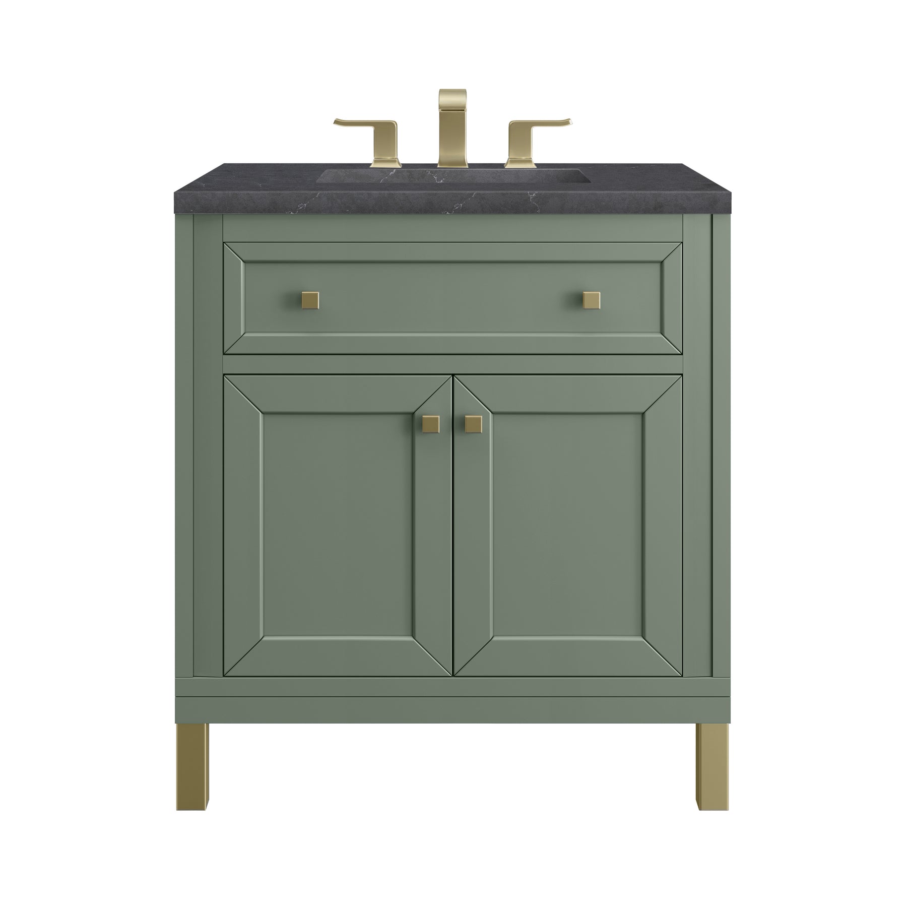 The sophisticated details and clean lines of the Chicago 30" Single Vanity by James Martin Vanities make it the perfect choice for any bathroom. Featuring a Smokey Celadon finish, this vanity offers ample storage with its two-door cabinet, adjustable interior shelf, and top-row tip-out drawer. Champagne Brass knobs and legs add a contemporary touch; or choose to forego the metal legs for a modern wall-mounted installation. The addition of a matte Charcoal Soapstone SilestoneĀ® top with undermount sink completes the look.