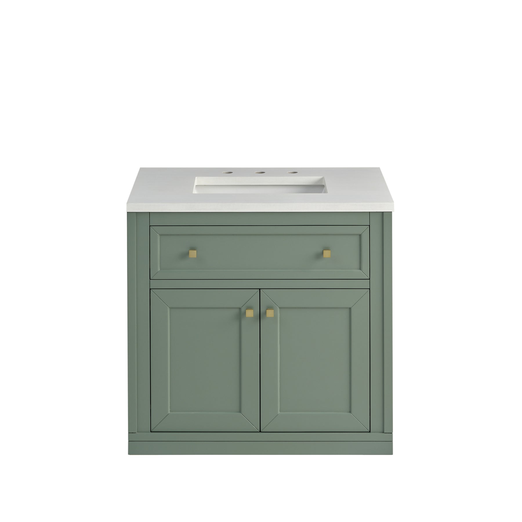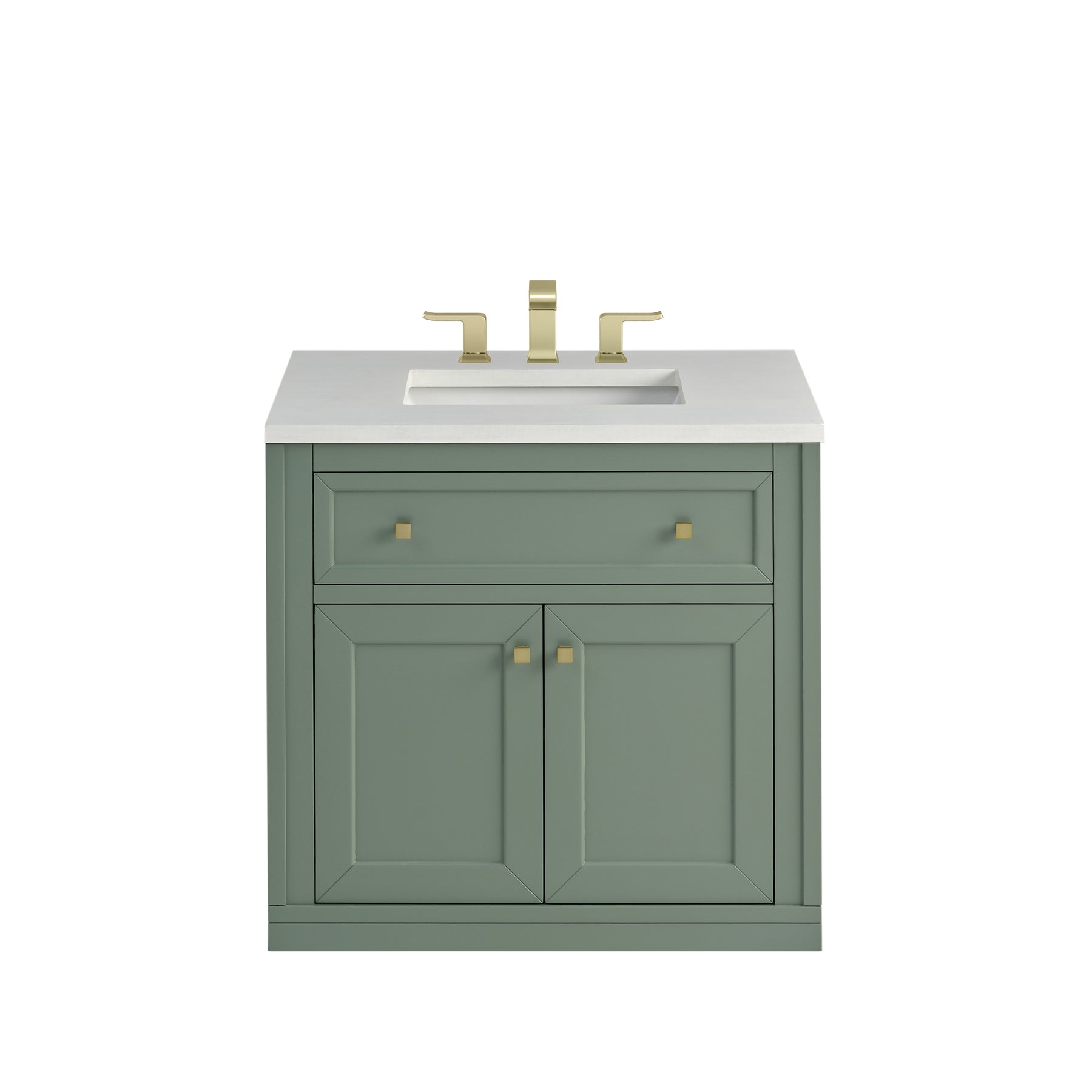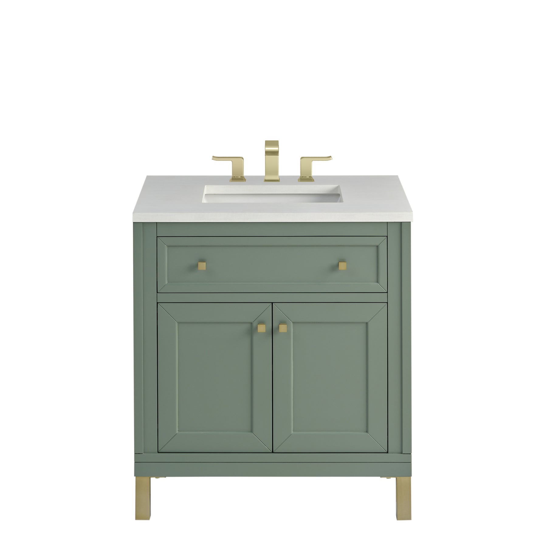 The sophisticated details and clean lines of the Chicago 30" Single Vanity by James Martin Vanities make it the perfect choice for any bathroom. Featuring a Smokey Celadon finish, this vanity offers ample storage with its two-door cabinet, adjustable interior shelf, and top-row tip-out drawer. Champagne Brass knobs and legs add a contemporary touch; or choose to forego the metal legs for a modern wall-mounted installation. The addition of a classic White Zeus SilestoneĀ® top with undermount sink completes the look.