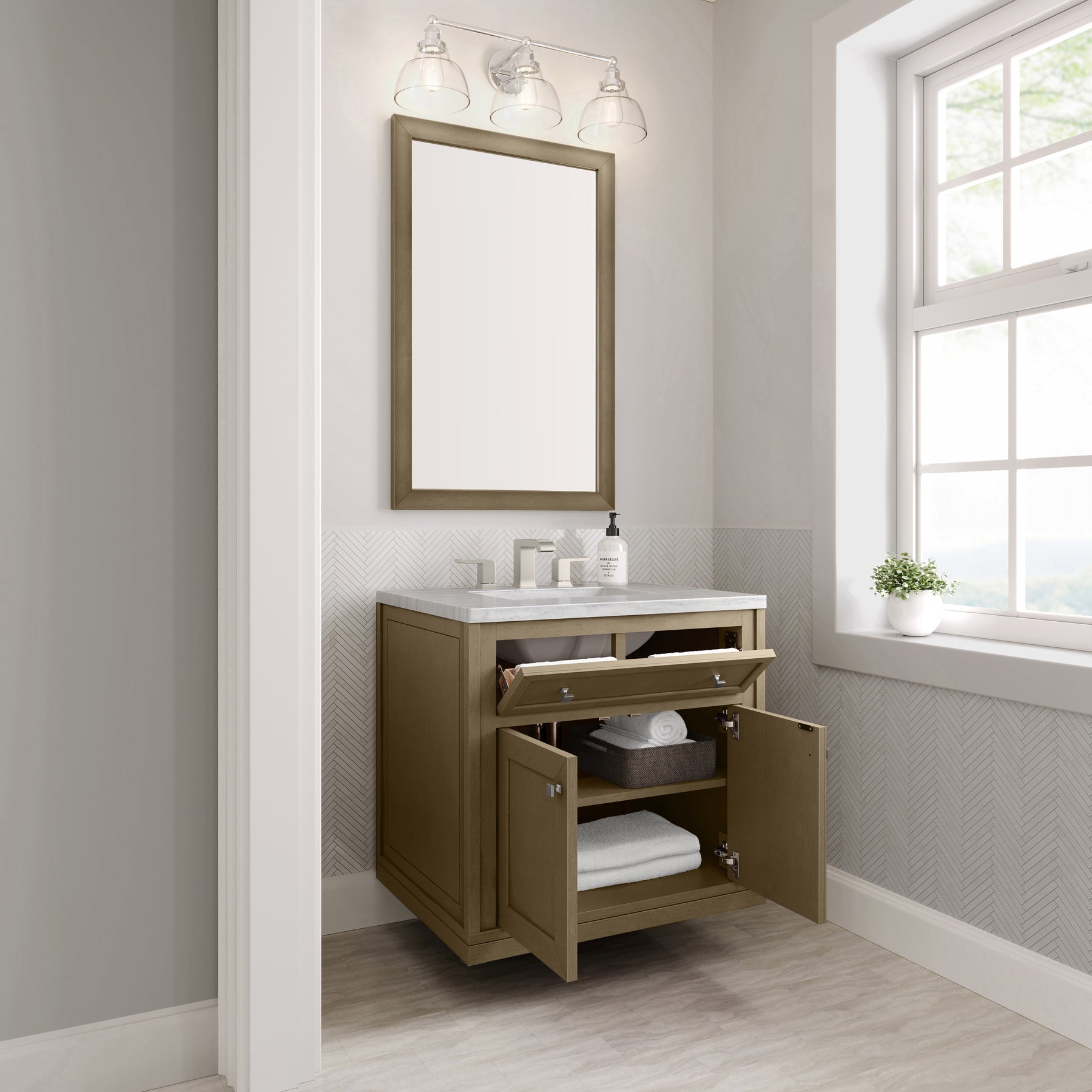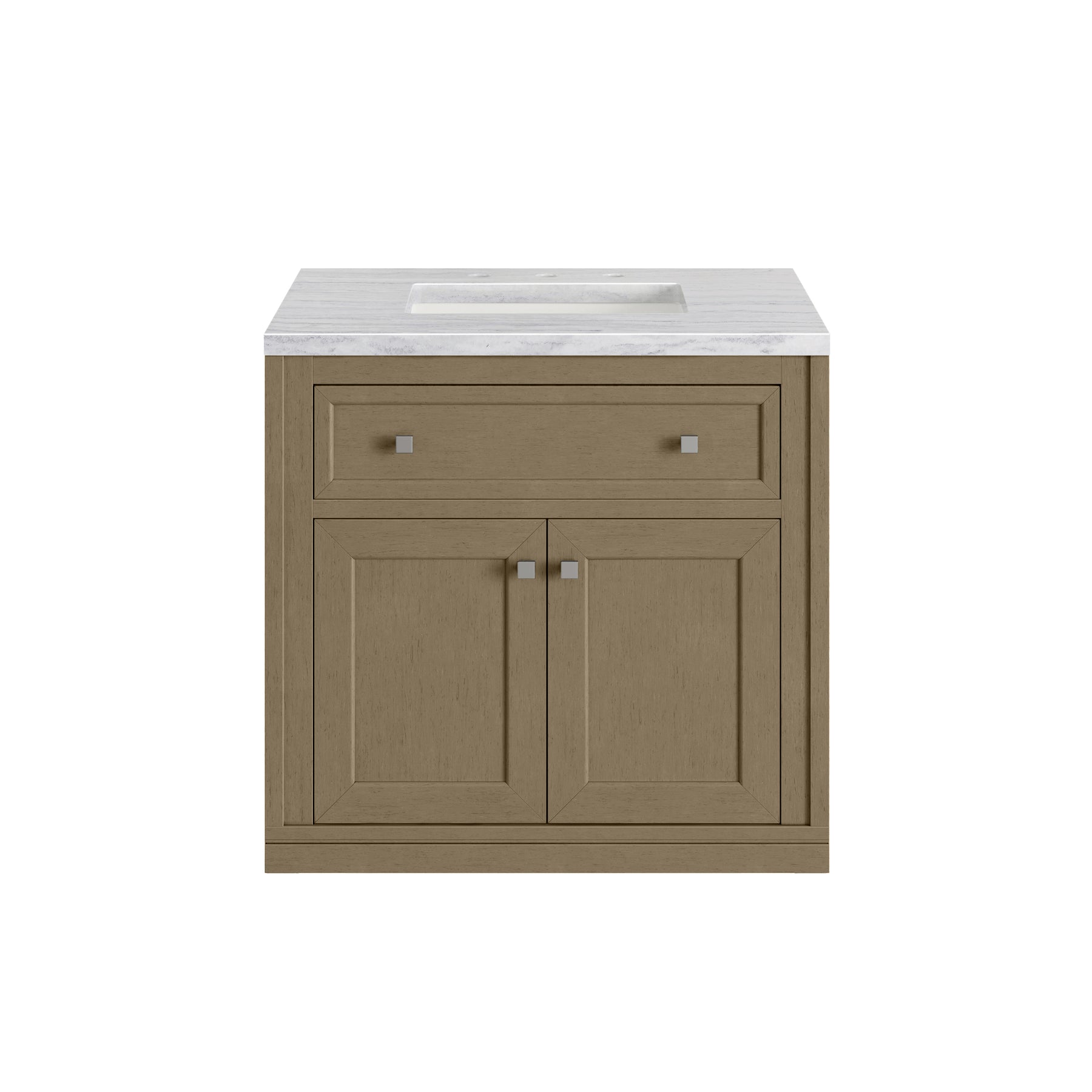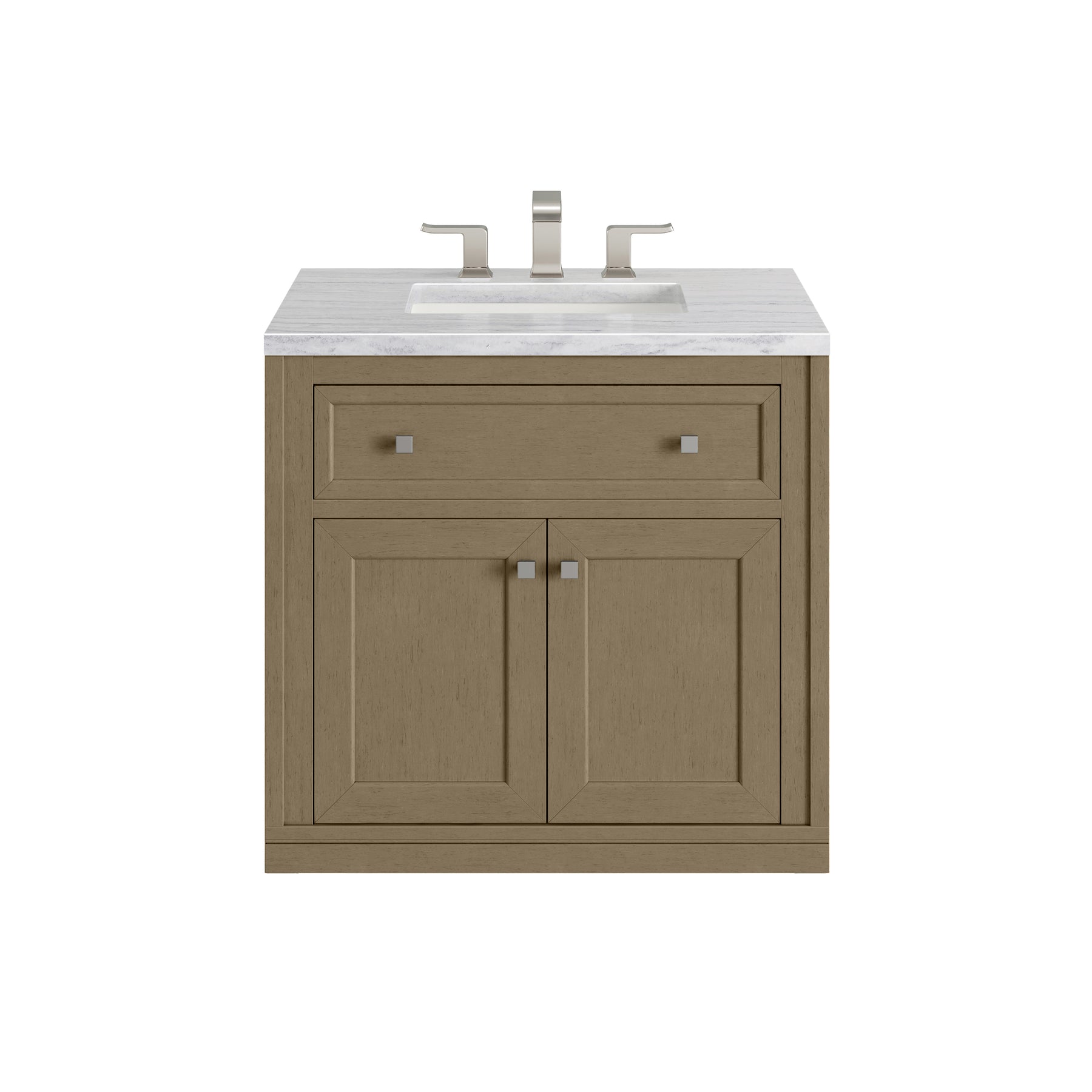 The sophisticated details and clean lines of the Chicago 30" Single Vanity by James Martin Vanities make it the perfect choice for any bathroom. Featuring a Walnut Whisper finish, this vanity offers ample storage with its two-door cabinet, adjustable interior shelf, and top-row tip-out drawer. Brushed Nickel knobs and legs add a contemporary touch; or choose to forego the metal legs for a modern wall-mounted installation. The addition of a modern Arctic Fall Solid Surface top with undermount sink completes the look.