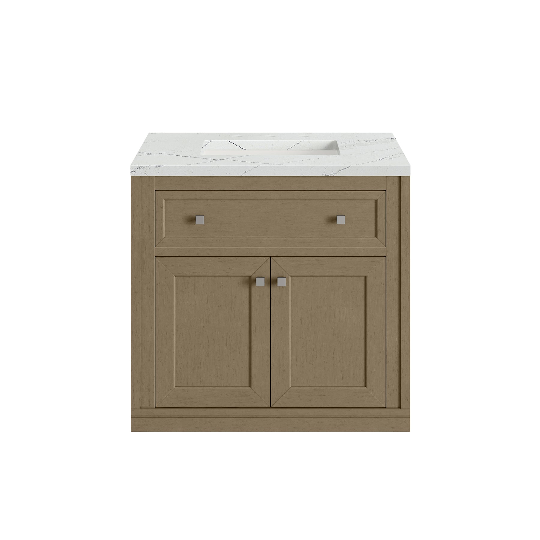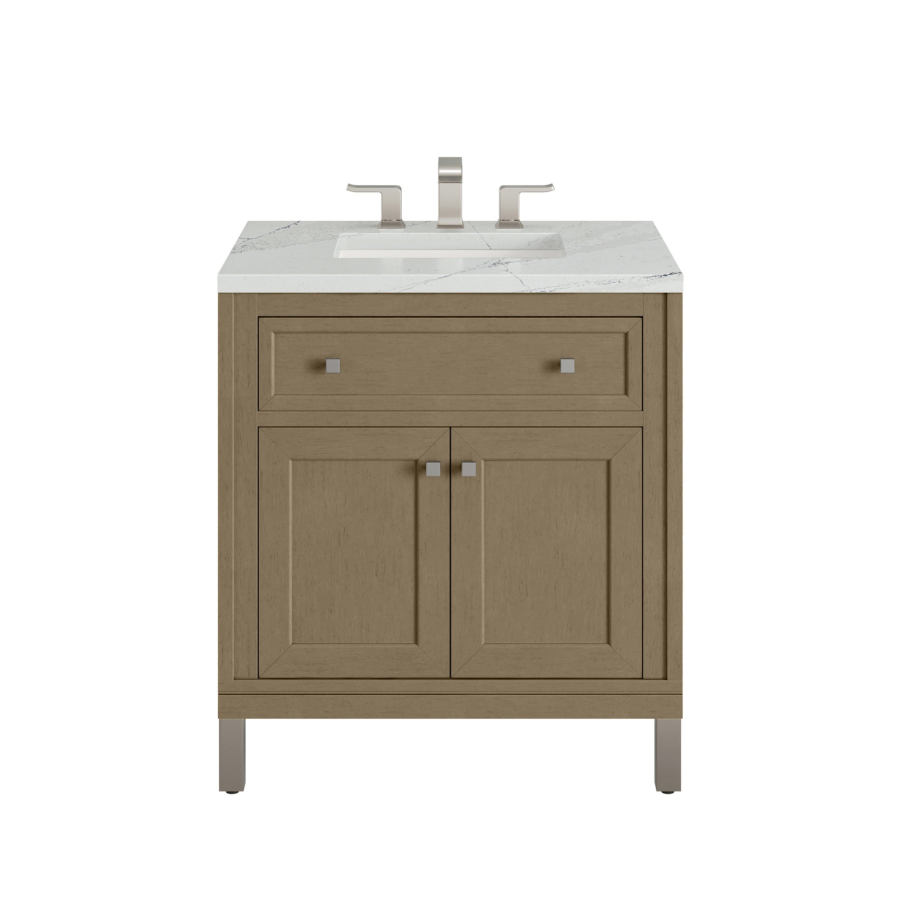 The sophisticated details and clean lines of the Chicago 30" Single Vanity by James Martin Vanities make it the perfect choice for any bathroom. Featuring a Walnut Whisper finish, this vanity offers ample storage with its two-door cabinet, adjustable interior shelf, and top-row tip-out drawer. Brushed Nickel knobs and legs add a contemporary touch; or choose to forego the metal legs for a modern wall-mounted installation. The addition of a stunning Ethereal Noctis SilestoneĀ® top with undermount sink completes the look.