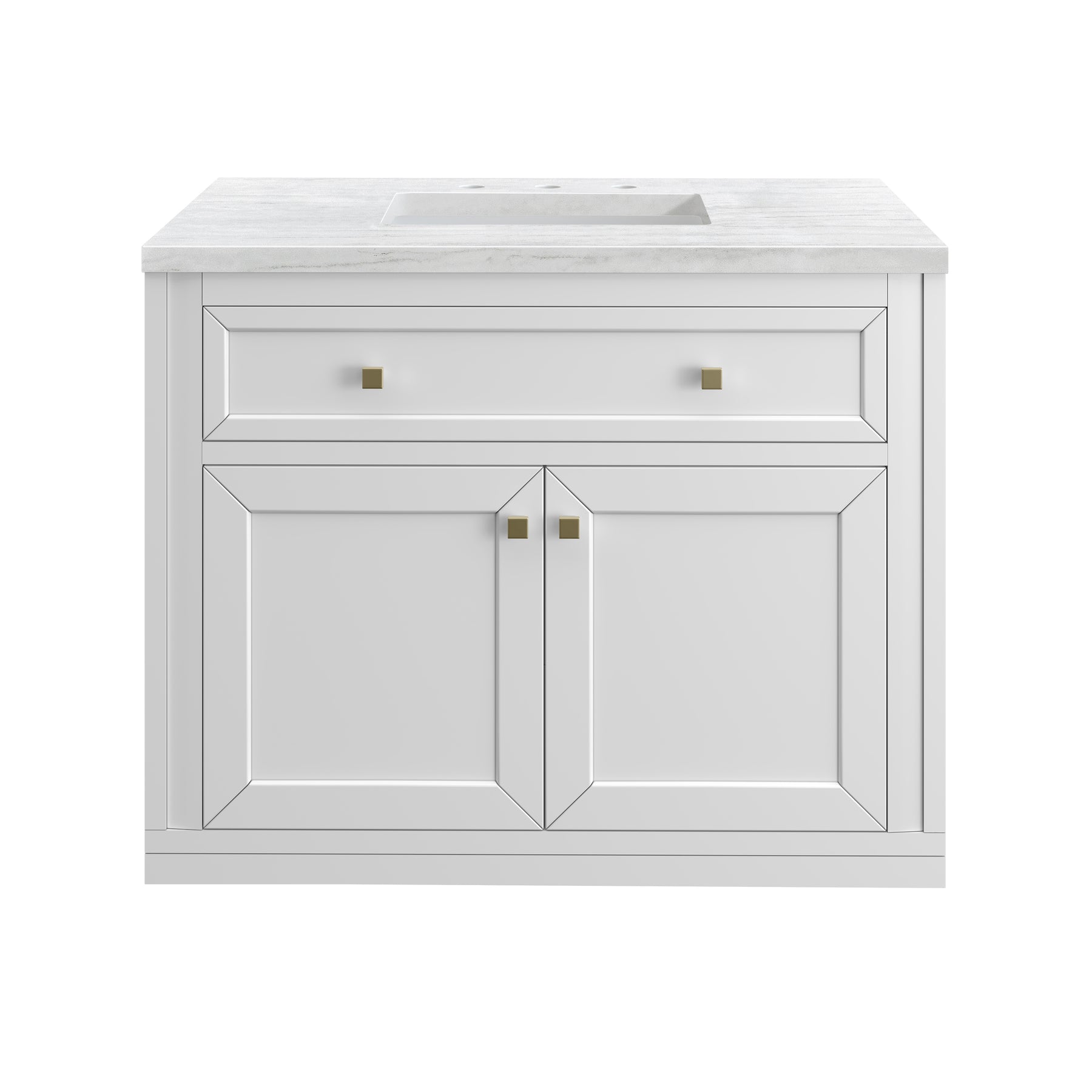 The sophisticated details and clean lines of the Chicago 36" Single Vanity by James Martin Vanities make it the perfect choice for any bathroom. Featuring a Glossy White finish, this vanity offers ample storage with its two-door cabinet, adjustable interior shelf, and top-row tip-out drawer. Champagne Brass knobs and legs add a contemporary touch; or choose to forego the metal legs for a modern wall-mounted installation. The addition of a modern Arctic Fall Solid Surface top with undermount sink completes the look.