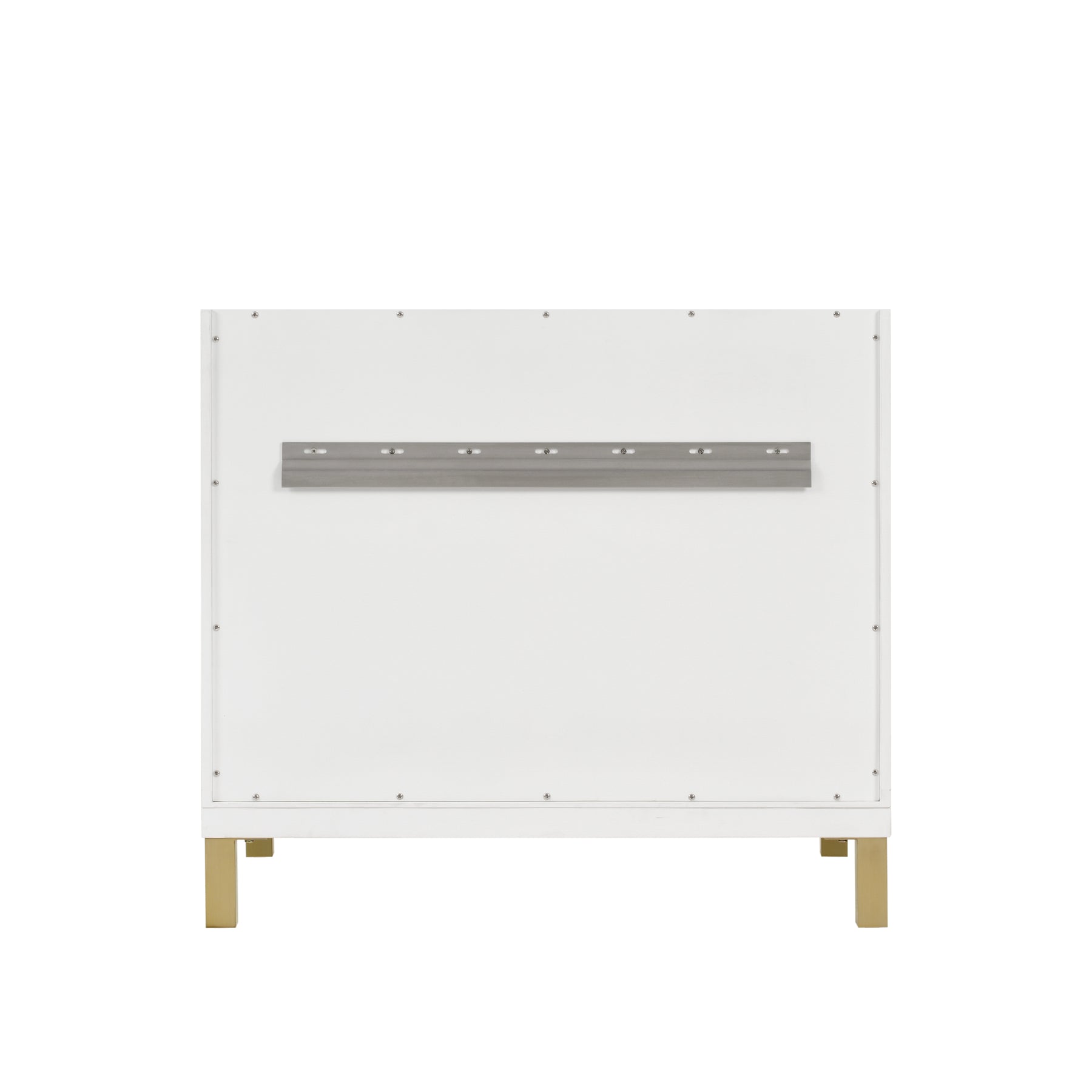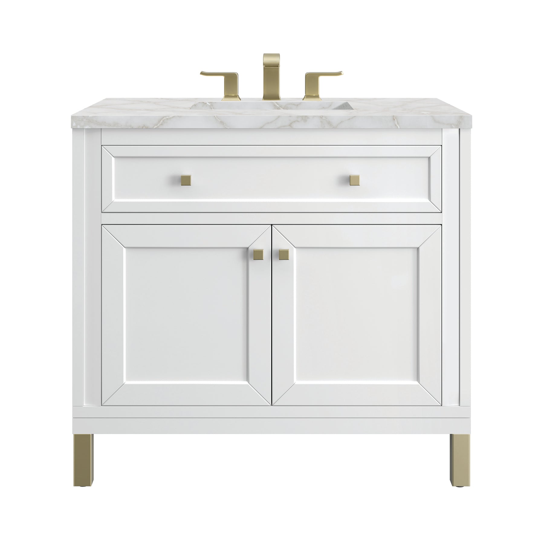 The sophisticated details and clean lines of the Chicago 36" Single Vanity by James Martin Vanities make it the perfect choice for any bathroom. Featuring a Glossy White finish, this vanity offers ample storage with its two-door cabinet, adjustable interior shelf, and top-row tip-out drawer. Champagne Brass knobs and legs add a contemporary touch; or choose to forego the metal legs for a modern wall-mounted installation. The addition of a beautiful Victorian Silver SilestoneĀ® top with undermount sink completes the look.
