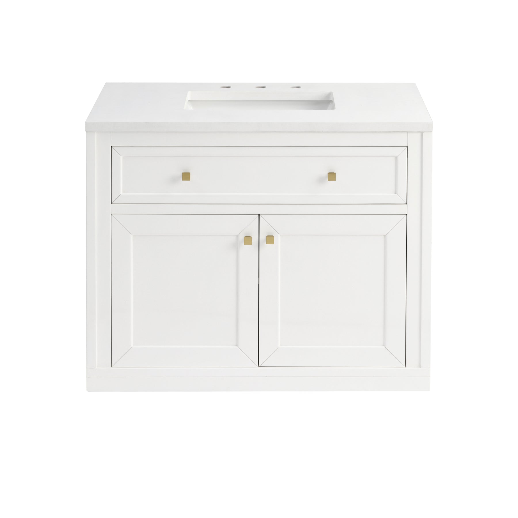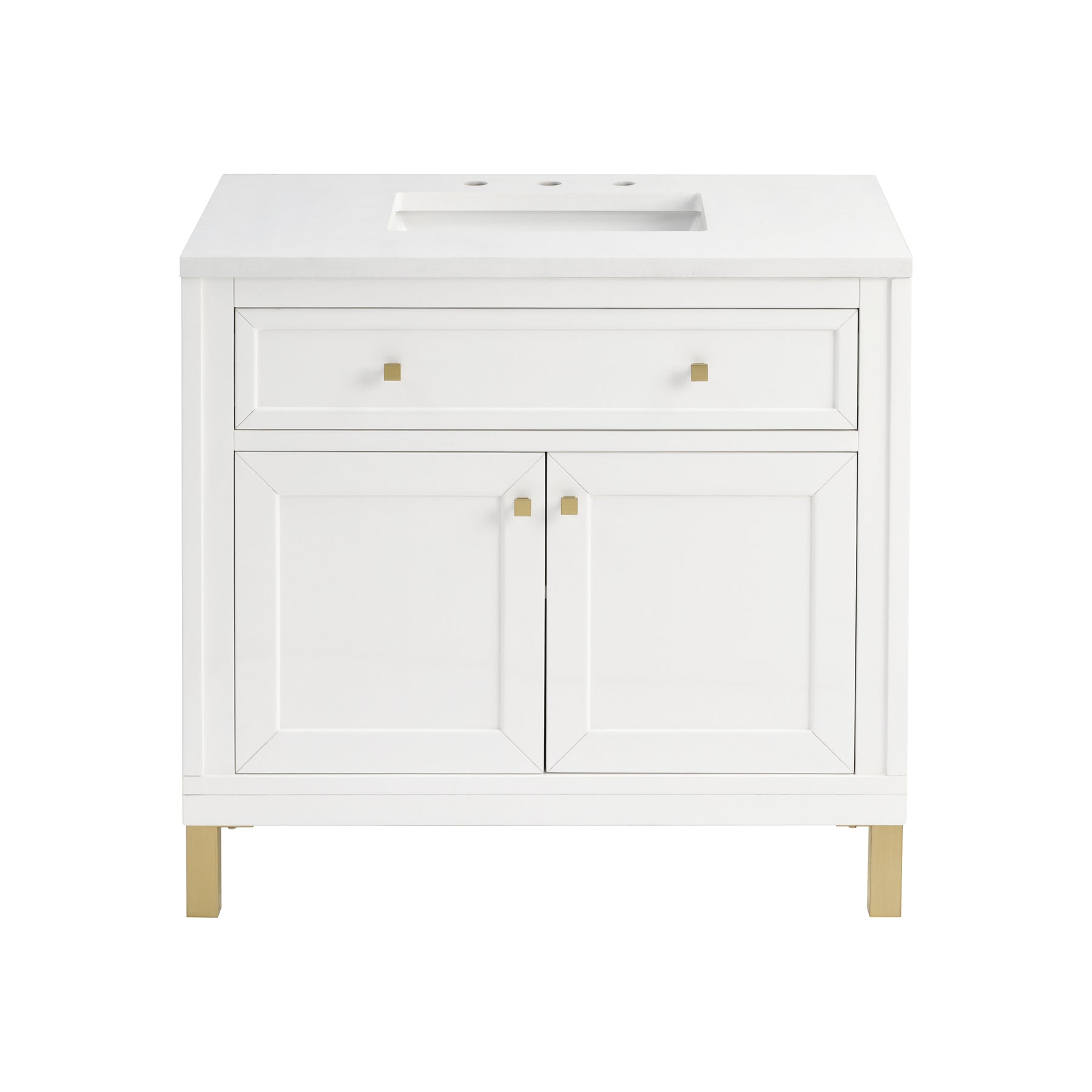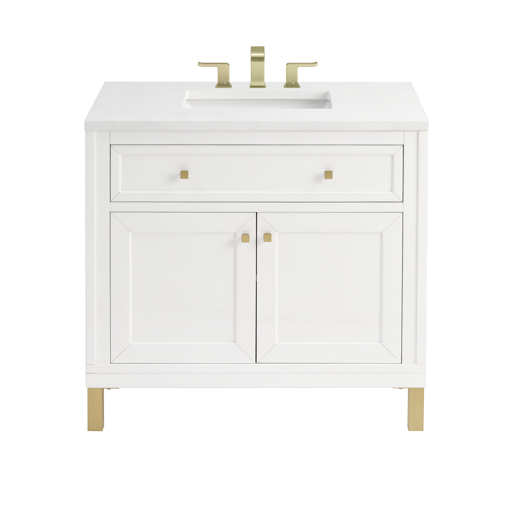 The sophisticated details and clean lines of the Chicago 36" Single Vanity by James Martin Vanities make it the perfect choice for any bathroom. Featuring a Glossy White finish, this vanity offers ample storage with its two-door cabinet, adjustable interior shelf, and top-row tip-out drawer. Champagne Brass knobs and legs add a contemporary touch; or choose to forego the metal legs for a modern wall-mounted installation. The addition of a classic White Zeus Silestone® top with undermount sink completes the look.