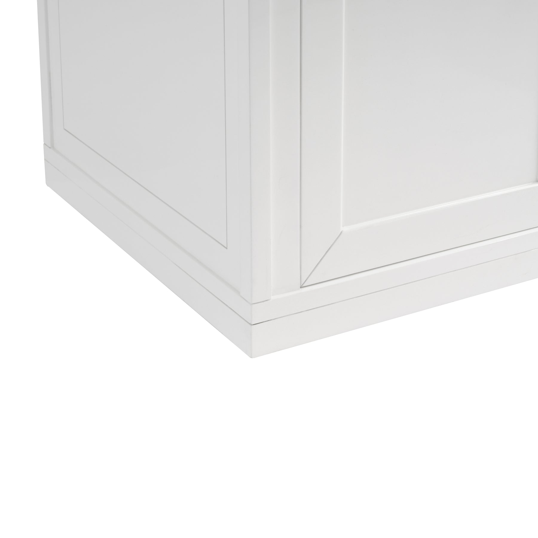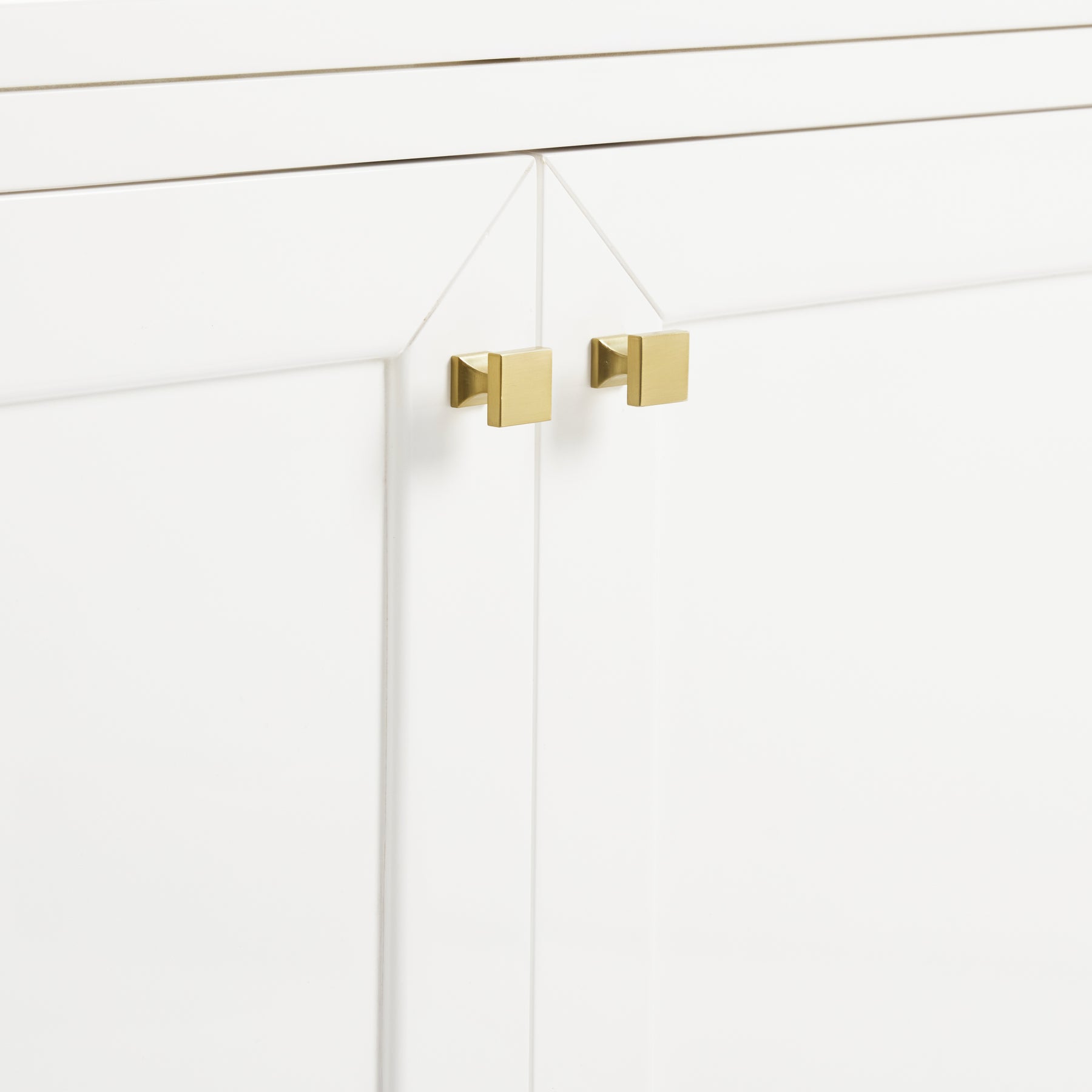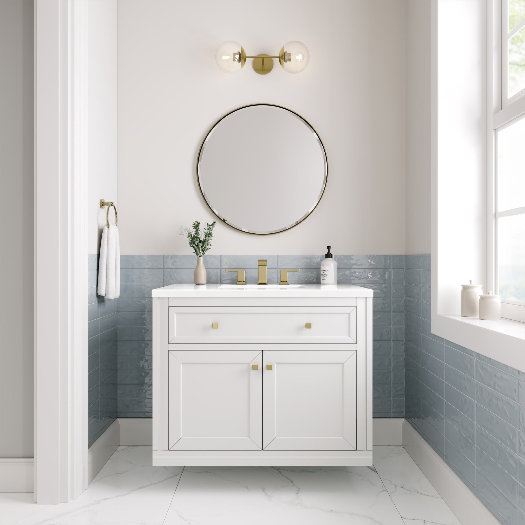 The sophisticated details and clean lines of the Chicago 36" Single Vanity by James Martin Vanities make it the perfect choice for any bathroom. Featuring a Glossy White finish, this vanity offers ample storage with its two-door cabinet, adjustable interior shelf, and top-row tip-out drawer. Champagne Brass knobs and legs add a contemporary touch; or choose to forego the metal legs for a modern wall-mounted installation. The addition of a classic White Zeus Silestone® top with undermount sink completes the look.