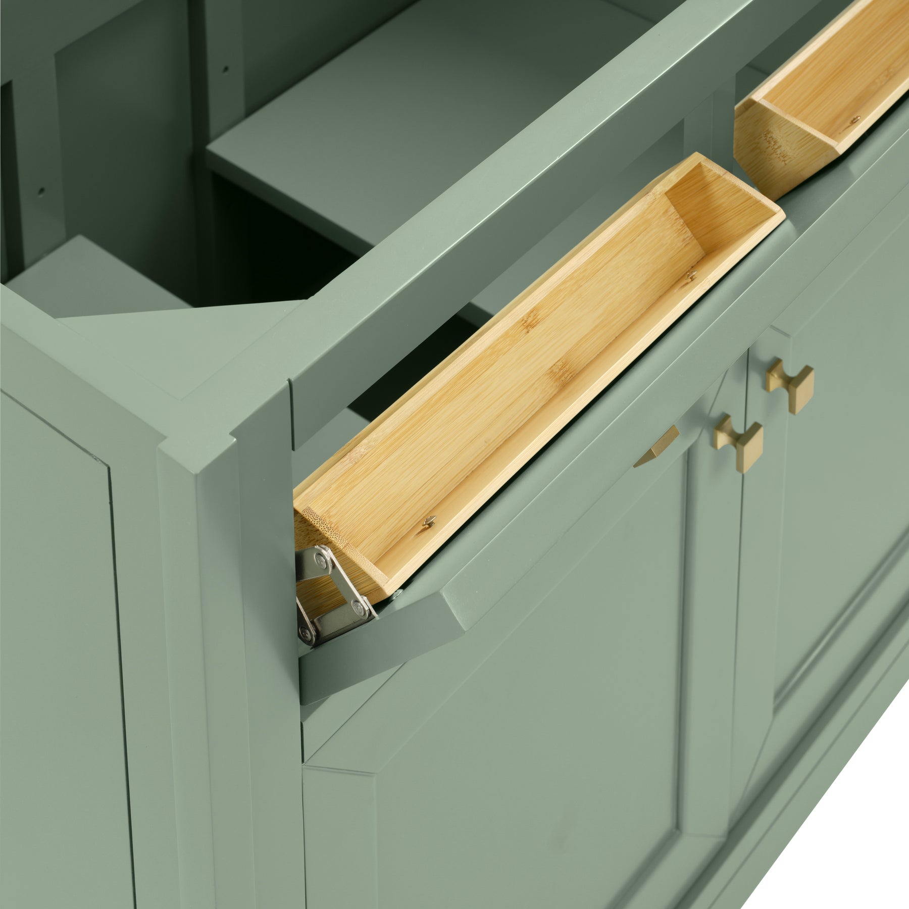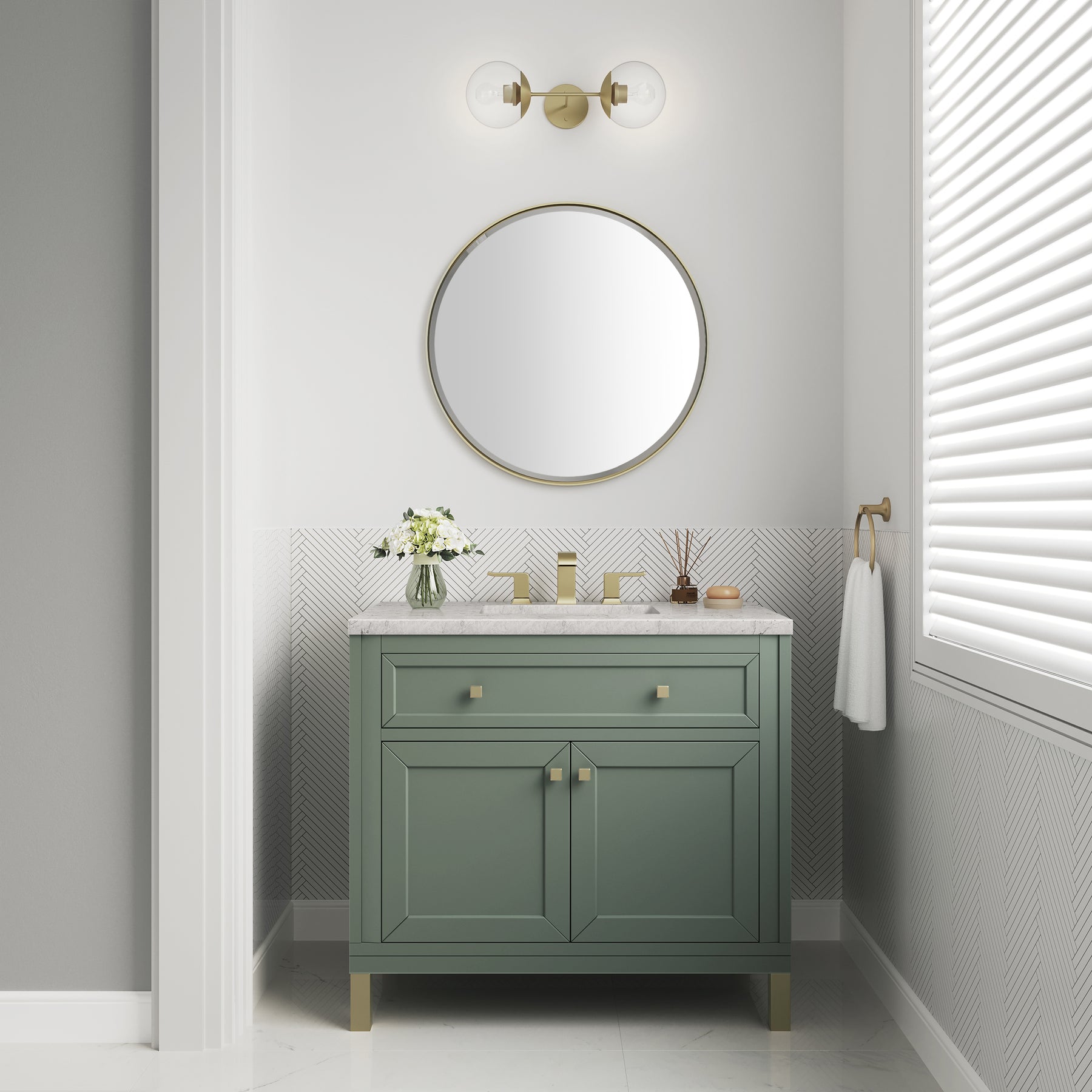 The sophisticated details and clean lines of the Chicago 36" Single Vanity by James Martin Vanities make it the perfect choice for any bathroom. Featuring a Smokey Celadon finish, this vanity offers ample storage with its two-door cabinet, adjustable interior shelf, and top-row tip-out drawer. Champagne Brass knobs and legs add a contemporary touch; or choose to forego the metal legs for a modern wall-mounted installation. The addition of a beautiful Eternal Jasmine Pearl SilestoneĀ® top with undermount sink completes the look.