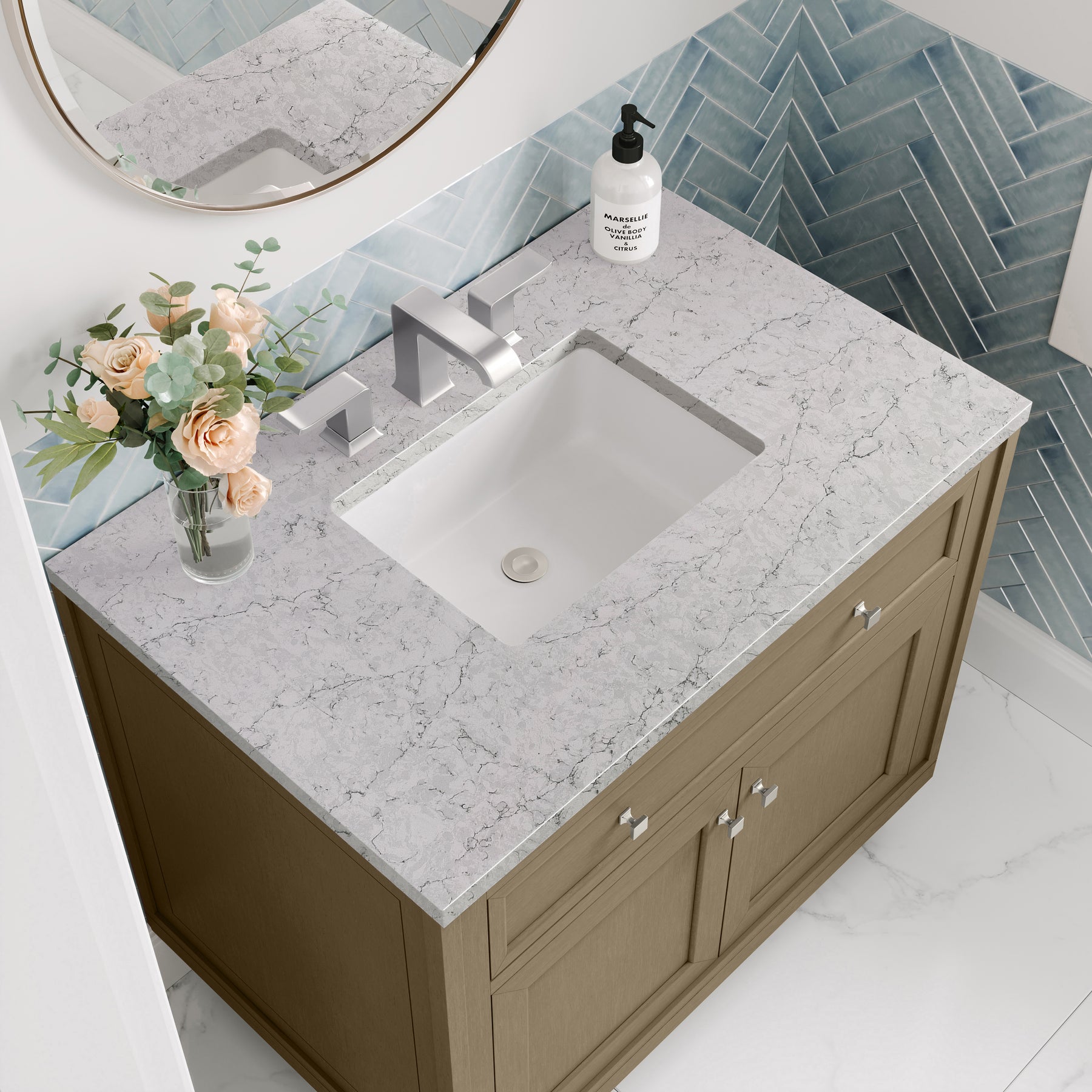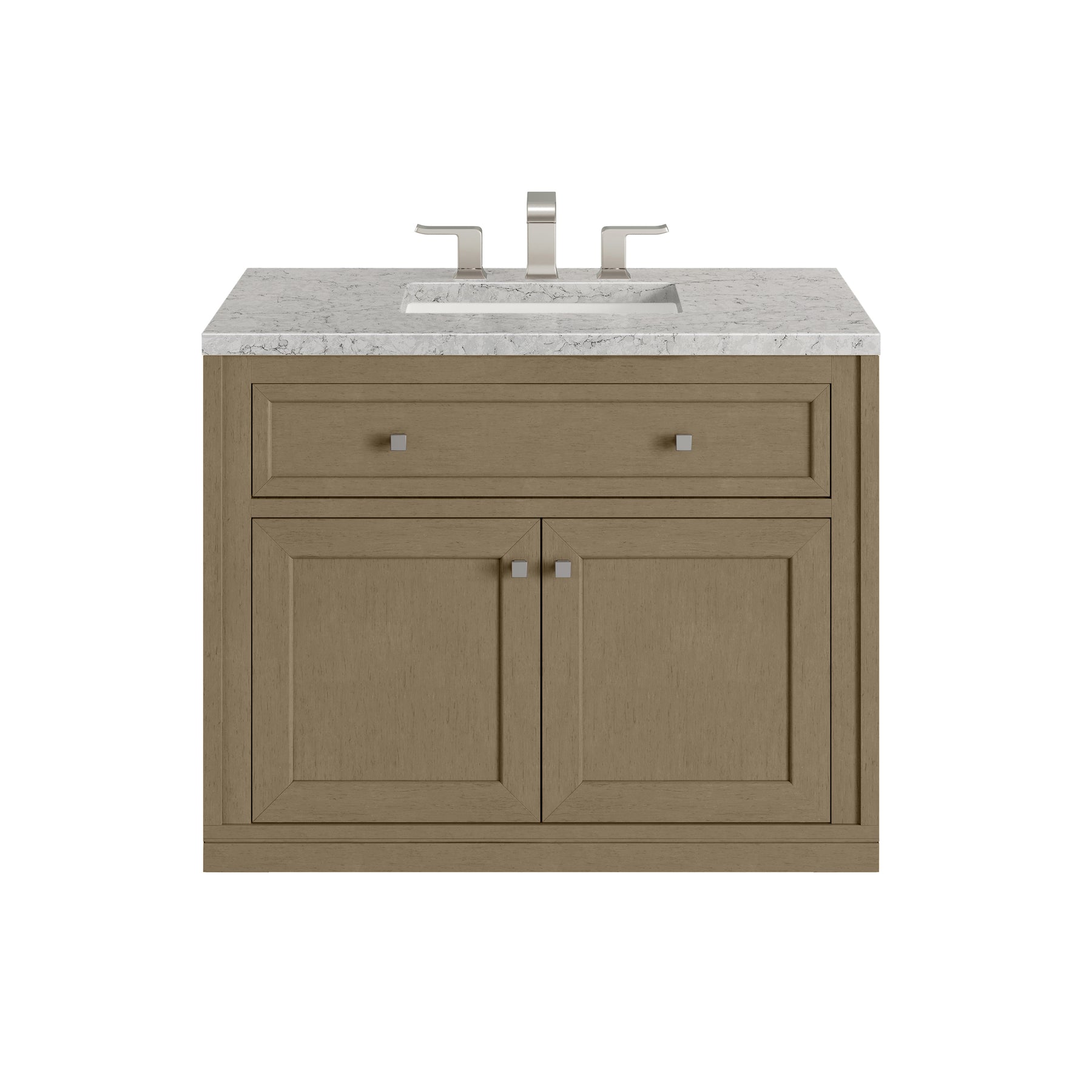 The sophisticated details and clean lines of the Chicago 36" Single Vanity by James Martin Vanities make it the perfect choice for any bathroom. Featuring a Walnut Whisper finish, this vanity offers ample storage with its two-door cabinet, adjustable interior shelf, and top-row tip-out drawer. Brushed Nickel knobs and legs add a contemporary touch; or choose to forego the metal legs for a modern wall-mounted installation. The addition of a beautiful Eternal Jasmine Pearl SilestoneĀ® top with undermount sink completes the look.