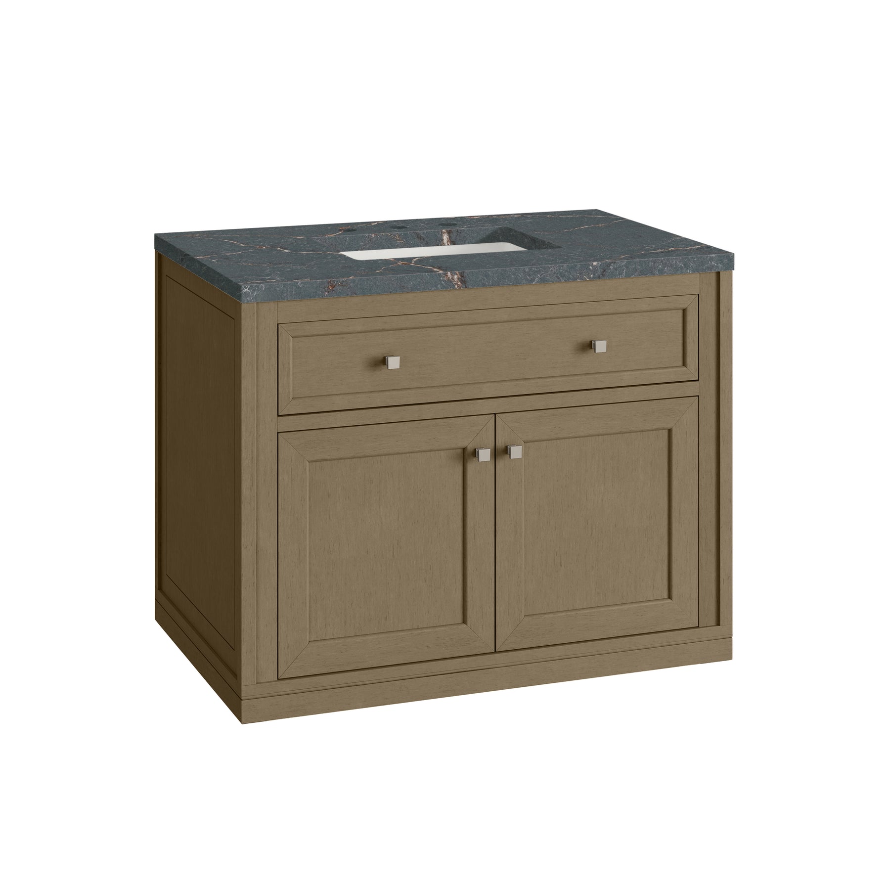 The sophisticated details and clean lines of the Chicago 36" Single Vanity by James Martin Vanities make it the perfect choice for any bathroom. Featuring a Walnut Whisper finish, this vanity offers ample storage with its two-door cabinet, adjustable interior shelf, and top-row tip-out drawer. Brushed Nickel knobs and legs add a contemporary touch; or choose to forego the metal legs for a modern wall-mounted installation. The addition of a stunning Parisien Bleu SilestoneĀ® top with undermount sink completes the look.