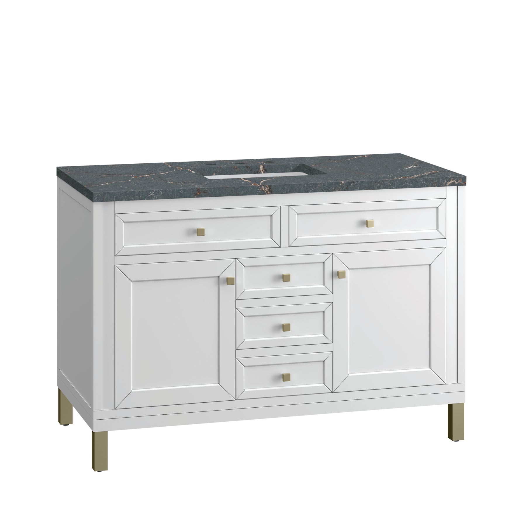 The sophisticated details and clean lines of the Chicago 48" Single Vanity by James Martin Vanities make it the perfect choice for any bathroom. Featuring a Glossy White finish, this vanity offers ample storage with its two single-door cabinets, adjustable interior shelves, and four drawers (three standard; one double-deep). Champagne Brass knobs and legs add a contemporary touch; or choose to forego the metal legs for a modern wall-mounted installation. The addition of a stunning Parisien Bleu SilestoneĀ® top with undermount sink completes the look.