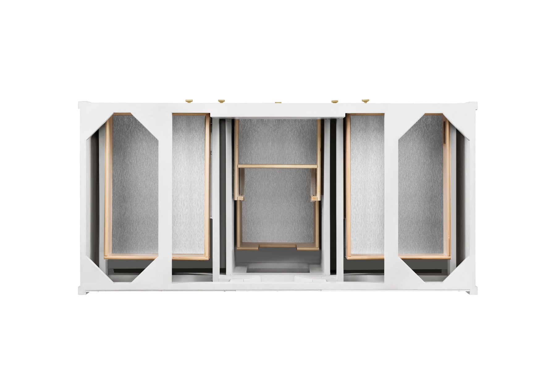 The sophisticated details and clean lines of the Chicago 48" Single Vanity by James Martin Vanities make it the perfect choice for any bathroom. Featuring a Glossy White finish, this vanity offers ample storage with its two single-door cabinets, adjustable interior shelves, and four drawers (three standard; one double-deep). Champagne Brass knobs and legs add a contemporary touch; or choose to forego the metal legs for a modern wall-mounted installation. A classic White Zeus SilestoneĀ® top and backsplash with undermount sink completes the look with a contemporary touch.