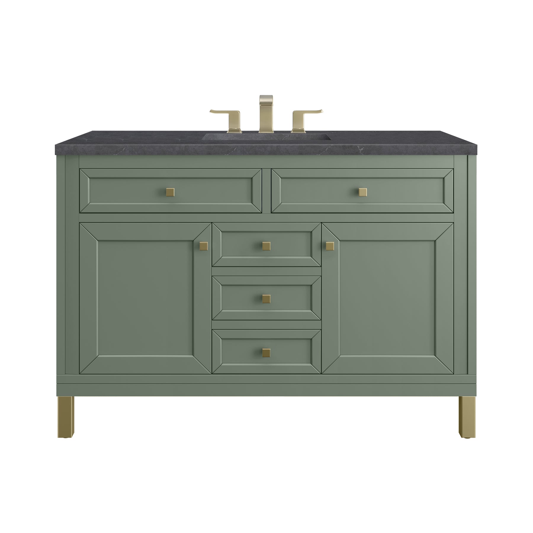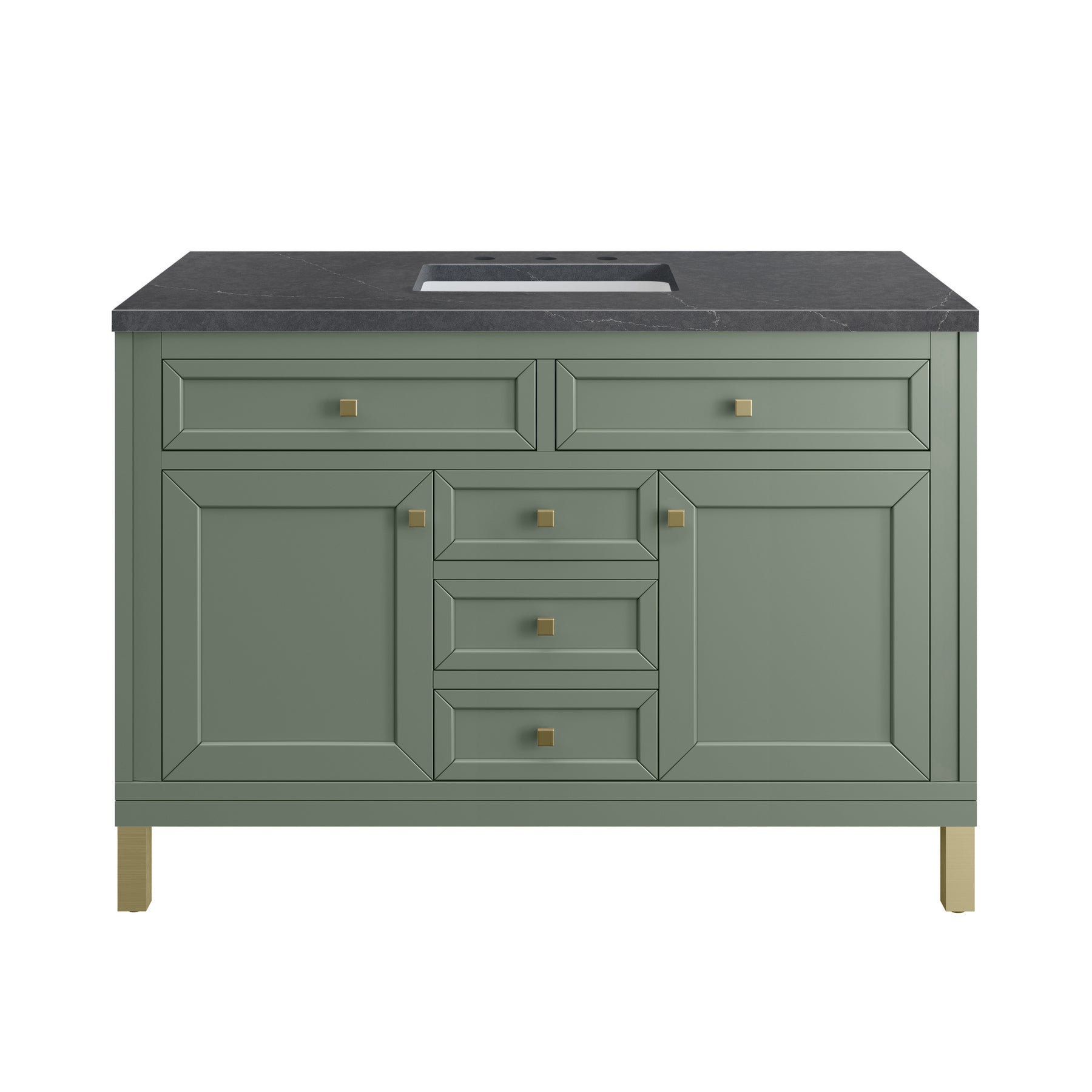 The sophisticated details and clean lines of the Chicago 48" Single Vanity by James Martin Vanities make it the perfect choice for any bathroom. Featuring a Smokey Celadon finish, this vanity offers ample storage with its two single-door cabinets, adjustable interior shelves, and four drawers (three standard; one double-deep). Champagne Brass knobs and legs add a contemporary touch; or choose to forego the metal legs for a modern wall-mounted installation. The addition of a matte Charcoal Soapstone SilestoneĀ® top with undermount sink completes the look.
