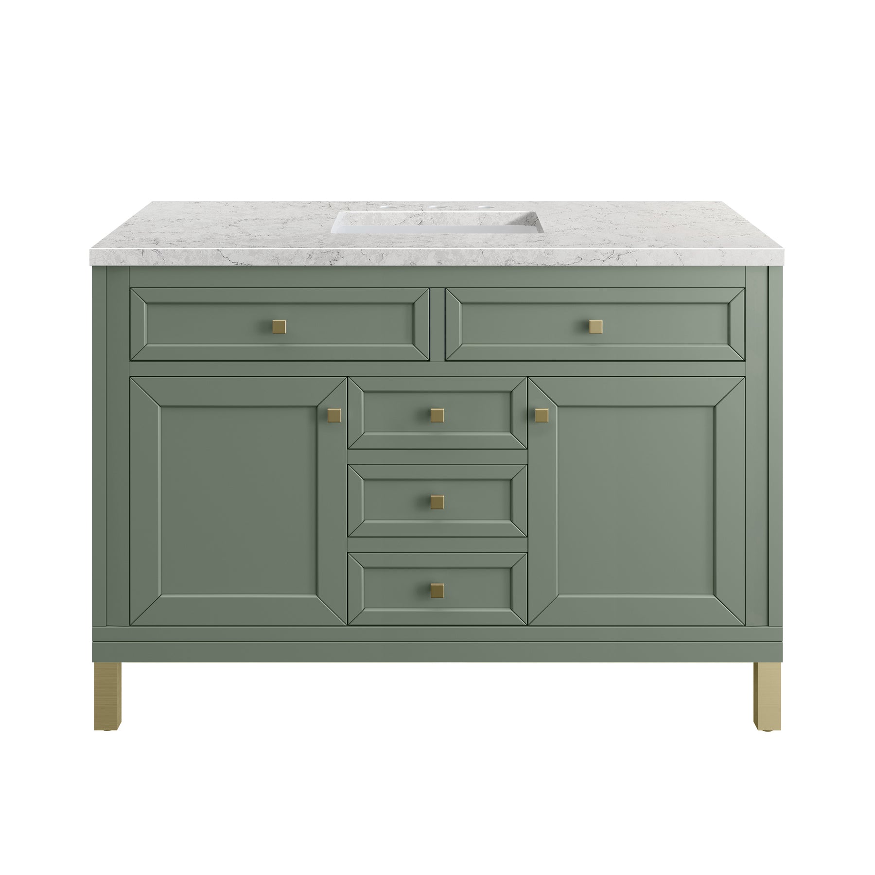 The sophisticated details and clean lines of the Chicago 48" Single Vanity by James Martin Vanities make it the perfect choice for any bathroom. Featuring a Smokey Celadon finish, this vanity offers ample storage with its two single-door cabinets, adjustable interior shelves, and four drawers (three standard; one double-deep). Champagne Brass knobs and legs add a contemporary touch; or choose to forego the metal legs for a modern wall-mounted installation. The addition of a beautiful Eternal Jasmine Pearl SilestoneĀ® top with undermount sink completes the look.