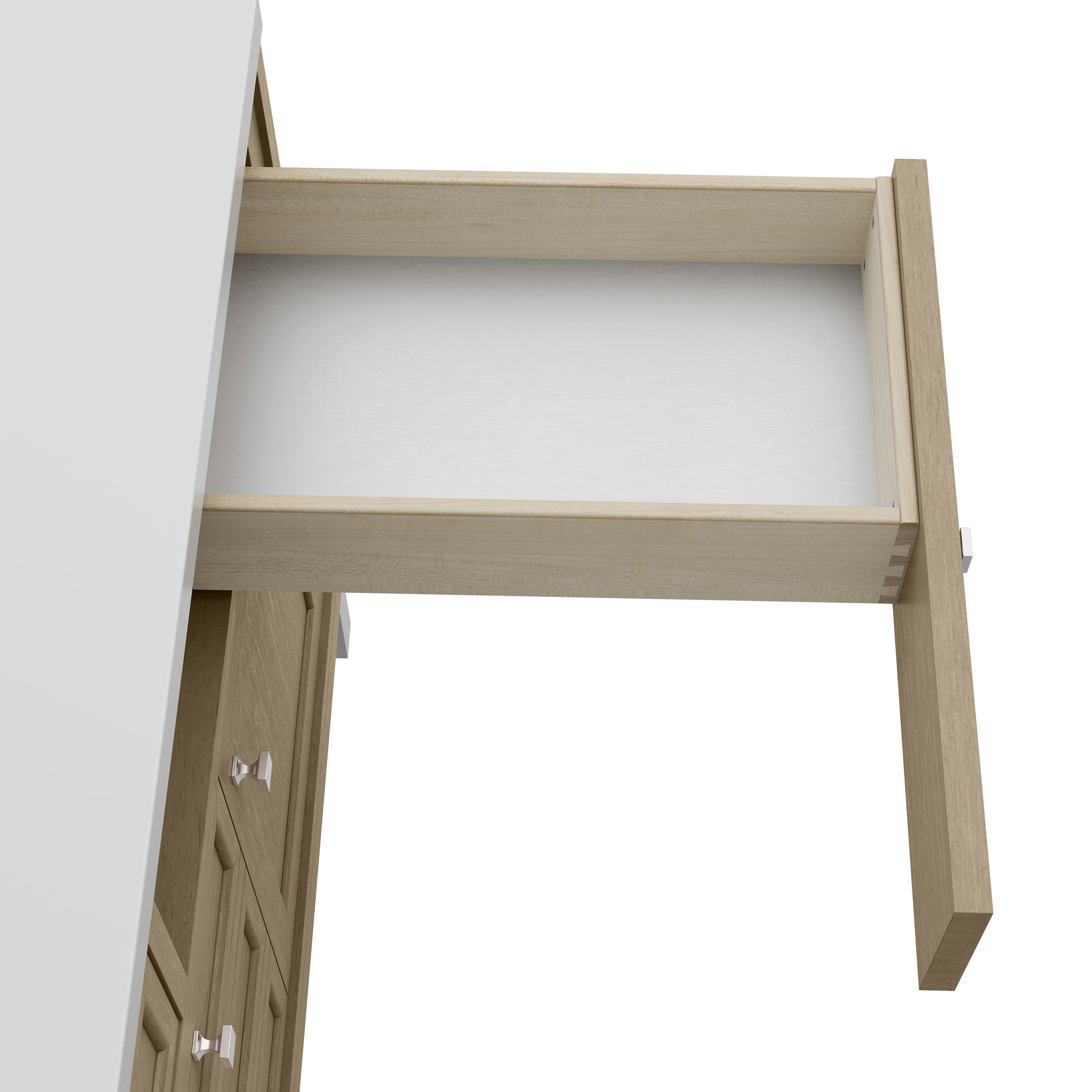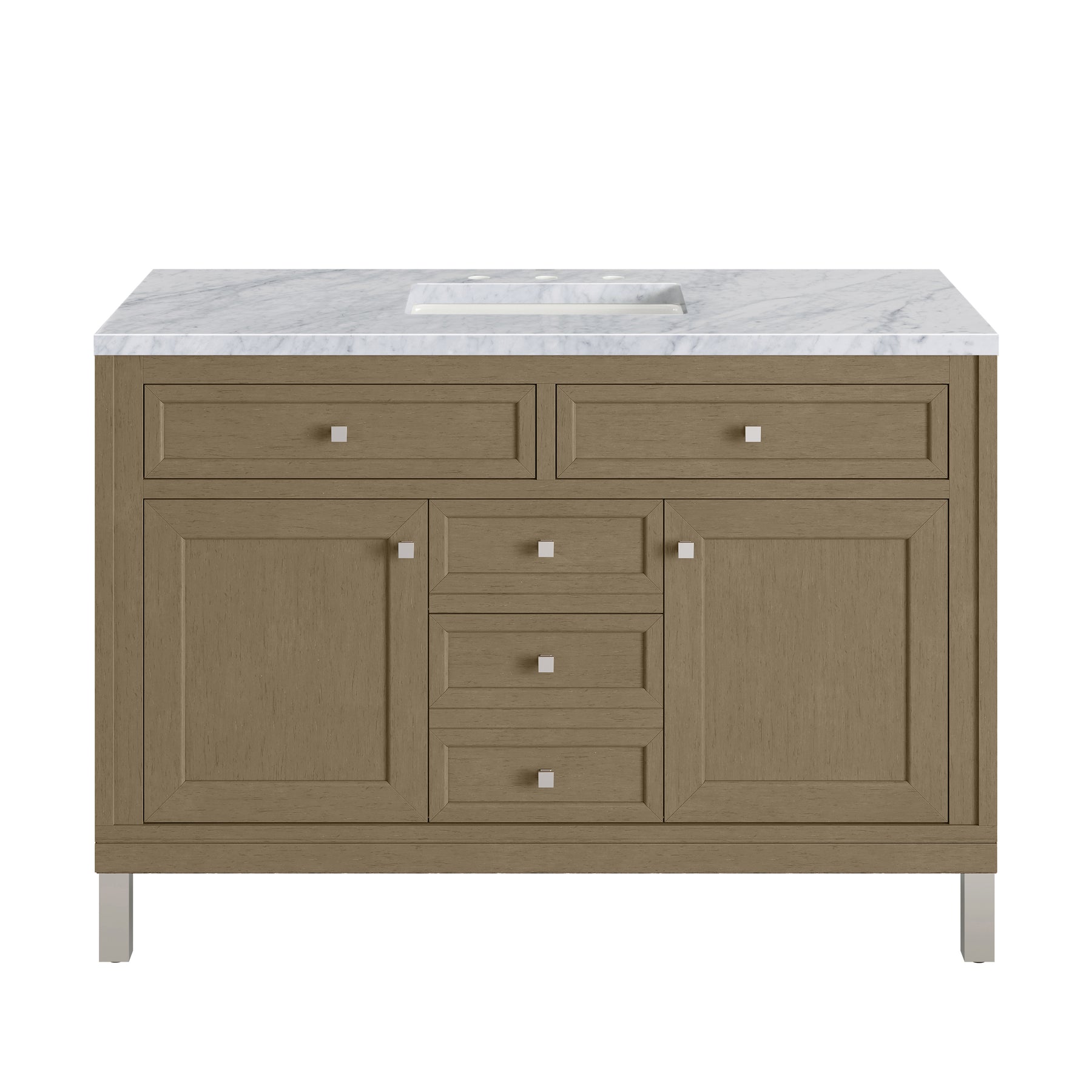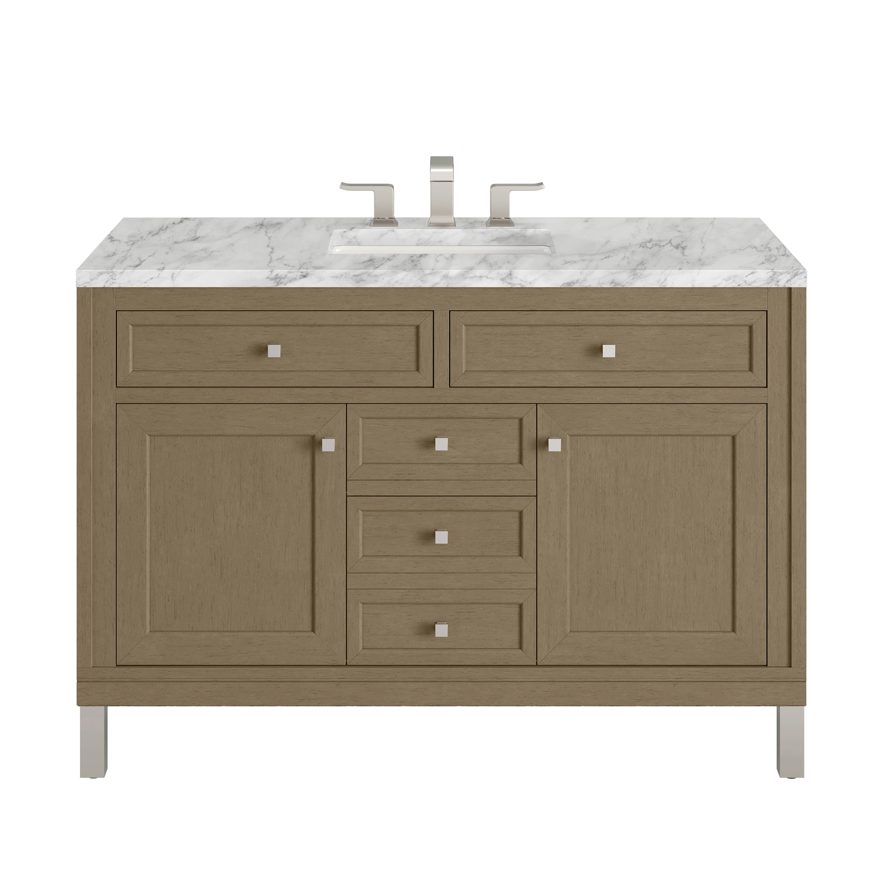 The sophisticated details and clean lines of the Chicago 48" Single Vanity by James Martin Vanities make it the perfect choice for any bathroom. Featuring a Walnut Whisper finish, this vanity offers ample storage with its two single-door cabinets, adjustable interior shelves, and four drawers (three standard; one double-deep). Brushed Nickel knobs and legs add a contemporary touch; or choose to forego the metal legs for a modern wall-mounted installation. The addition of a Carrara White Marble top with undermount sink completes the look.