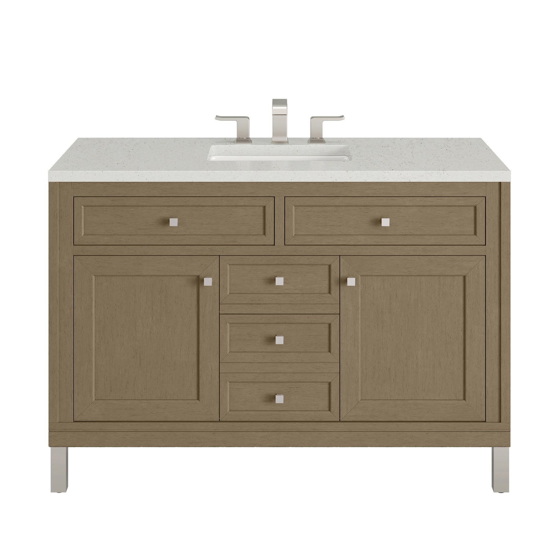 The sophisticated details and clean lines of the Chicago 48" Single Vanity by James Martin Vanities make it the perfect choice for any bathroom. Featuring a Walnut Whisper finish, this vanity offers ample storage with its two single-door cabinets, adjustable interior shelves, and four drawers (three standard; one double-deep). Brushed Nickel knobs and legs add a contemporary touch; or choose to forego the metal legs for a modern wall-mounted installation. The addition of a matte Limestone Delight SilestoneĀ® top with undermount sink completes the look.