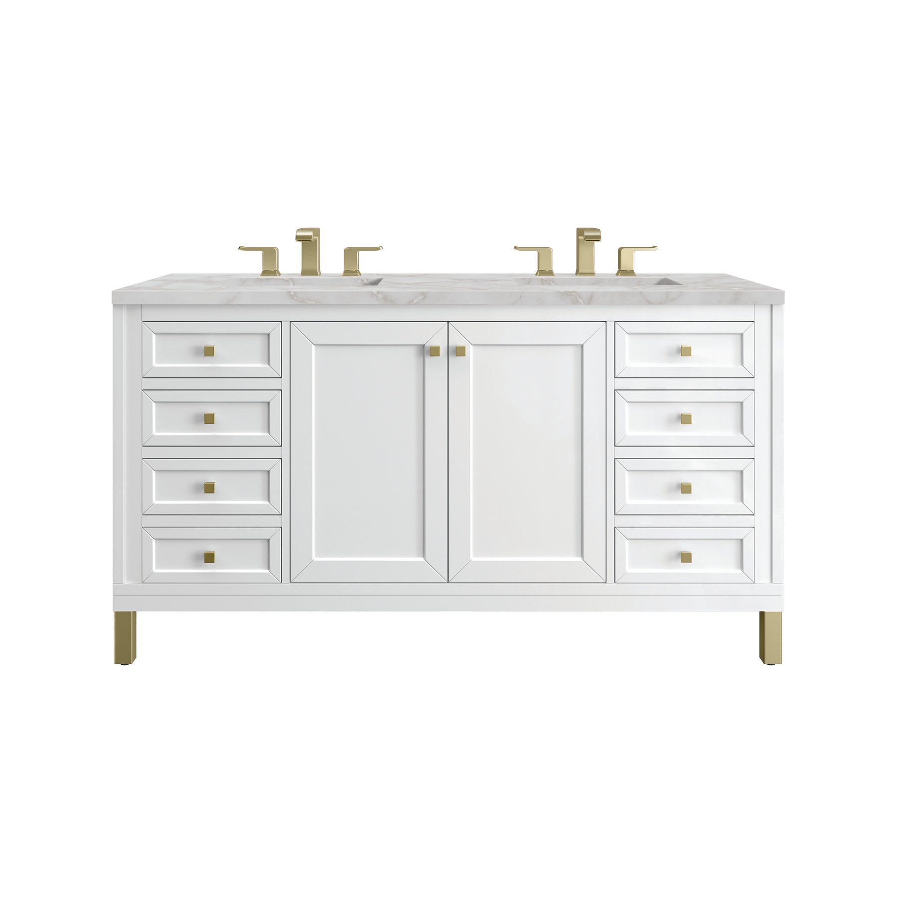The sophisticated details and clean lines of the Chicago 60" Double Vanity by James Martin Vanities make it the perfect choice for any bathroom. Featuring a Glossy White finish, this vanity offers ample storage with its double-door cabinets, adjustable interior shelves, and six drawers (two tip-outs, two standard, two double-deep). Champagne Brass knobs and legs add a contemporary touch; or choose to forego the metal legs for a modern wall-mounted installation. The addition of a beautiful Victorian Silver SilestoneĀ® top with undermount sinks completes the look.