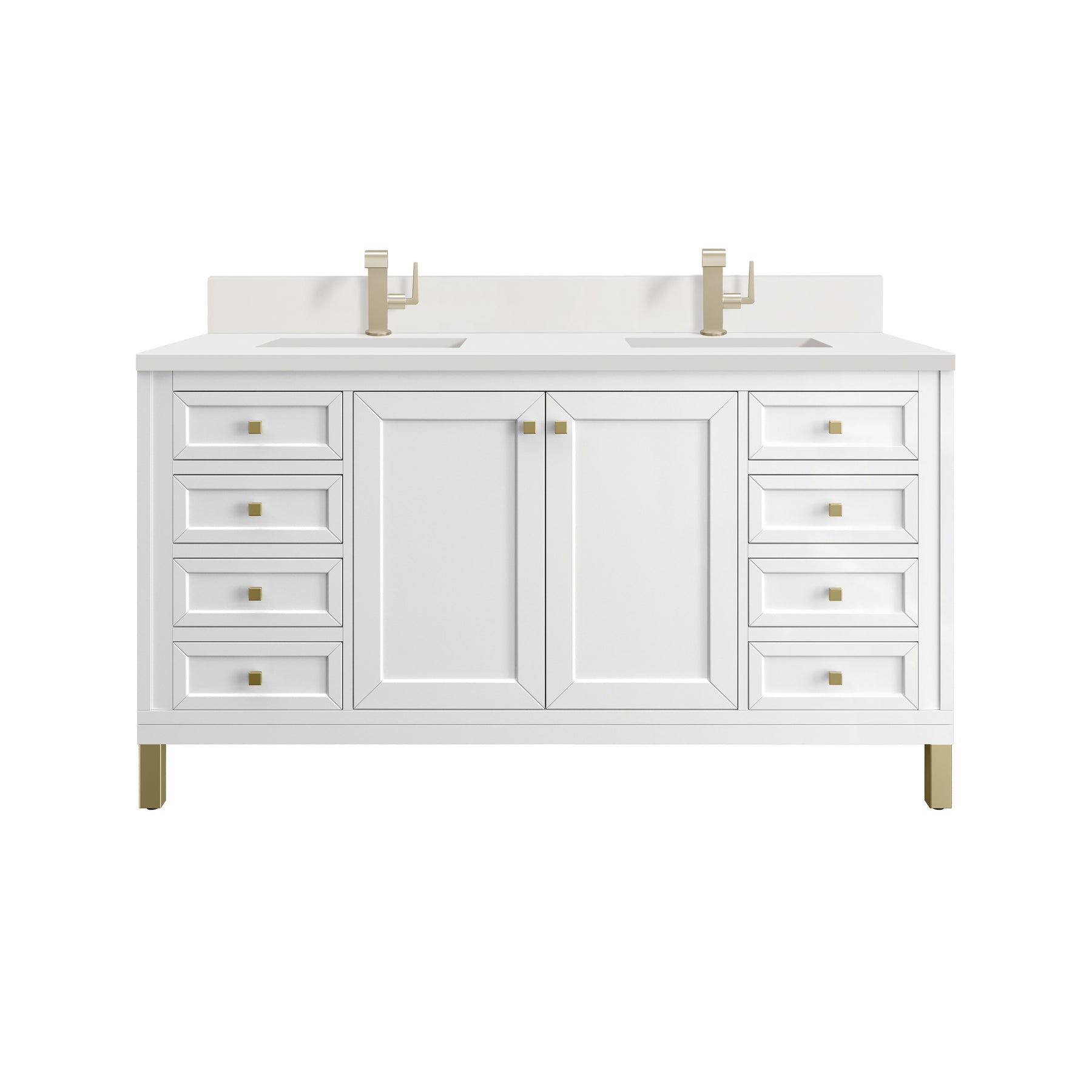The sophisticated details and clean lines of the Chicago 60" Double Vanity by James Martin Vanities make it the perfect choice for any bathroom. Featuring a Glossy White finish, this vanity offers ample storage with its double-door cabinets, adjustable interior shelves, and six drawers (two tip-outs, two standard, two double-deep). Champagne Brass knobs and legs add a contemporary touch; or choose to forego the metal legs for a modern wall-mounted installation. A classic White Zeus SilestoneĀ® top and backsplash with undermount sinks completes the look with a contemporary touch.