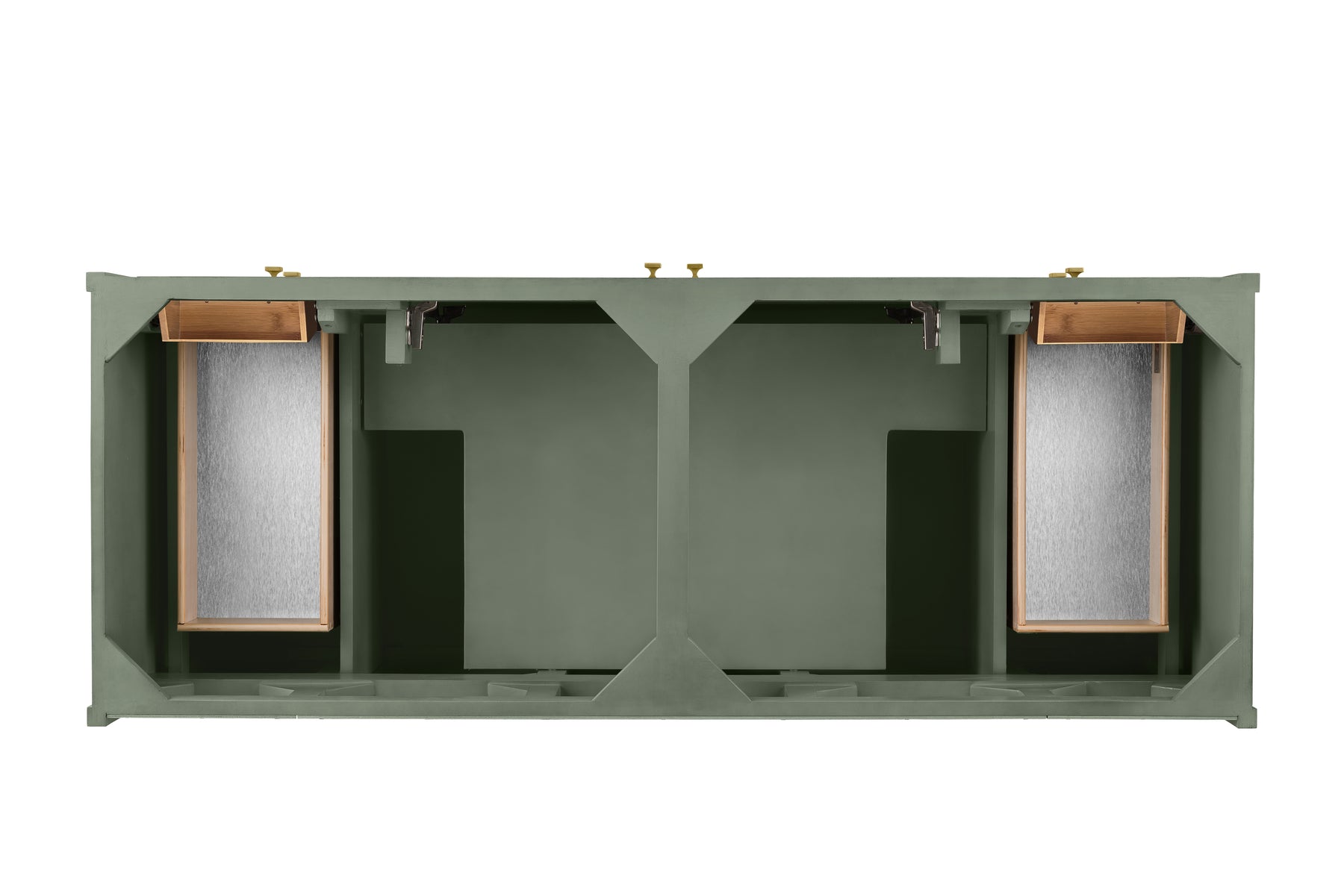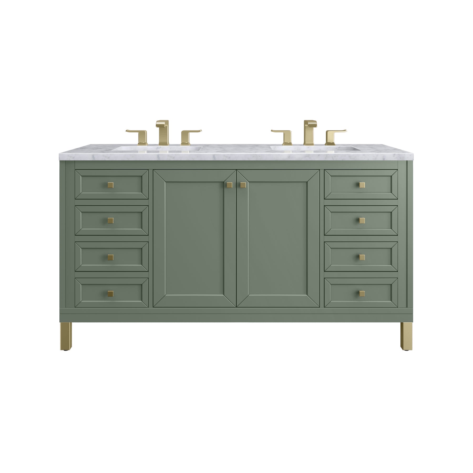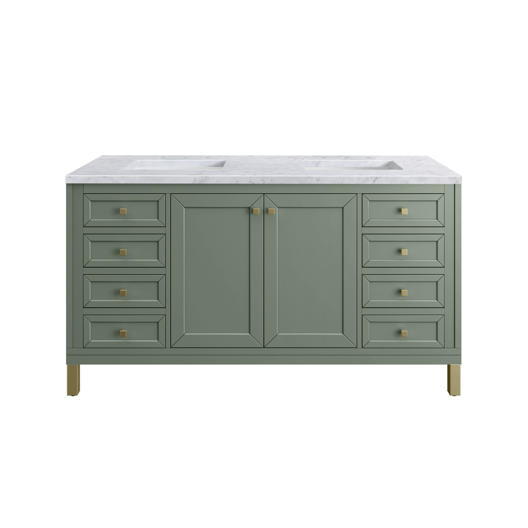 The sophisticated details and clean lines of the Chicago 60" Double Vanity by James Martin Vanities make it the perfect choice for any bathroom. Featuring a Smokey Celadon finish, this vanity offers ample storage with its double-door cabinets, adjustable interior shelves, and six drawers (two tip-outs, two standard, two double-deep). Champagne Brass knobs and legs add a contemporary touch; or choose to forego the metal legs for a modern wall-mounted installation. The addition of a Carrara White Marble top with undermount sinks completes the look.