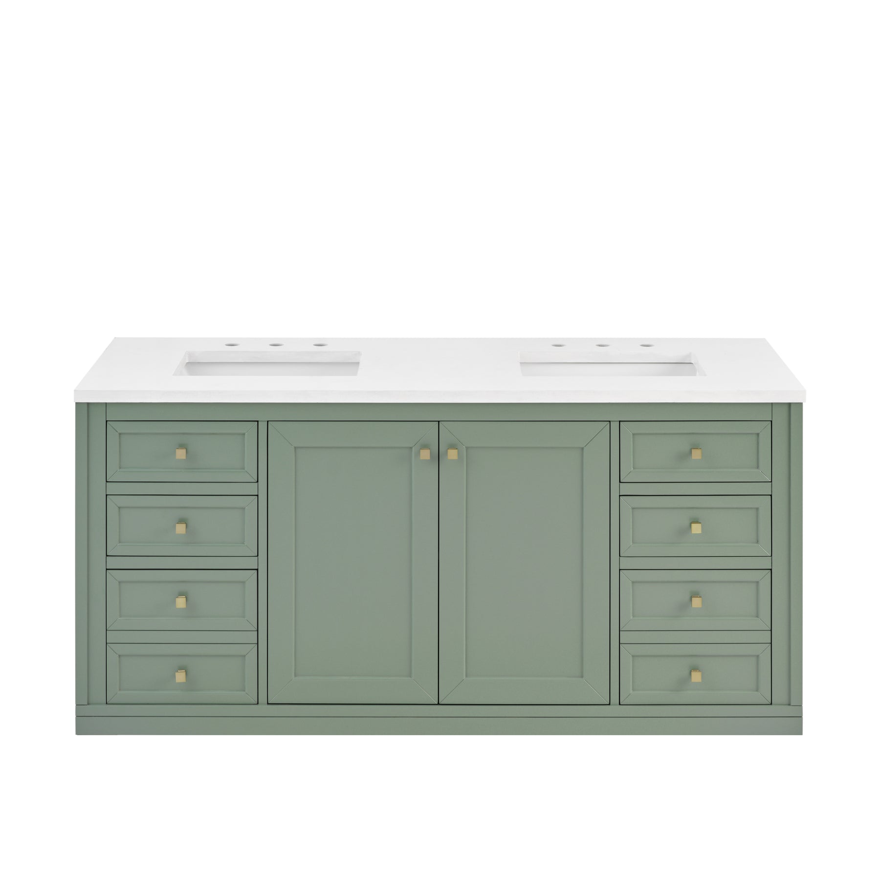The sophisticated details and clean lines of the Chicago 60" Double Vanity by James Martin Vanities make it the perfect choice for any bathroom. Featuring a Smokey Celadon finish, this vanity offers ample storage with its double-door cabinets, adjustable interior shelves, and six drawers (two tip-outs, two standard, two double-deep). Champagne Brass knobs and legs add a contemporary touch; or choose to forego the metal legs for a modern wall-mounted installation. The addition of a classic White Zeus SilestoneĀ® top with undermount sinks completes the look.