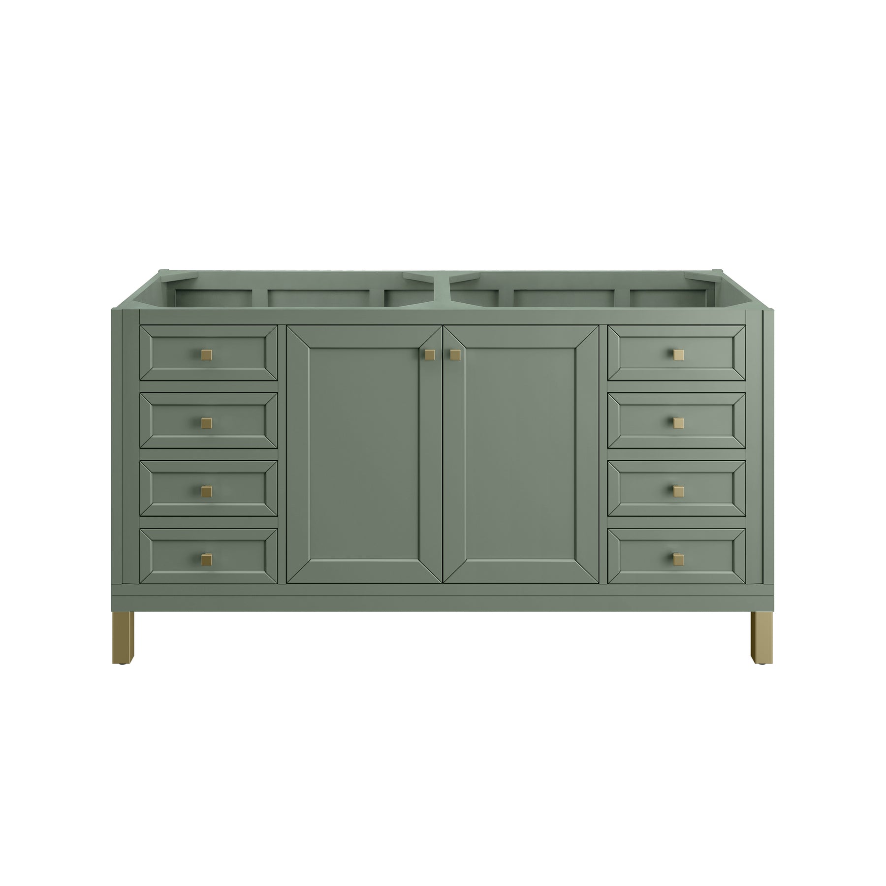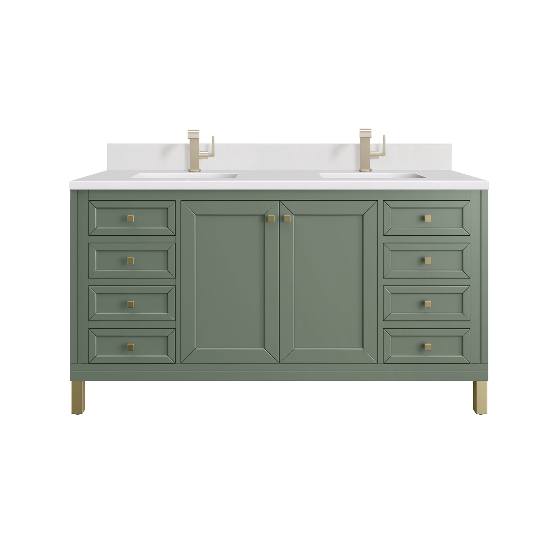 The sophisticated details and clean lines of the Chicago 60" Double Vanity by James Martin Vanities make it the perfect choice for any bathroom. Featuring a Smokey Celadon finish, this vanity offers ample storage with its double-door cabinets, adjustable interior shelves, and six drawers (two tip-outs, two standard, two double-deep). Champagne Brass knobs and legs add a contemporary touch; or choose to forego the metal legs for a modern wall-mounted installation. A classic White Zeus SilestoneĀ® top and backsplash with undermount sinks completes the look with a contemporary touch.