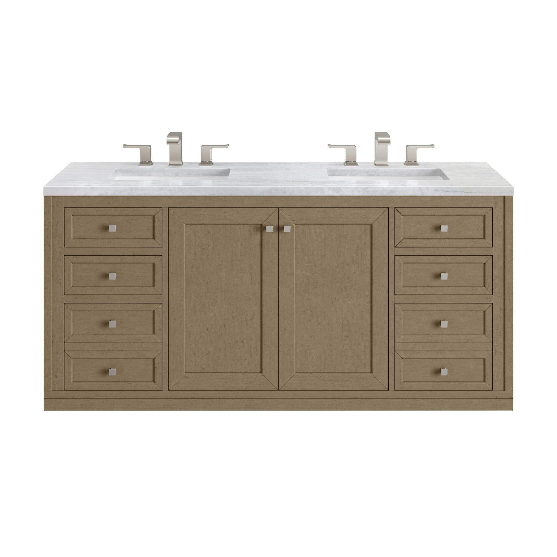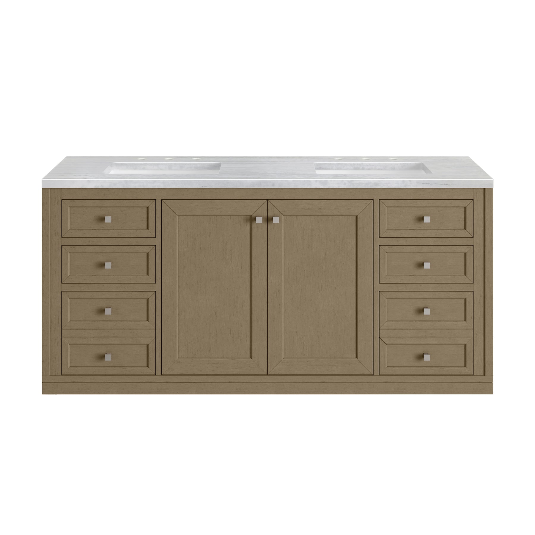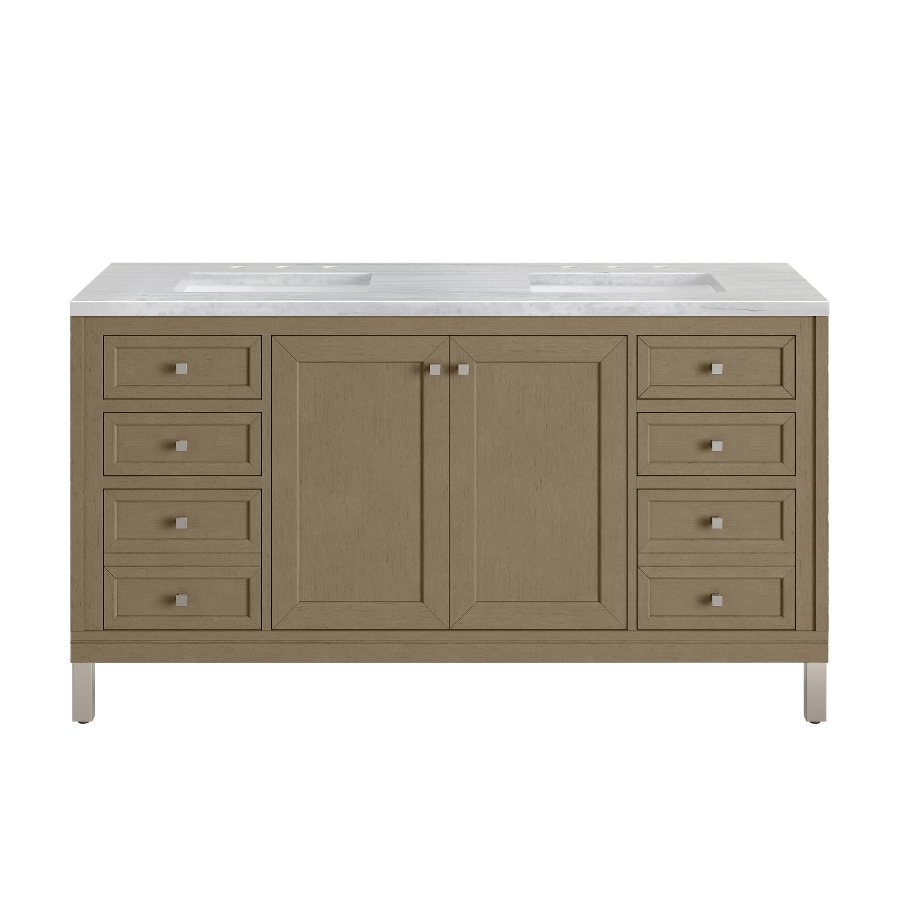 The sophisticated details and clean lines of the Chicago 60" Double Vanity by James Martin Vanities make it the perfect choice for any bathroom. Featuring a Walnut Whisper finish, this vanity offers ample storage with its double-door cabinets, adjustable interior shelves, and six drawers (two tip-outs, two standard, two double-deep). Brushed Nickel knobs and legs add a contemporary touch; or choose to forego the metal legs for a modern wall-mounted installation. The addition of a modern Arctic Fall Solid Surface top with undermount sinks completes the look.