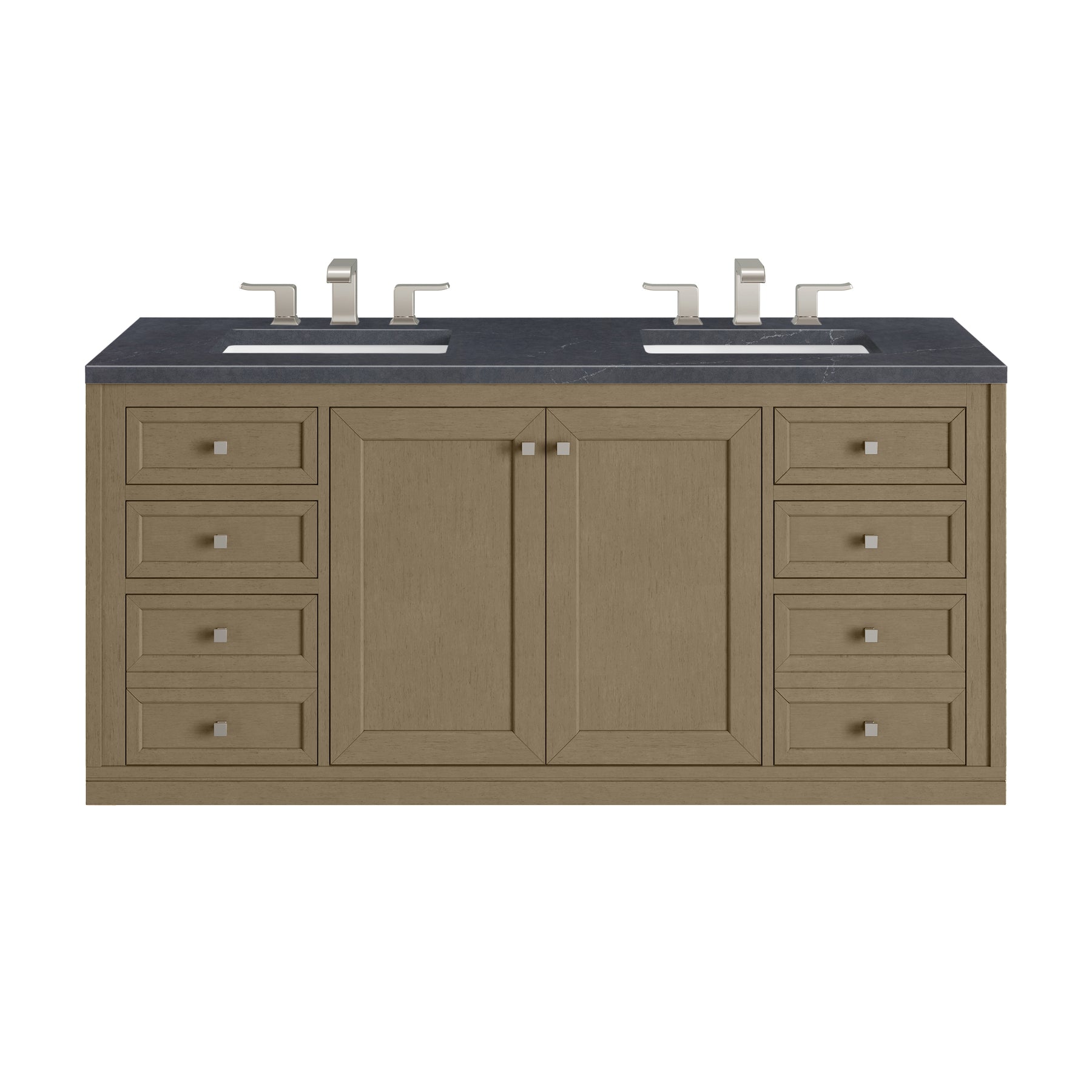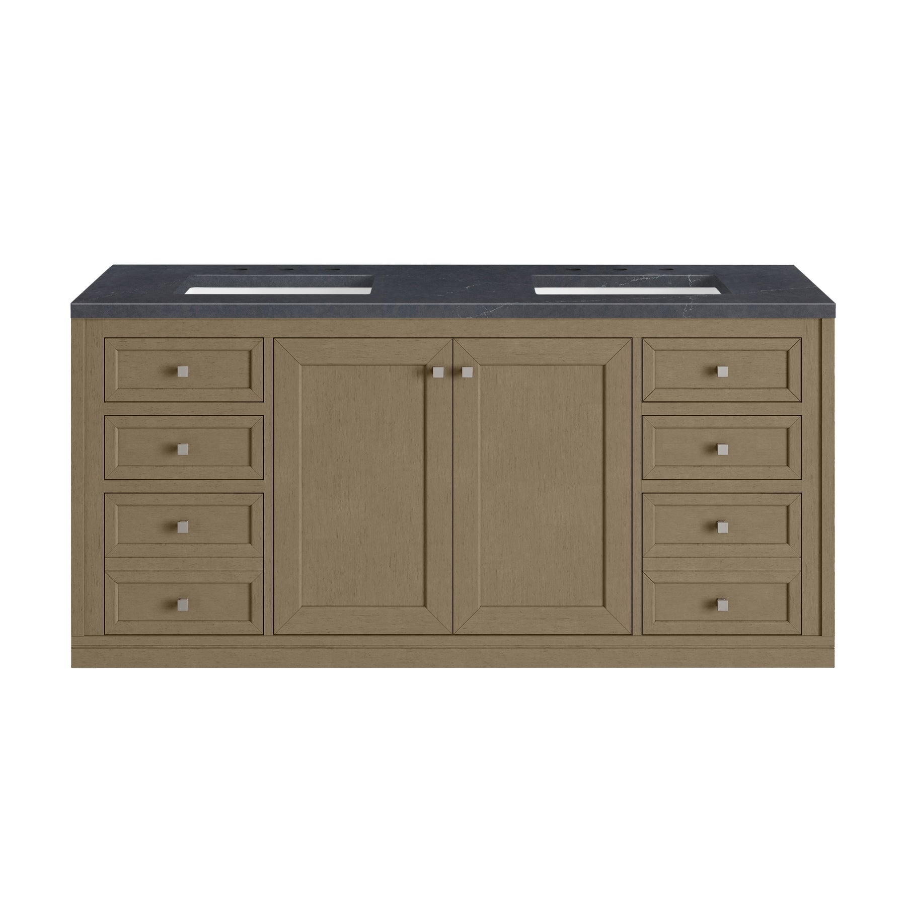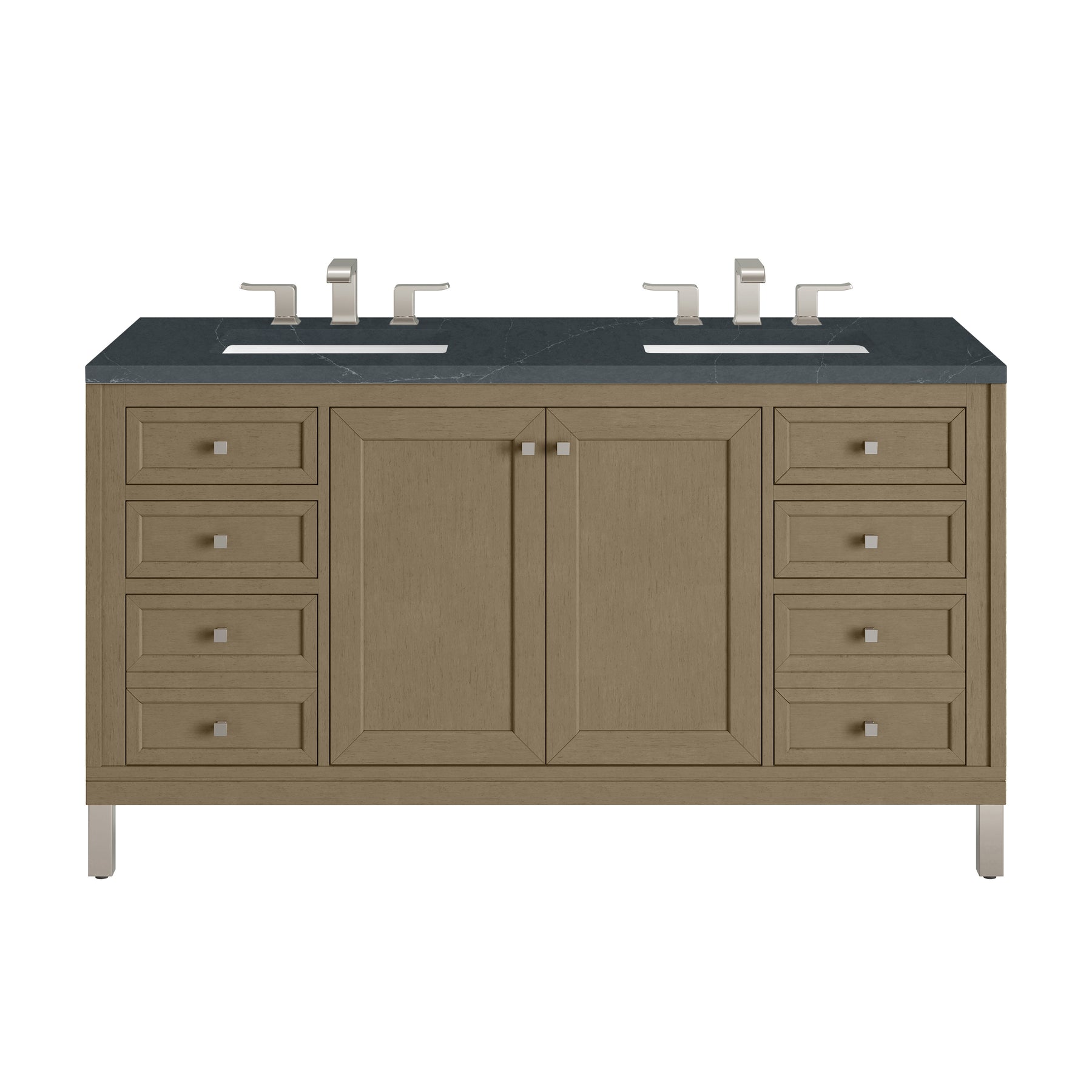 The sophisticated details and clean lines of the Chicago 60" Double Vanity by James Martin Vanities make it the perfect choice for any bathroom. Featuring a Walnut Whisper finish, this vanity offers ample storage with its double-door cabinets, adjustable interior shelves, and six drawers (two tip-outs, two standard, two double-deep). Brushed Nickel knobs and legs add a contemporary touch; or choose to forego the metal legs for a modern wall-mounted installation. The addition of a matte Charcoal Soapstone SilestoneĀ® top with undermount sinks completes the look.