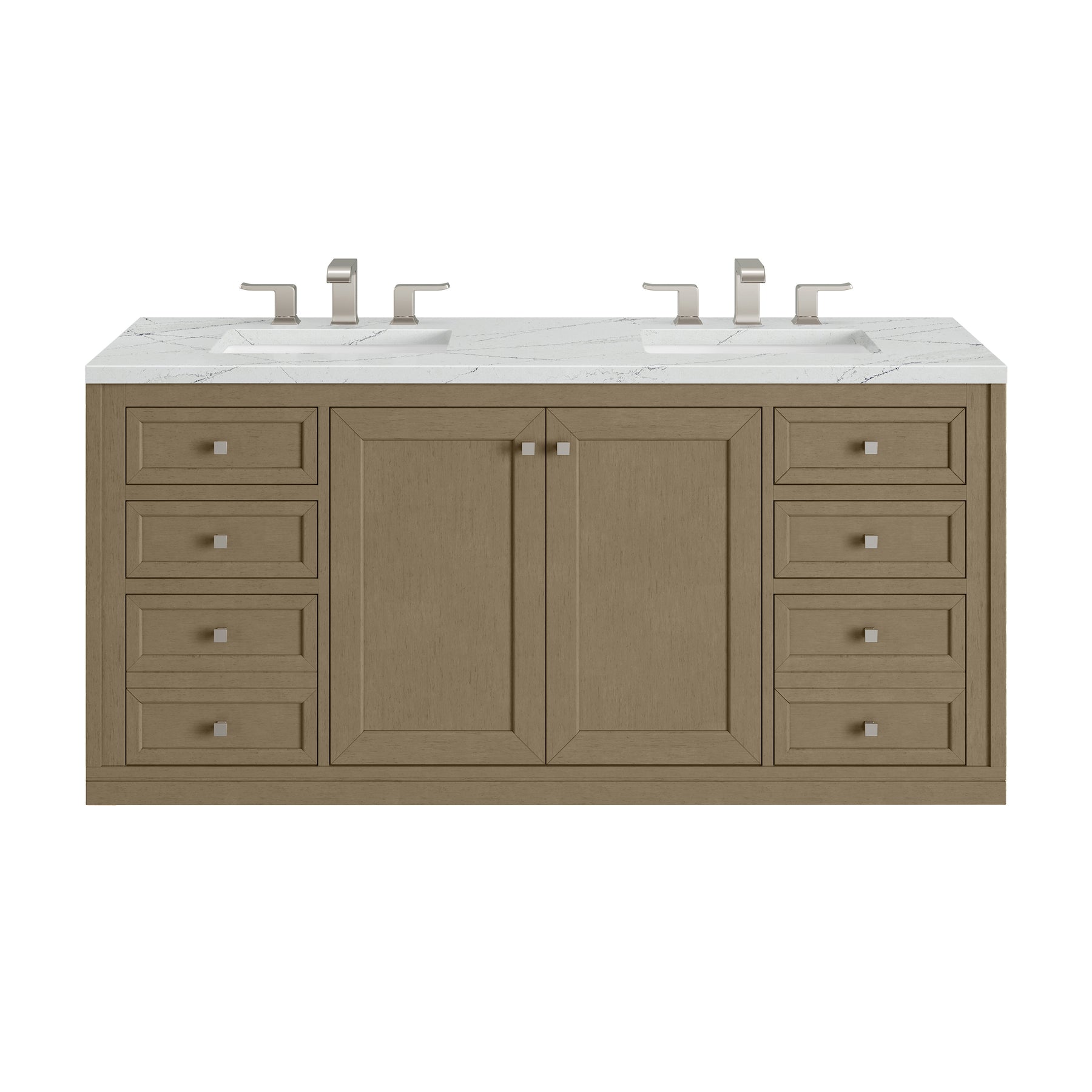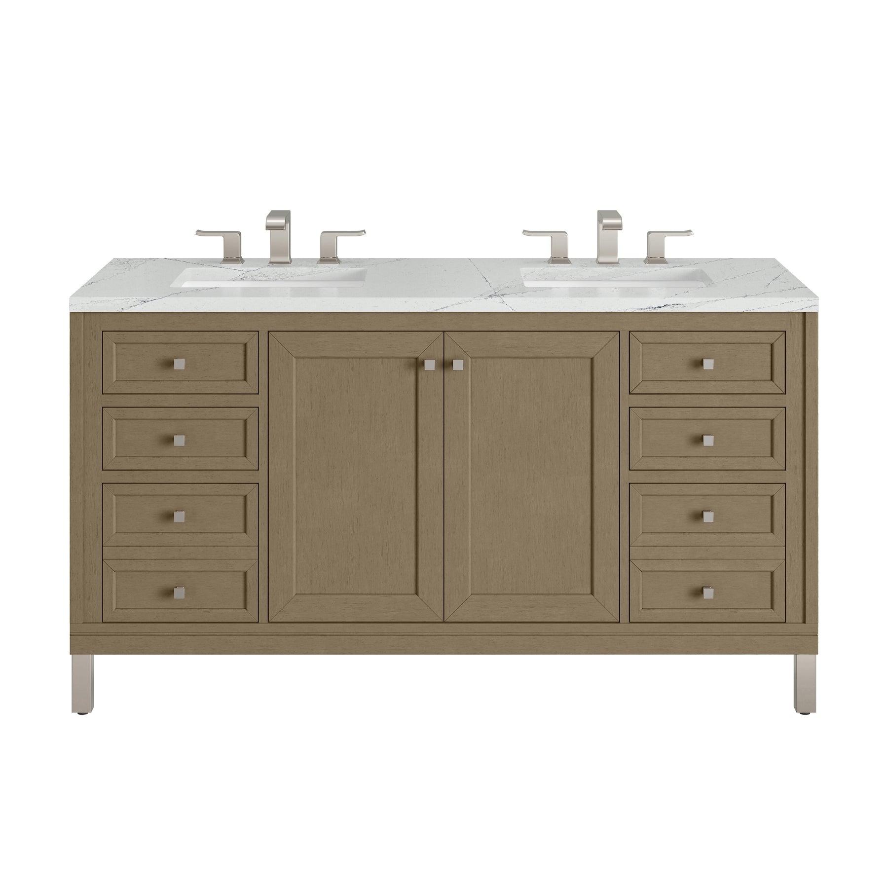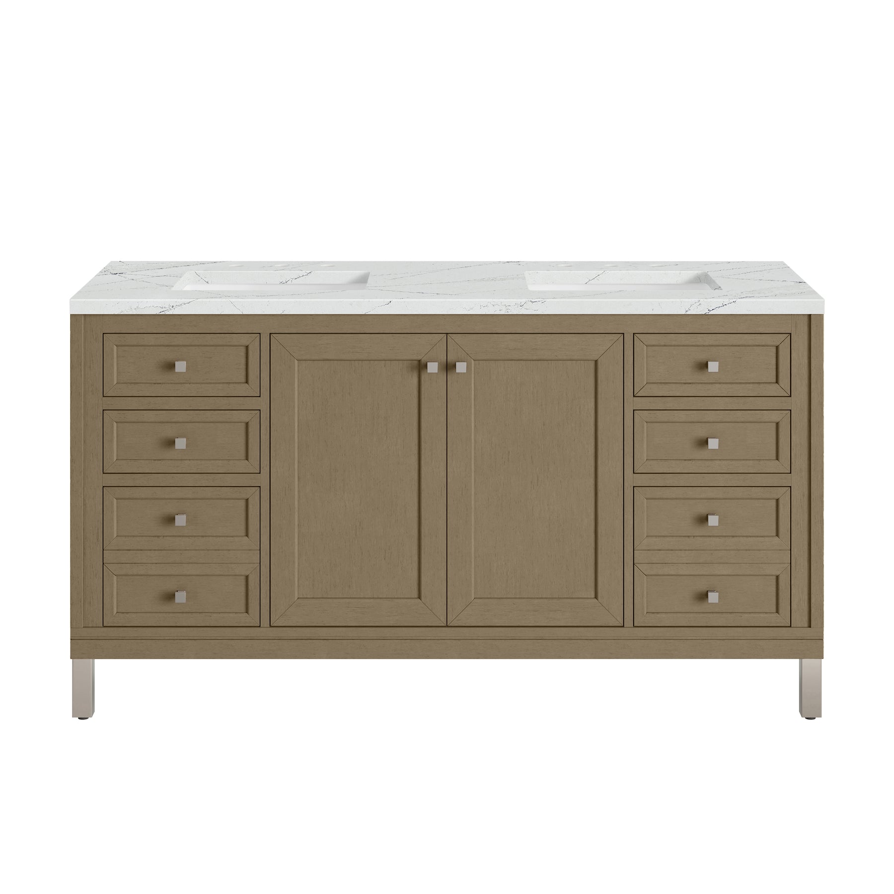 The sophisticated details and clean lines of the Chicago 60" Double Vanity by James Martin Vanities make it the perfect choice for any bathroom. Featuring a Walnut Whisper finish, this vanity offers ample storage with its double-door cabinets, adjustable interior shelves, and six drawers (two tip-outs, two standard, two double-deep). Brushed Nickel knobs and legs add a contemporary touch; or choose to forego the metal legs for a modern wall-mounted installation. The addition of a stunning Ethereal Noctis SilestoneĀ® top with undermount sinks completes the look.