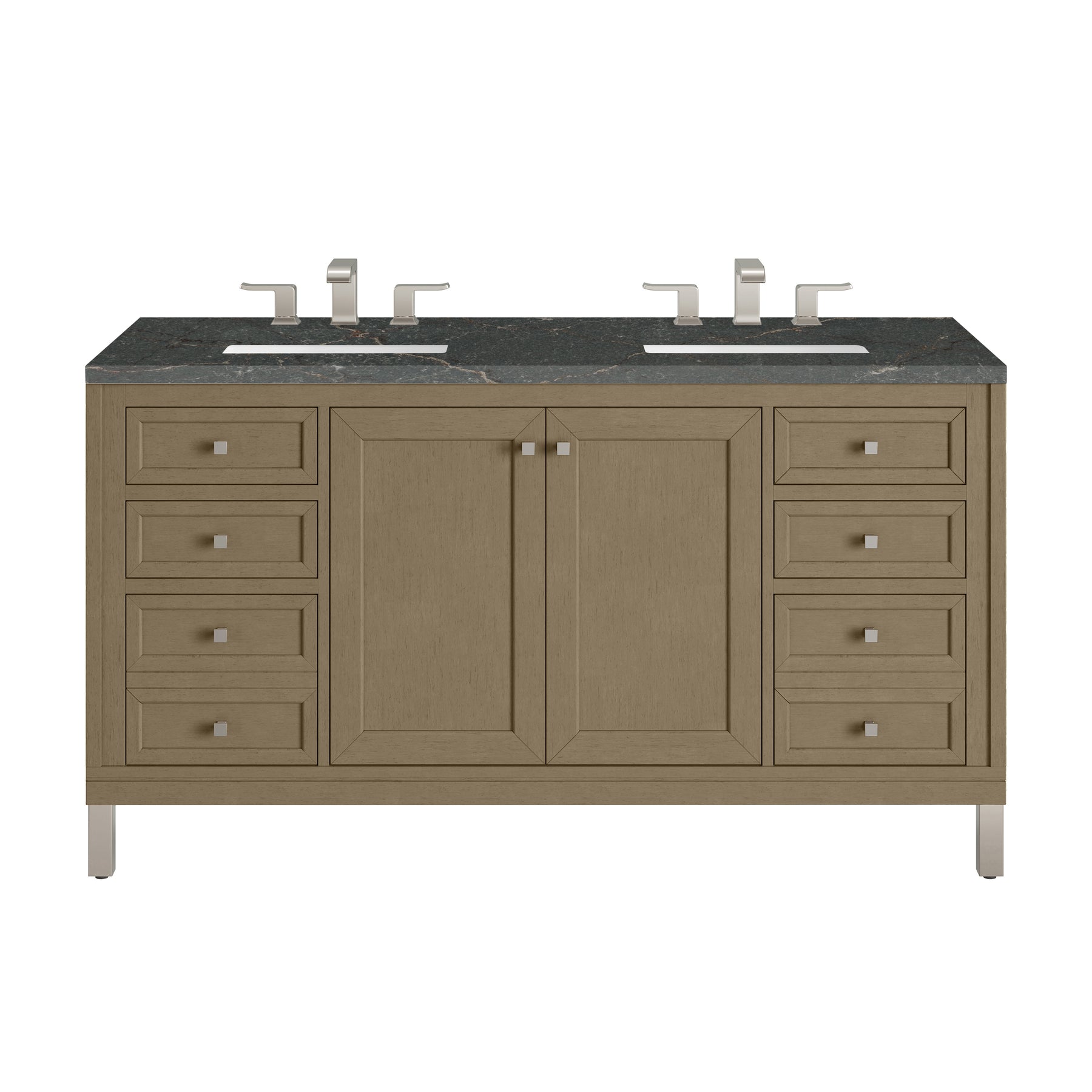 The sophisticated details and clean lines of the Chicago 60" Double Vanity by James Martin Vanities make it the perfect choice for any bathroom. Featuring a Walnut Whisper finish, this vanity offers ample storage with its double-door cabinets, adjustable interior shelves, and six drawers (two tip-outs, two standard, two double-deep). Brushed Nickel knobs and legs add a contemporary touch; or choose to forego the metal legs for a modern wall-mounted installation. The addition of a stunning Parisien Bleu SilestoneĀ® top with undermount sinks completes the look.