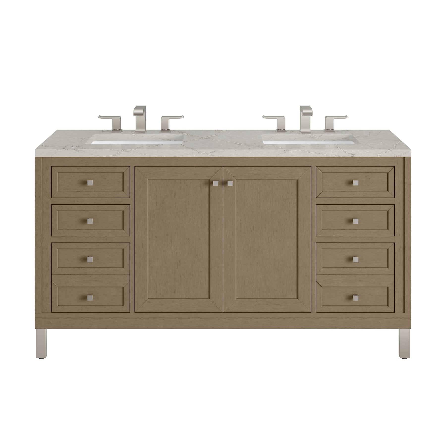 The sophisticated details and clean lines of the Chicago 60" Double Vanity by James Martin Vanities make it the perfect choice for any bathroom. Featuring a Walnut Whisper finish, this vanity offers ample storage with its double-door cabinets, adjustable interior shelves, and six drawers (two tip-outs, two standard, two double-deep). Brushed Nickel knobs and legs add a contemporary touch; or choose to forego the metal legs for a modern wall-mounted installation. The addition of a beautiful Victorian Silver SilestoneĀ® top with undermount sinks completes the look.