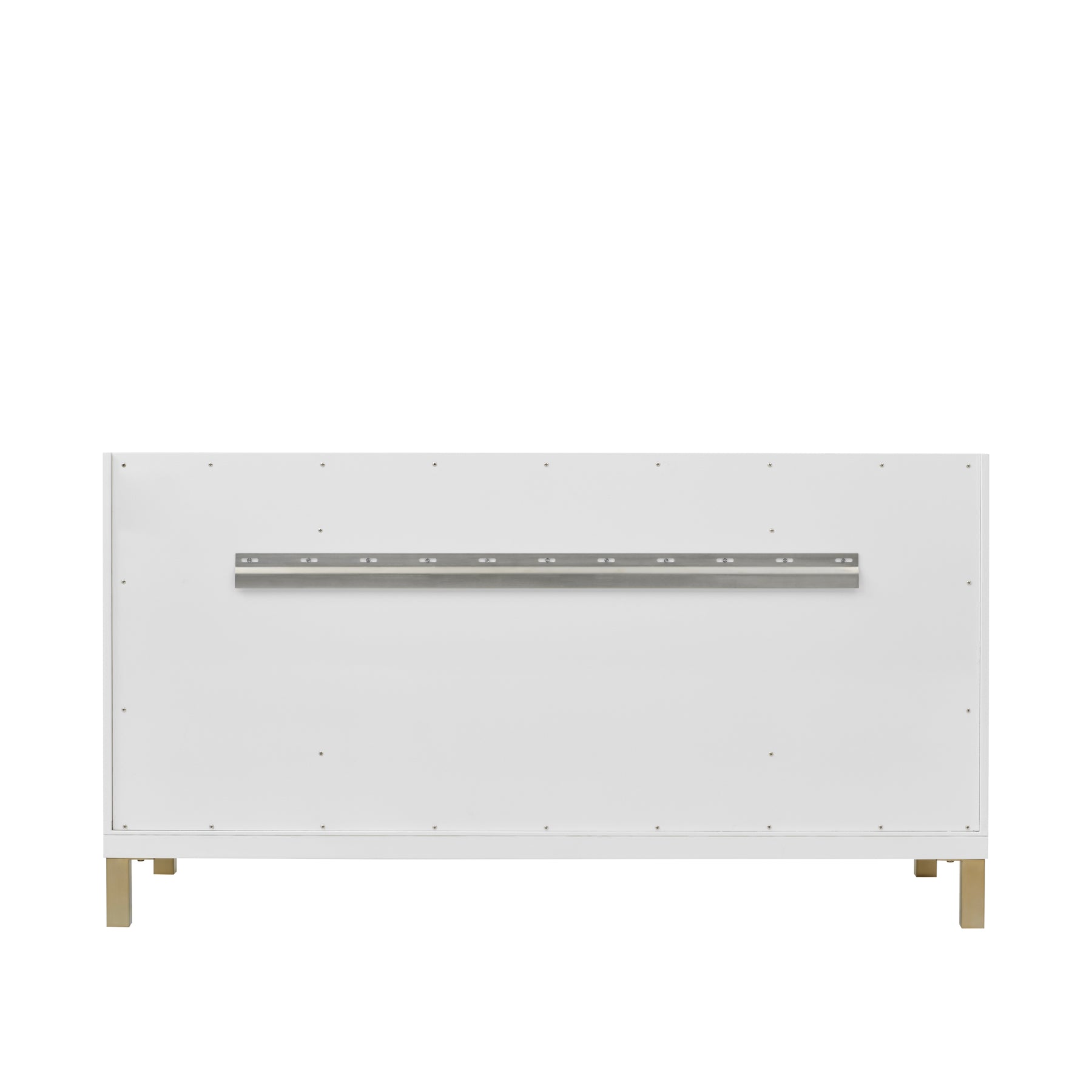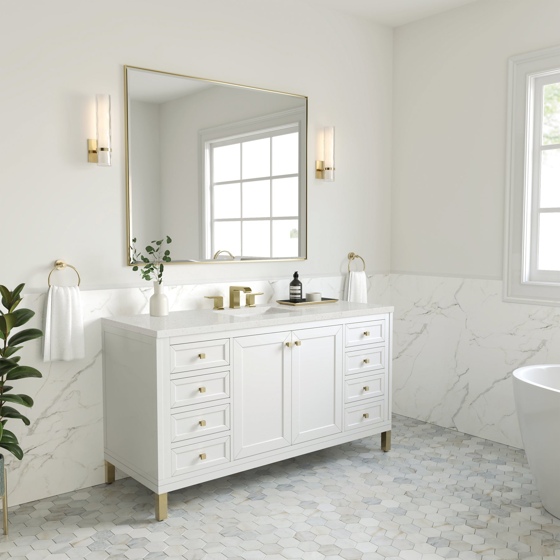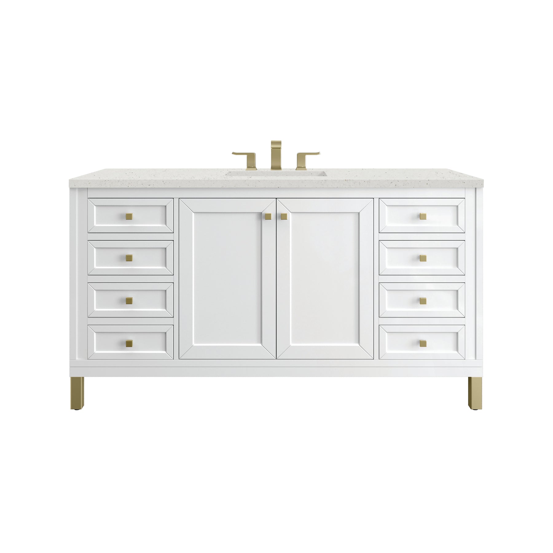 The sophisticated details and clean lines of the Chicago 60" Single Vanity by James Martin Vanities make it the perfect choice for any bathroom. Featuring a Glossy White finish, this vanity offers ample storage with its double-door cabinet, adjustable interior shelves, and six drawers (four standard; two double-deep). Champagne Brass knobs and legs add a contemporary touch; or choose to forego the metal legs for a modern wall-mounted installation. The addition of a matte Limestone Delight SilestoneĀ® top with undermount sink completes the look.