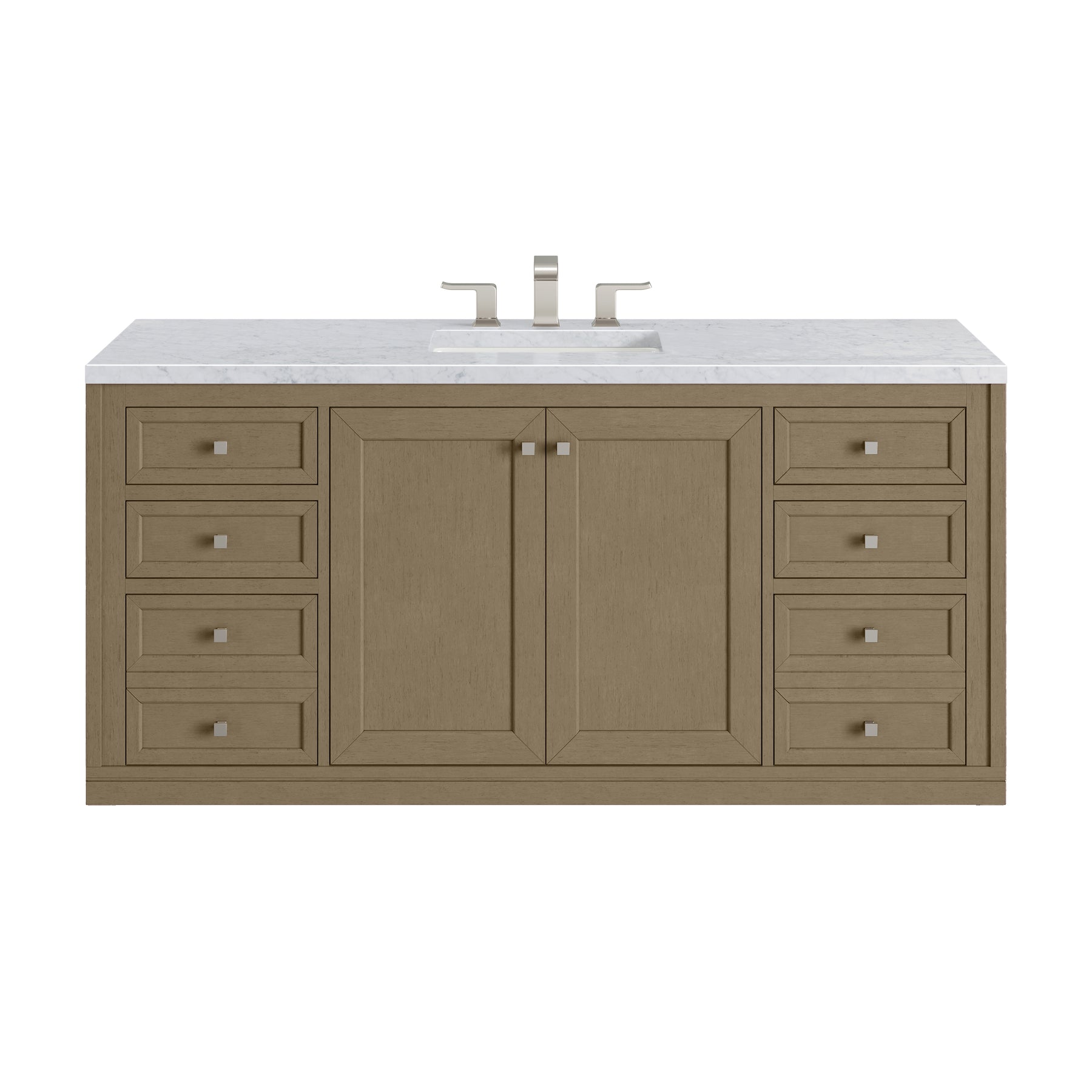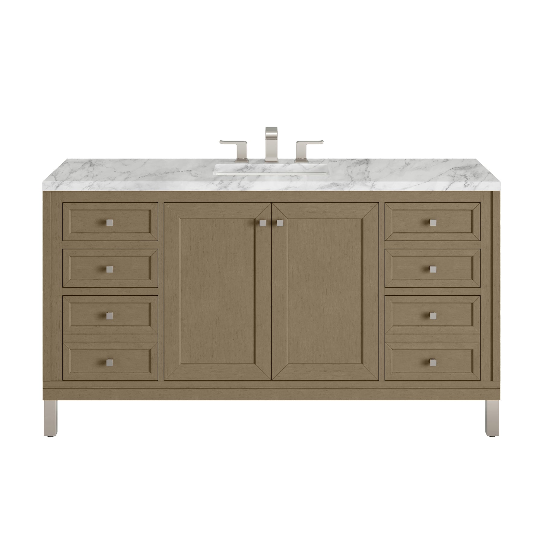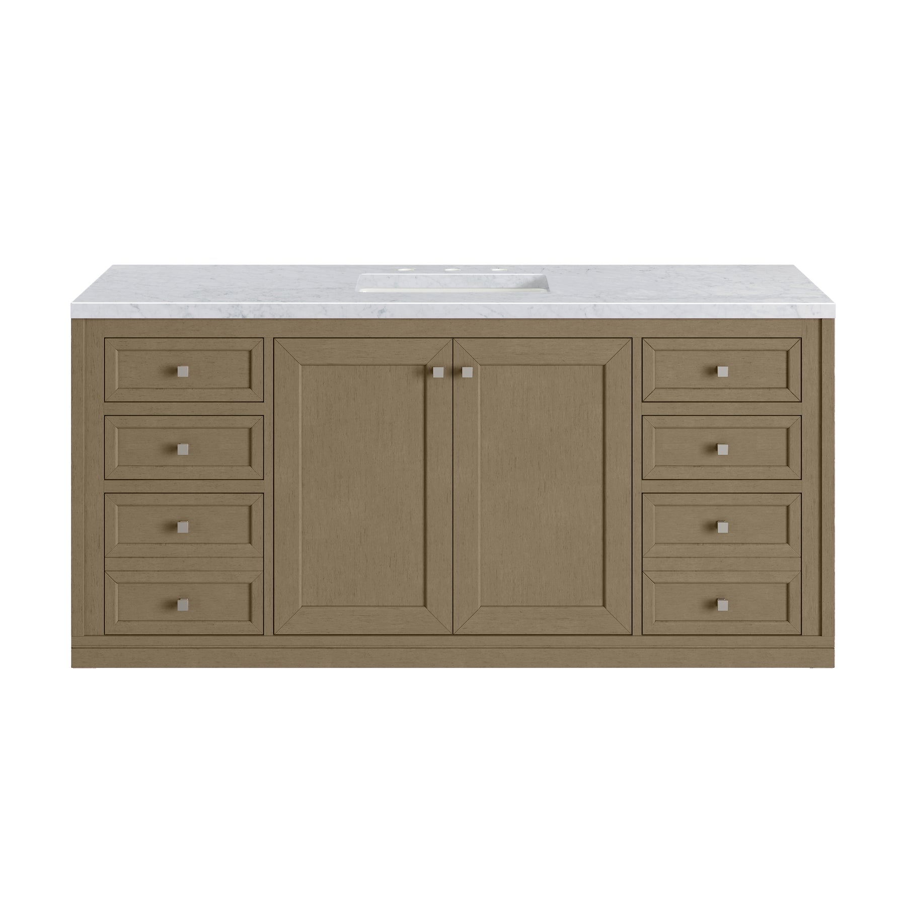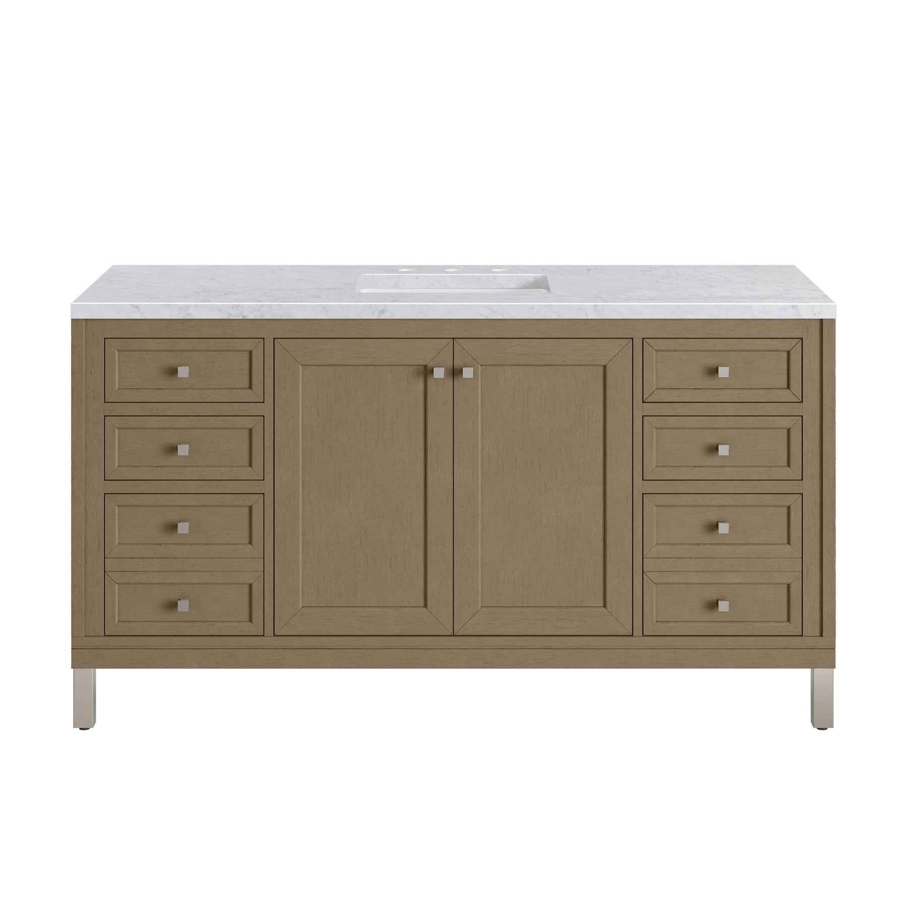 The sophisticated details and clean lines of the Chicago 60" Single Vanity by James Martin Vanities make it the perfect choice for any bathroom. Featuring a Walnut Whisper finish, this vanity offers ample storage with its double-door cabinet, adjustable interior shelves, and six drawers (four standard; two double-deep). Brushed Nickel knobs and legs add a contemporary touch; or choose to forego the metal legs for a modern wall-mounted installation. The addition of a Carrara White Marble top with undermount sink completes the look.