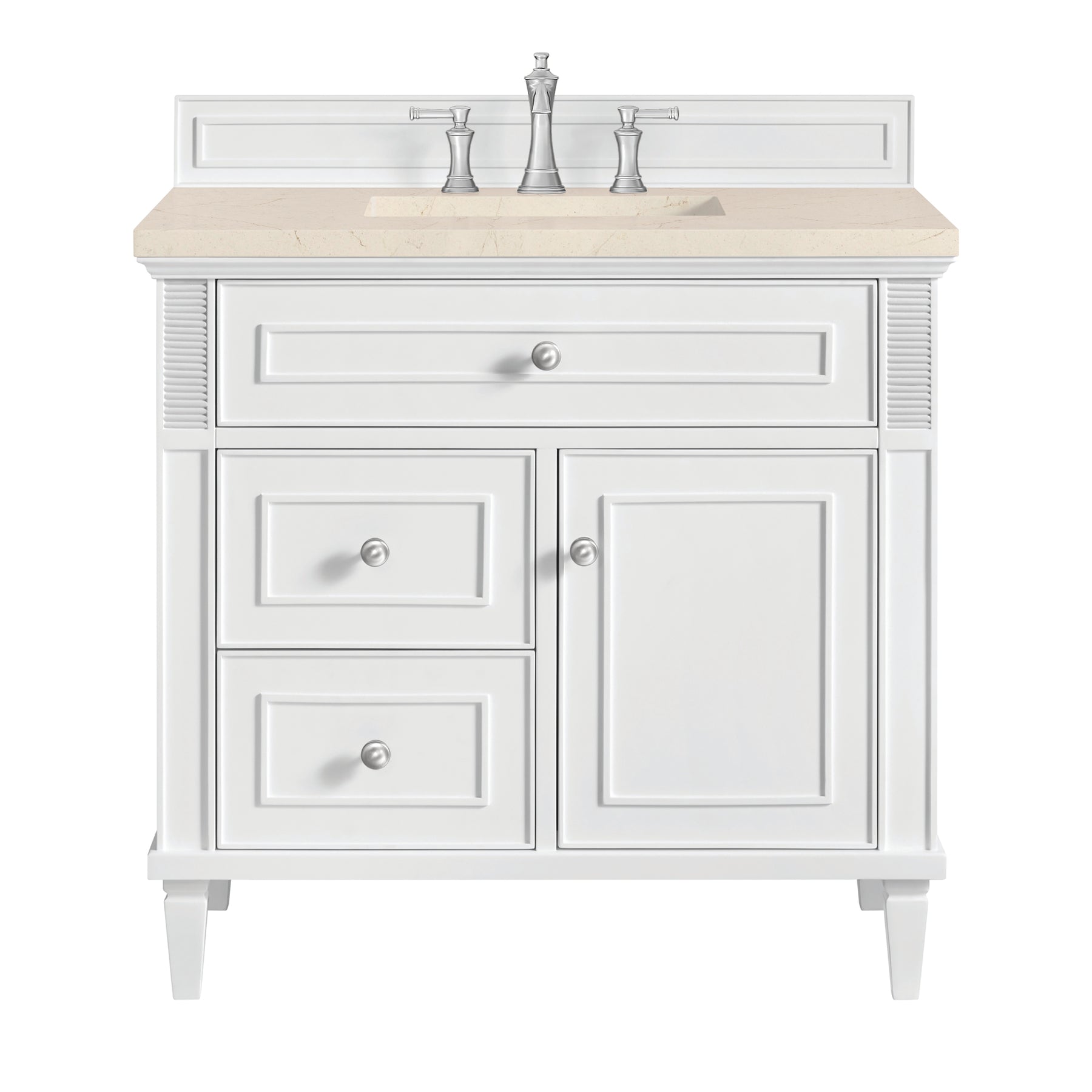The 36" Lorelai Single Vanity celebrates timeless form and exquisite finish details, combined with practical function. The sophisticated Bright White finish is accented by reeded details, and clean, raised picture frame molding. Coin-edge knobs in Satin Nickel provide the perfect accent. This single-door cabinet opens to a spacious interior with a single shelf and a convenient USB/Electric power outlet. Two drawers and an upper tip-out drawer offer additional storage space. The Eternal Marfil Silestone top by Cosentino incorporates classic, warm tones. Finally, an undermount rectangular sink completes this striking look.