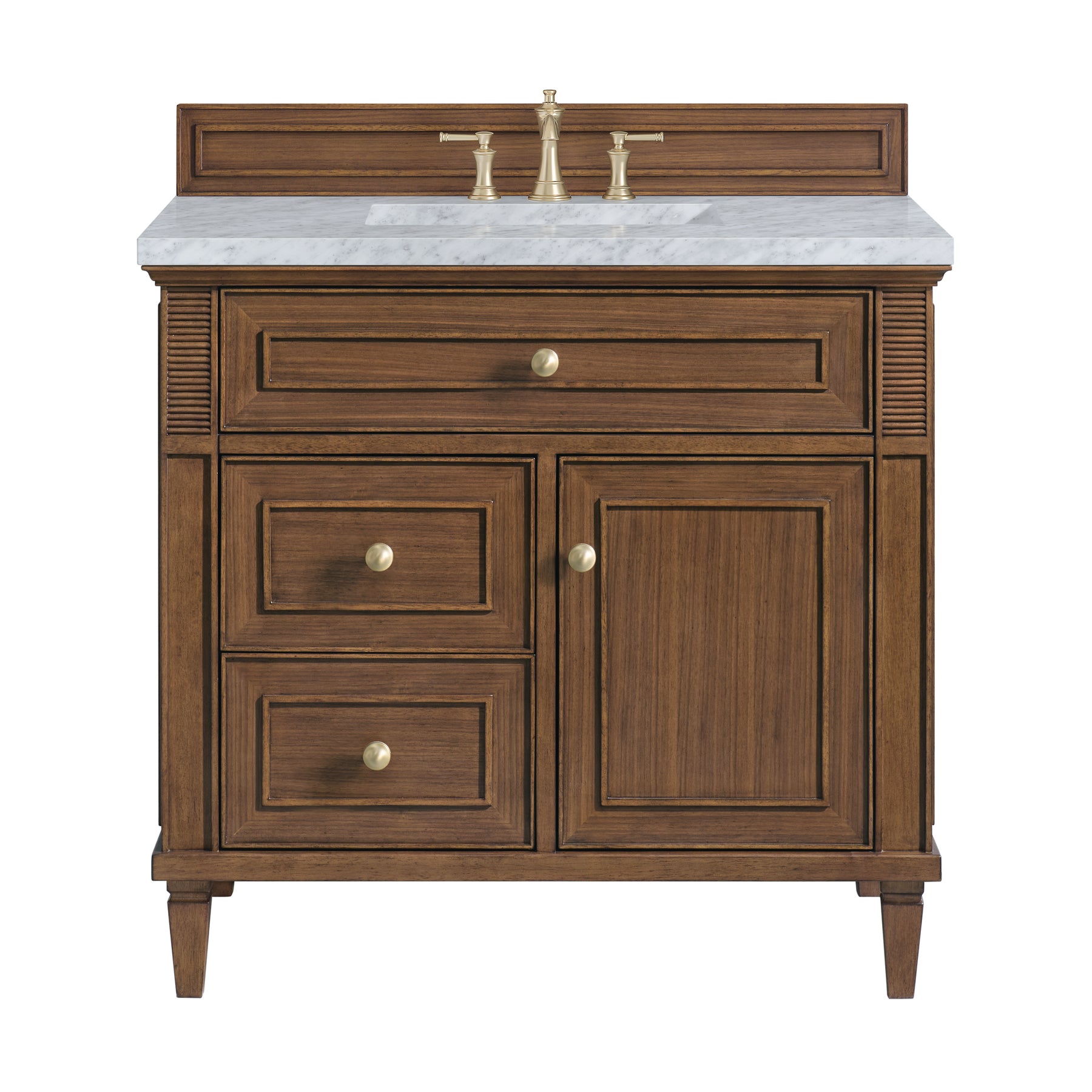 The 36" Lorelai Single Vanity celebrates timeless form and exquisite finish details, combined with practical function. The beauty of the natural grains in the walnut veneer is accented by reeded details, and clean, raised picture frame molding. The decorative, coin-edge knobs in Champagne Brass provide the perfect complement to the Mid-Century Walnut finish. This single-door cabinet opens to a spacious interior with a single shelf and a convenient USB/Electric power outlet. Two drawers and an upper tip-out drawer offer additional storage space. Completing this vanity, are the treasured, neutral tones and textures of the Carrara marble vanity top display a white background with delicate grey veining.