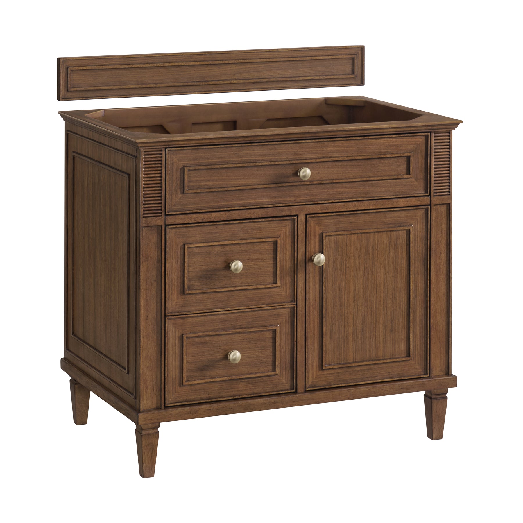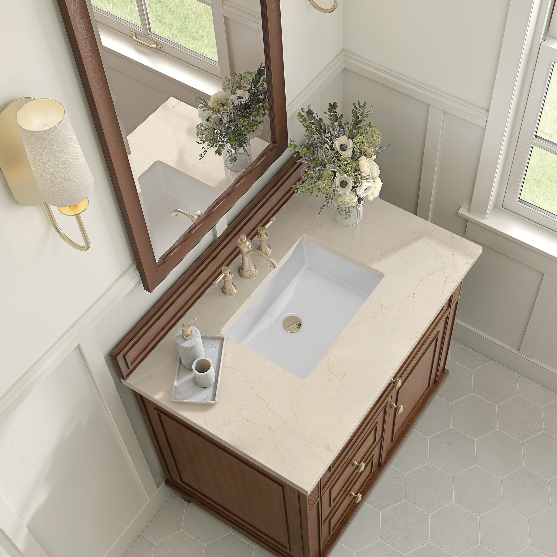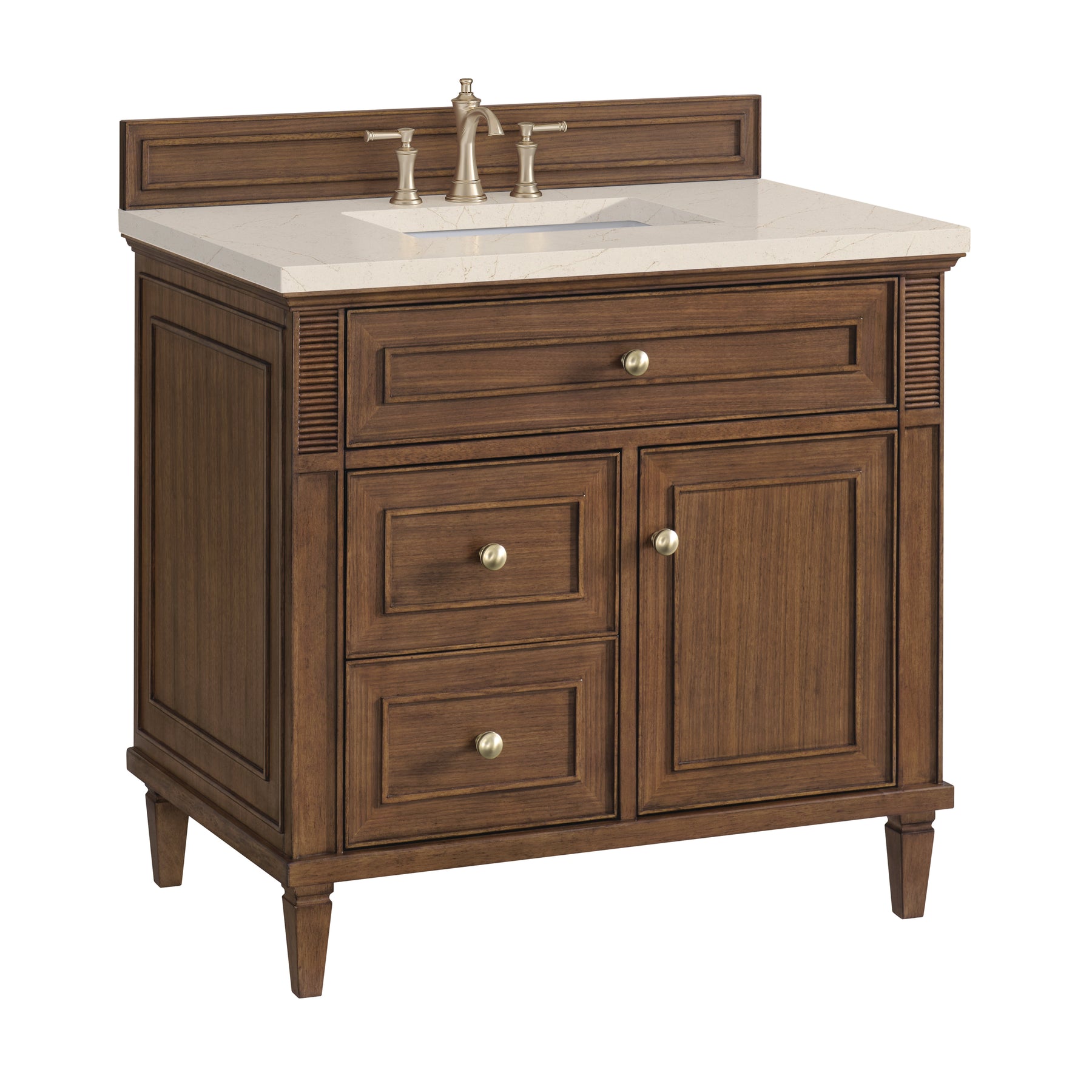 The 36" Lorelai Single Vanity celebrates timeless form and exquisite finish details, combined with practical function. The beauty of the natural grains in the walnut veneer is accented by reeded details, and clean, raised picture frame molding. The decorative, coin-edge knobs in Champagne Brass provide the perfect complement to the Mid-Century Walnut finish. This single-door cabinet opens to a spacious interior with a single shelf and a convenient USB/Electric power outlet. Two drawers and an upper tip-out drawer offer additional storage space. The Eternal Marfil Silestone top by Cosentino incorporates classic, warm tones. Finally, an undermount rectangular sink completes this striking look.