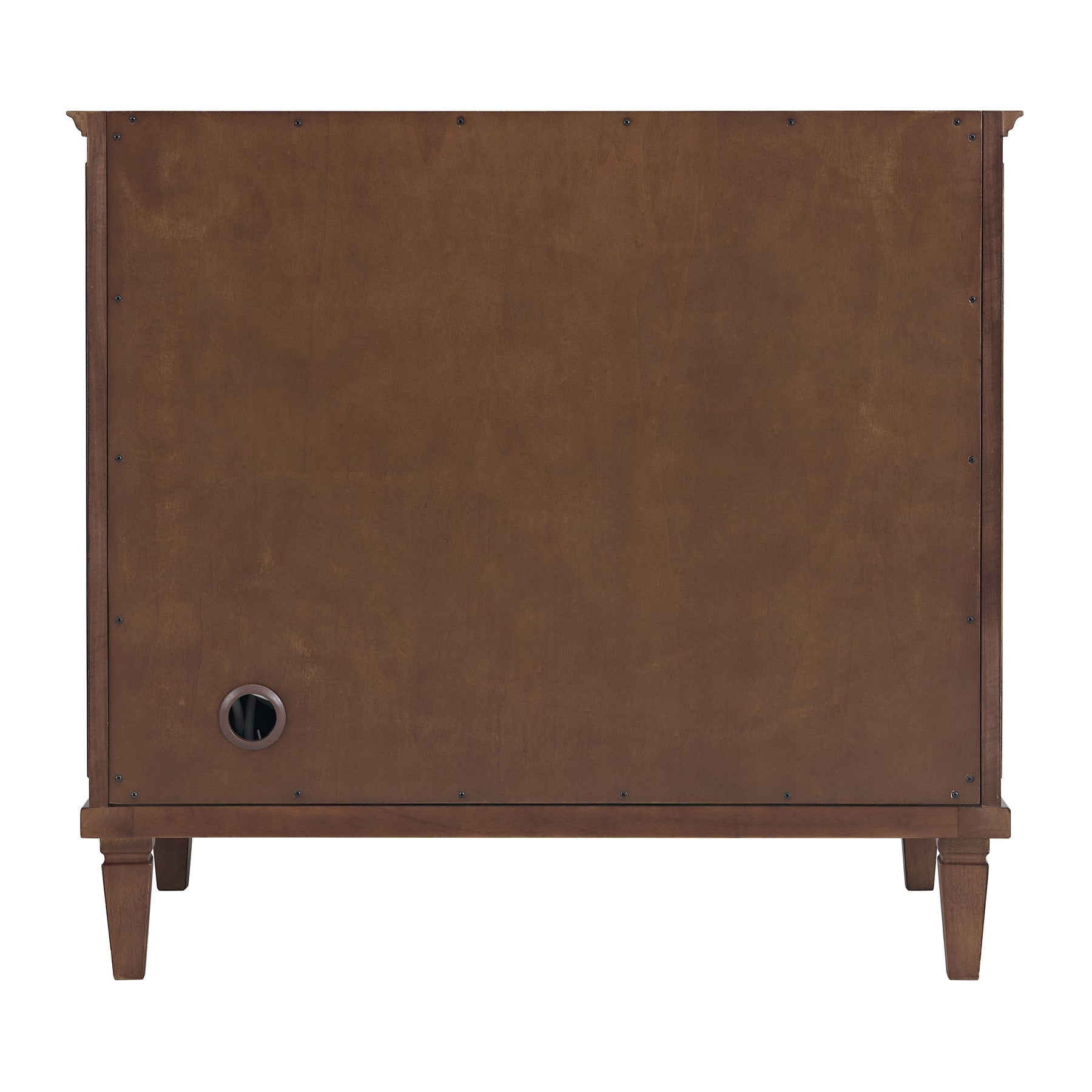 The 36" Lorelai Single Vanity celebrates timeless form and exquisite finish details, combined with practical function. The beauty of the natural grains in the walnut veneer is accented by reeded details, and clean, raised picture frame molding. The decorative, coin-edge knobs in Champagne Brass provide the perfect complement to the Mid-Century Walnut finish. This single-door cabinet opens to a spacious interior with a single shelf and a convenient USB/Electric power outlet. Two drawers and an upper tip-out drawer offer additional storage space. The Lime Delight Silestone top lends warm, textured beige tones to perfectly complement the wood finish on the vanity.